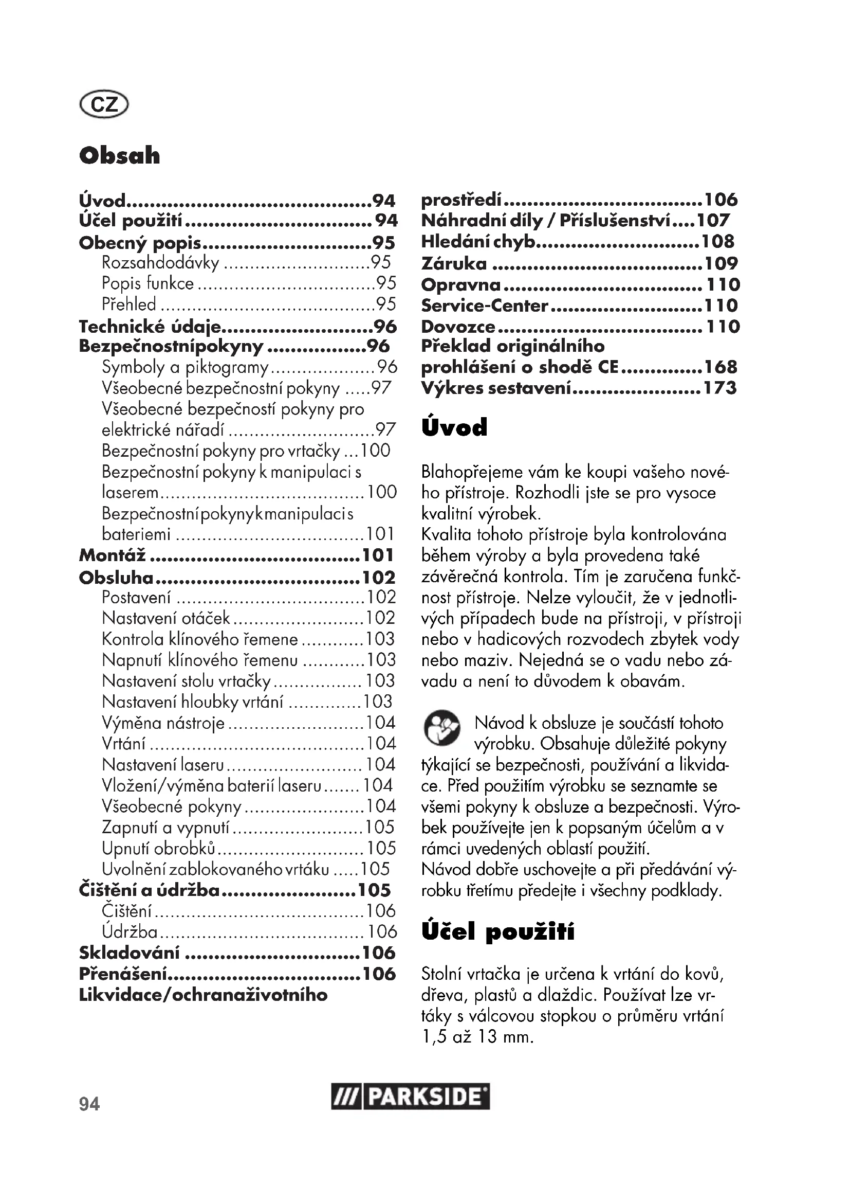 - Bezpečnostní pokyny pro vrtačky p. 100
