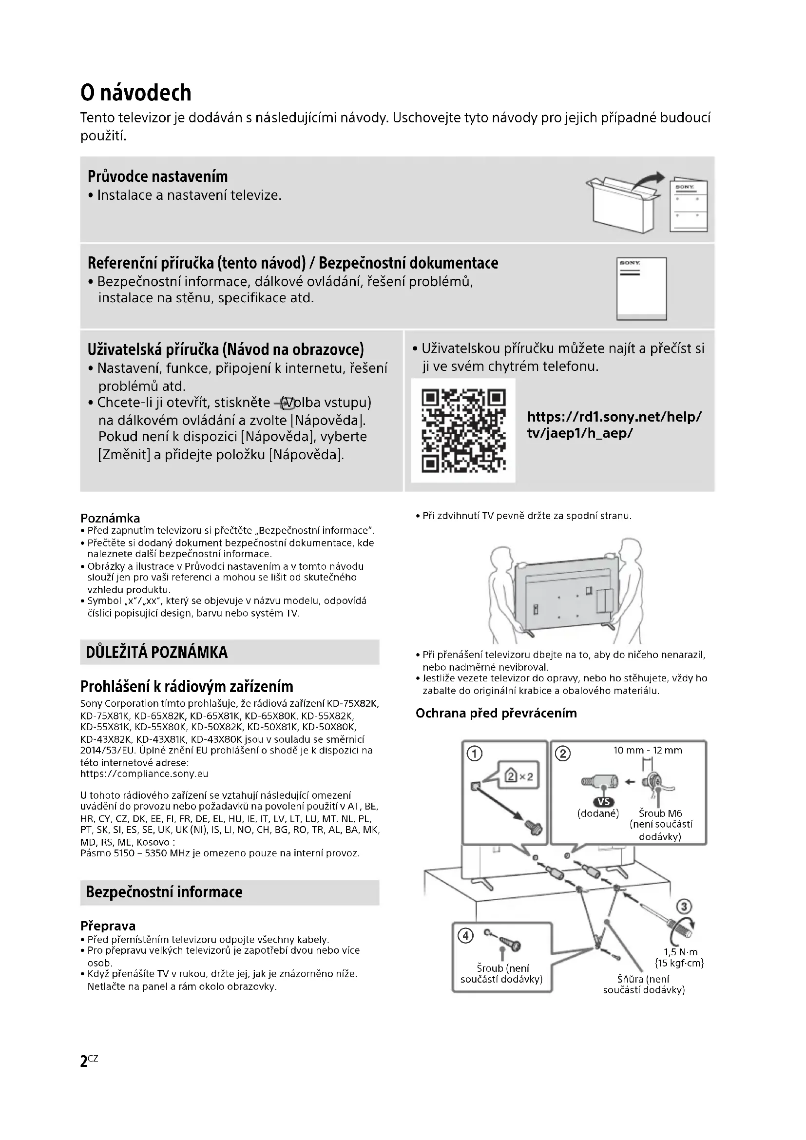 - Před zapnutím televizoru si přečtěte „Bezpečnostní informace“.• Přečtěte si dodaný dokument bezpečnostní dokumentace, kde naleznete další bezpečnostní informace. • Obrázky a ilustrace v Průvodci nastavením a v tomto návodu slouží jen pro vaši referenci a mohou se lišit od skutečného vzhledu produktu.• Symbol „x“/„xx“, který se objevuje v názvu modelu, odpovídá číslici popisující design, barvu nebo systém TV. Prohlášení k rádiovým zařízením Sony Corporation tímto prohlašuje, že rádiová zařízení KD-75X82K, KD-75X81K, KD-65X82K, KD-65X81K, KD-65X80K, KD-55X82K, KD-55X81K, KD-55X80K, KD-50X82K, KD-50X81K, KD-50X80K, KD-43X82K, KD-43X81K, KD-43X80K jsou v souladu se směrnicí 2014/53/EU. Úplné znění EU prohlášení o shodě je k dispozici na této internetové adrese: https://compliance.sony.euU tohoto rádiového zařízení se vztahují následující omezení uvádění do provozu nebo požadavků na povolení použití v AT, BE, HR, CY, CZ, DK, EE, FI, FR, DE, EL, HU, IE, IT, LV, LT, LU, MT, NL, PL, PT, SK, SI, ES, SE, UK, UK (NI), IS, LI, NO, CH, BG, RO, TR, AL, BA, MK, MD, RS, ME, Kosovo :Pásmo 5150 – 5350 MHz je omezeno pouze na interní provoz. Přeprava