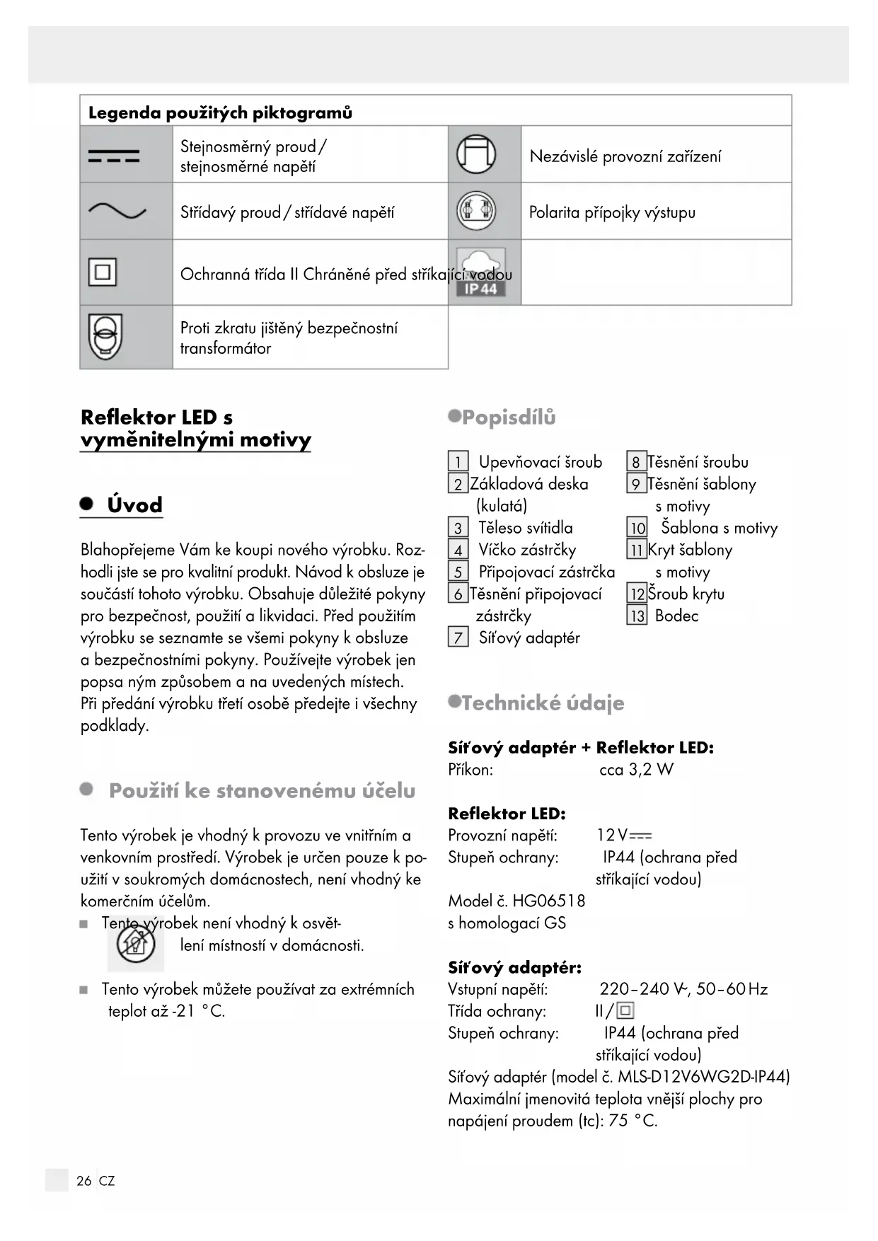 , 50–60 Hz Třída ochrany: II / Stupeň ochrany: IP44 (ochrana před stříkající vodou) Síťový adaptér (model č. MLS-D12V6WG2D-IP44) Maximální jmenovitá teplota vnější plochy pro napájení proudem (tc): 75 °C.27 CZ Obsah dodávky 1 reflektor LED s vyměnitelnými motivy 1 síťový adaptér 1 bodec se šroubem 1 základová deska (kulatá) 6 šablon s motivy 1 návod kobsluze Bezpečnostní pokyny