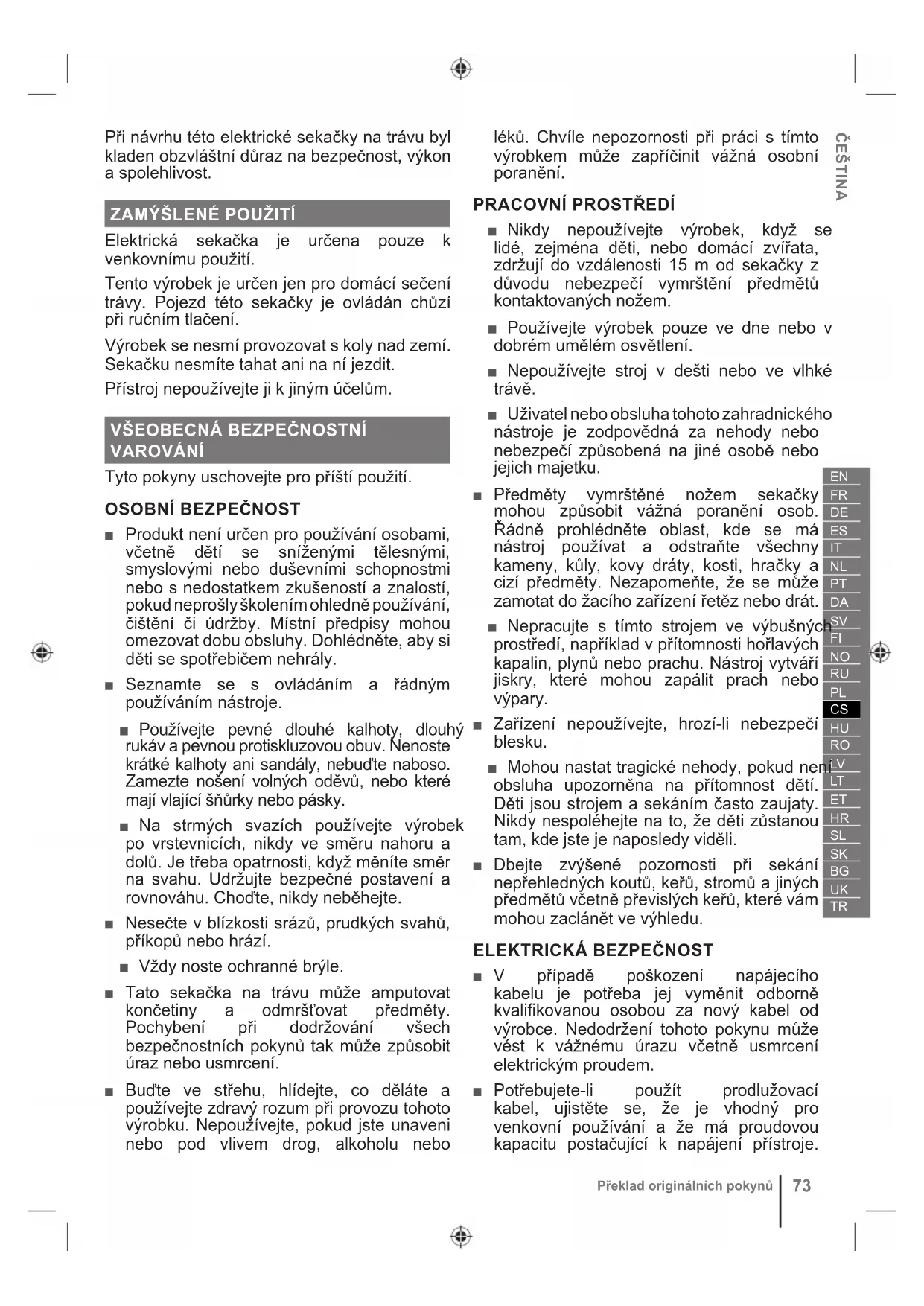 Před používáním výrobku se obeznamte se všemi pokyny. Dbejte na všechna upozornění a dodržujte bezpečnostní pokyny. Noste ochranu sluchu Noste ochranu očí Přístroj nepoužívejte při sklonu nad 15 °. Na strmých svazích sečte po vrstevnicích, nikdy ve směru nahoru a dolů. Nevystavujte dešti nebo nepoužívejte ve vlhkých podmínkách. Uvědomte si nebezpečí z ostrých nožů. Nože se otáčí i po vypnutí motoru. Před prováděním údržby nebo v případě poškozeného kabelu vypnout zařízení a odpojit zástrčku od síťového napájení. Dávejte pozor na odmrštěné nebo odletující předměty. V okruhu nejméně 15 m od pracovního prostoru se nesmí vyskytovat žádní přihlížející, zejména děti a zvířata.ČEŠTINA