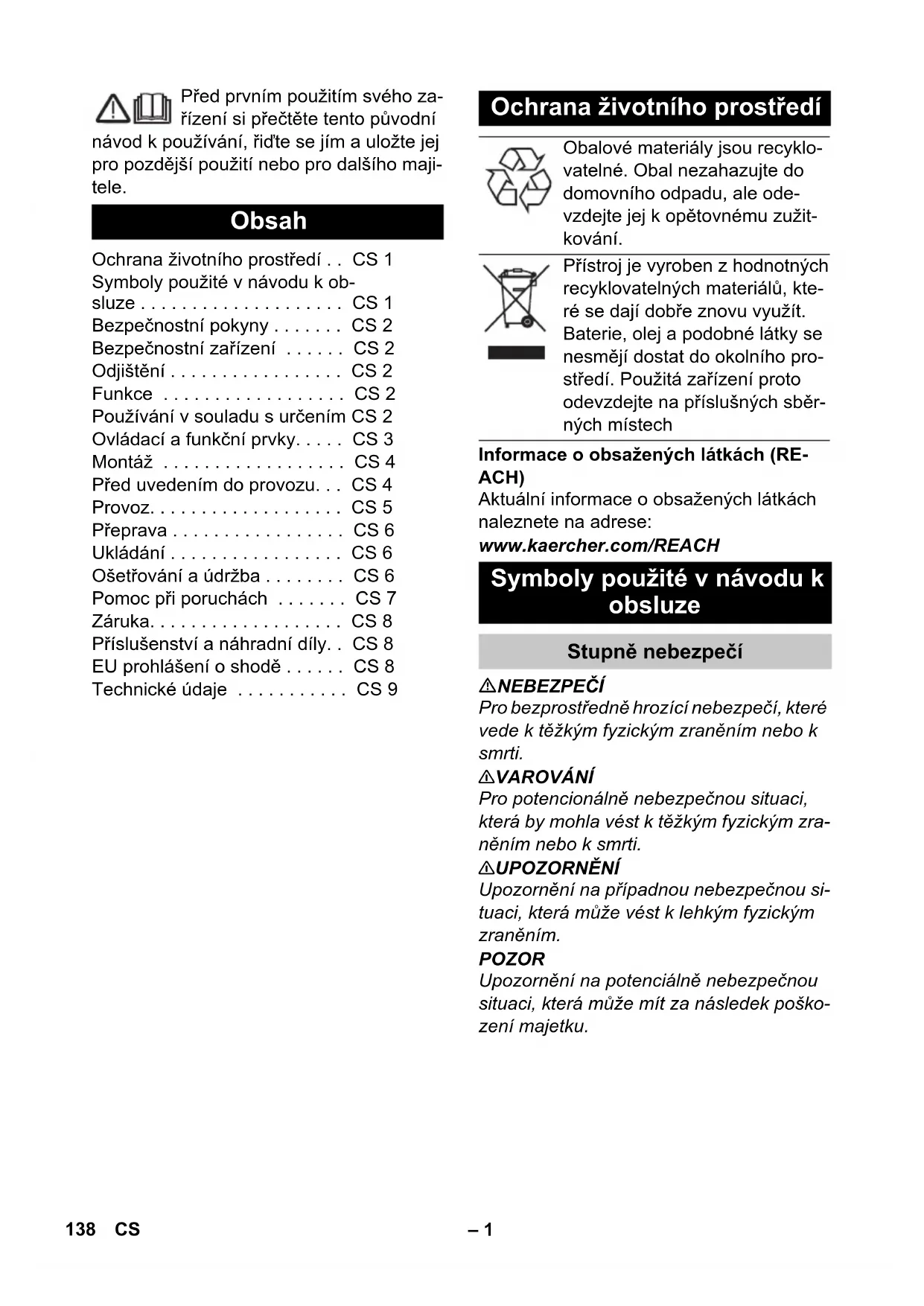 0,35 0,78 137HU– 1 Před prvním použitím svého za- řízení si přečtěte tento původní návod k používání, řiďte se jím a uložte jej pro pozdější použití nebo pro dalšího maji- tele. Informace o obsažených látkách (RE- ACH) Aktuální informace o obsažených látkách naleznete na adrese: www.kaercher.com/REACH NEBEZPEČÍ Pro bezprostředně hrozící nebezpečí, které vede k těžkým fyzickým zraněním nebo k smrti. 몇 VAROVÁNÍ Pro potencionálně nebezpečnou situaci, která by mohla vést k těžkým fyzickým zra- něním nebo k smrti. 몇 UPOZORNĚNÍ Upozornění na případnou nebezpečnou si- tuaci, která může vést k lehkým fyzickým zraněním. POZOR Upozornění na potenciálně nebezpečnou situaci, která může mít za následek poško- zení majetku. Obsah Ochrana životního prostředí . . CS 1 Symboly použité v návodu k ob- sluze . . . . . . . . . . . . . . . . . . . . CS 1 Bezpečnostní pokyny . . . . . . . CS 2 Bezpečnostní zařízení . . . . . . CS 2 Odjištění . . . . . . . . . . . . . . . . . CS 2 Funkce . . . . . . . . . . . . . . . . . . CS 2 Používání v souladu s určením CS 2 Ovládací a funkční prvky. . . . . CS 3 Montáž . . . . . . . . . . . . . . . . . . CS 4 Před uvedením do provozu. . . CS 4 Provoz. . . . . . . . . . . . . . . . . . . CS 5 Přeprava . . . . . . . . . . . . . . . . . CS 6 Ukládání . . . . . . . . . . . . . . . . . CS 6 Ošetřování a údržba . . . . . . . . CS 6 Pomoc při poruchách . . . . . . . CS 7 Záruka. . . . . . . . . . . . . . . . . . . CS 8 Příslušenství a náhradní díly. . CS 8 EU prohlášení o shodě . . . . . . CS 8 Technické údaje . . . . . . . . . . . CS 9 Ochrana životního prostředí Obalové materiály jsou recyklo- vatelné. Obal nezahazujte do domovního odpadu, ale ode- vzdejte jej k opětovnému zužit- kování. Přístroj je vyroben z hodnotných recyklovatelných materiálů, kte- ré se dají dobře znovu využít. Baterie, olej a podobné látky se nesmějí dostat do okolního pro- středí. Použitá zařízení proto odevzdejte na příslušných sběr- ných místech Symboly použité v návodu k obsluze Stupně nebezpečí 138 CS– 2 Před prvním použitím přístroje si pečlivě přečtěte tento návod k obsluze a přilože- nou brožuru Bezpečnostní pokyny pro dis- kové jednokotoučové stroje č. 5.956-659 a řiďte se jimi. Bezpečnostní prvky slouží k ochraně uživa- tele a nesmí být uvedeny mimo provoz nebo obcházena jejich funkce. Zabraňuje neúmyslnému zapnutí zařízení. Zařízení se používá k leštění rovných pod- lah. Prach vznikající při leštění zachycuje vy- měnitelný papírový sáček. – Pracovní šířka 500 mm umožňuje efek- tivní použití. – Napájení ze sítě umožňuje vysoký vý- kon bez omezení pracovní doby. Přístroj používejte pouze v souladu s údaji v tomto návodu k obsluze. – Přístroj lze používat pouze k leštění hladkých podlah. – Pro přístroj se smí používat pouze origi- nální příslušenství a originální náhradní díly. – Přístroj není vhodný pro prostředí s ne- bezpečím exploze. – Toto zařízení je určeno jen k použití za- sucha a nesmí se používat nebo skla- dovat ve venkovním prostředí za vlh- kých podmínek. Bezpečnostní pokyny Bezpečnostní zařízení Odjištění Funkce Používání v souladu s určením 139CS– 3 1 Spínač vpravo 2 Páka nastavení sklonu 3 síťový kabel se zástrčkou 4 Zásuvka (pouze pro příslušenství povo- lené výrobcem přístroje) 5 Spínač vlevo 6 Odjištění vlevo 7 Kontrolka „Síťové napětí“ 8 Odjištění vpravo 9 Rukojeť 10 Kabelový hák, otočný 11 Konektor ovládacího vedení 12 Podtlaková přepážka Ovládací a funkční prvky