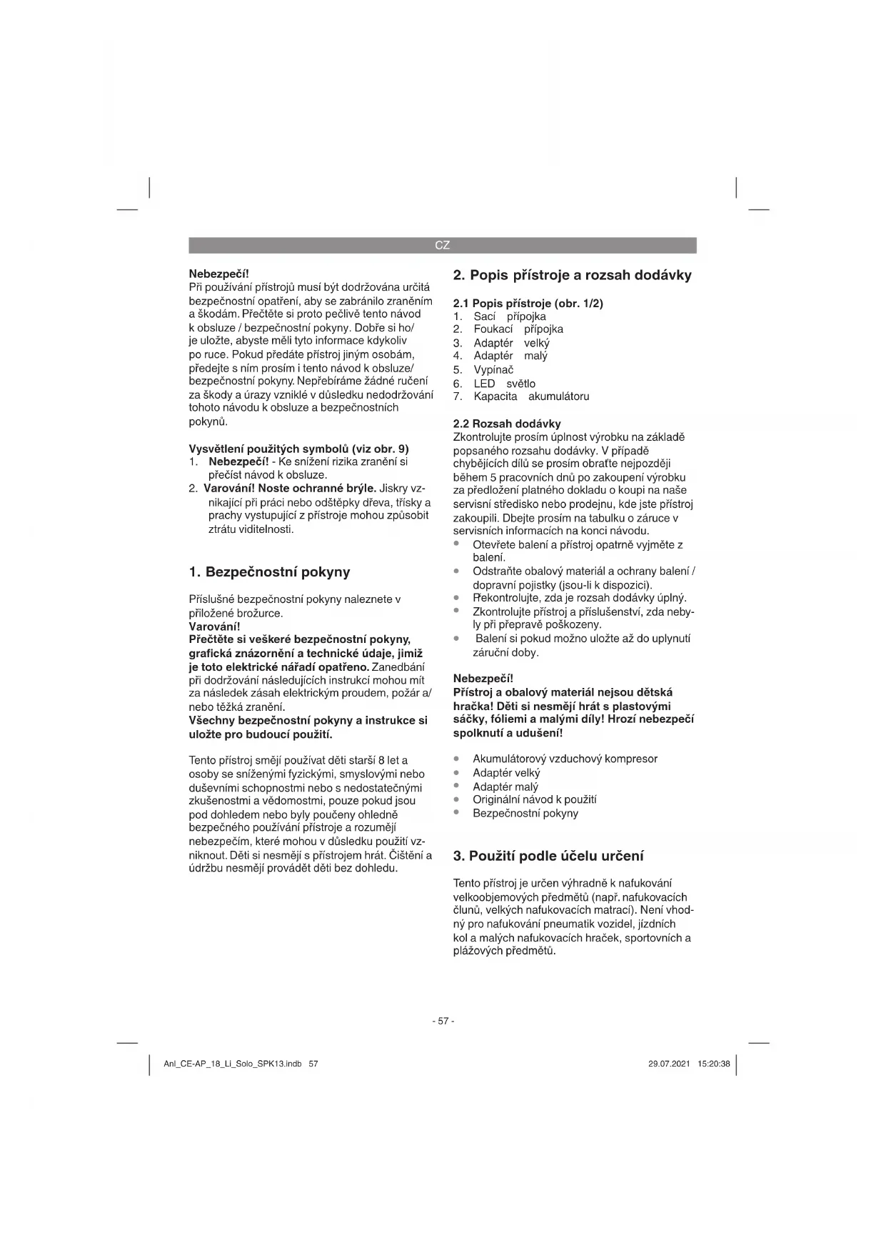 Tento přístroj je určen výhradně k nafukování velkoobjemových předmětů (např. nafukovacích člunů, velkých nafukovacích matrací). Není vhod- ný pro nafukování pneumatik vozidel, jízdních kol a malých nafukovacích hraček, sportovních a plážových předmětů. Anl_CE-AP_18_Li_Solo_SPK13.indb 57Anl_CE-AP_18_Li_Solo_SPK13.indb 57 29.07.2021 15:20:3829.07.2021 15:20:38CZ