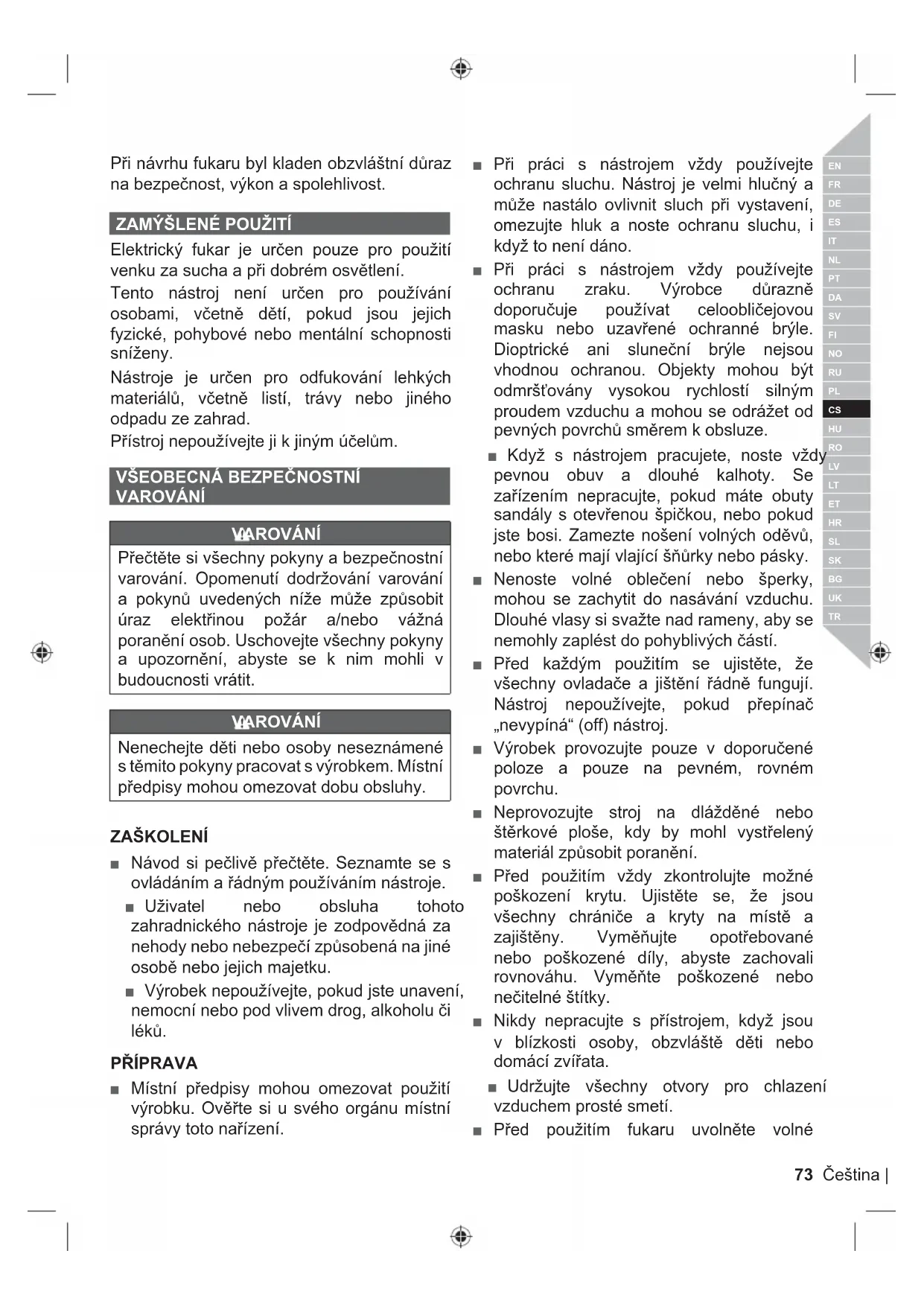 VAROVÁNÍ VAROVÁNÍ Přečtěte si všechny pokyny a bezpečnostní varování. Opomenutí dodržování varování a pokynů uvedených níže může způsobit úraz elektřinou požár a/nebo vážná poranění osob. Uschovejte všechny pokyny a upozornění, abyste se k nim mohli v budoucnosti vrátit. VAROVÁNÍ Nenechejte děti nebo osoby neseznámené s těmito pokyny pracovat s výrobkem. Místní předpisy mohou omezovat dobu obsluhy. ZAŠKOLENÍ ■ Návod si pečlivě přečtěte. Seznamte se s ovládáním a řádným používáním nástroje. ■ Uživatel nebo obsluha tohoto zahradnického nástroje je zodpovědná za nehody nebo nebezpečí způsobená na jiné osobě nebo jejich majetku. ■ Výrobek nepoužívejte, pokud jste unavení, nemocní nebo pod vlivem drog, alkoholu či léků. PŘÍPRAVA ■ Místní předpisy mohou omezovat použití výrobku. Ověřte si u svého orgánu místní správy toto nařízení. ■ Při práci s nástrojem vždy používejte ochranu sluchu. Nástroj je velmi hlučný a může nastálo ovlivnit sluch při vystavení, omezujte hluk a noste ochranu sluchu, i když to není dáno. ■ Při práci s nástrojem vždy používejte ochranu zraku. Výrobce důrazně doporučuje používat celoobličejovou masku nebo uzavřené ochranné brýle. Dioptrické ani sluneční brýle nejsou vhodnou ochranou. Objekty mohou být odmršťovány vysokou rychlostí silným proudem vzduchu a mohou se odrážet od pevných povrchů směrem k obsluze. ■ Když s nástrojem pracujete, noste vždy pevnou obuv a dlouhé kalhoty. Se zařízením nepracujte, pokud máte obuty sandály s otevřenou špičkou, nebo pokud jste bosi. Zamezte nošení volných oděvů, nebo které mají vlající šňůrky nebo pásky. ■ Nenoste volné oblečení nebo šperky, mohou se zachytit do nasávání vzduchu. Dlouhé vlasy si svažte nad rameny, aby se nemohly zaplést do pohyblivých částí. ■ Před každým použitím se ujistěte, že všechny ovladače a jištění řádně fungují. Nástroj nepoužívejte, pokud přepínač „nevypíná“ (off) nástroj. ■ Výrobek provozujte pouze v doporučené poloze a pouze na pevném, rovném povrchu. ■ Neprovozujte stroj na dlážděné nebo štěrkové ploše, kdy by mohl vystřelený materiál způsobit poranění. ■ Před použitím vždy zkontrolujte možné poškození krytu. Ujistěte se, že jsou všechny chrániče a kryty na místě a zajištěny. Vyměňujte opotřebované nebo poškozené díly, abyste zachovali rovnováhu. Vyměňte poškozené nebo nečitelné štítky. ■ Nikdy nepracujte s přístrojem, když jsou v blízkosti osoby, obzvláště děti nebo domácí zvířata. ■ Udržujte všechny otvory pro chlazení vzduchem prosté smetí. ■ Před použitím fukaru uvolněte volné74 | Čeština předměty pomocí hrábí a smetáku. ■ Před každým použitím si vyčistěte pracovní oblast. Odstraňte všechny předměty, například kameny, rozbité sklo, dráty nebo strunu, které se mohou vymrštit velmi silným proudem vzduchu. POUŽITÍ A PÉČE O NÁSTROJ NA BATERIE ■ Dobíjejte pouze nabíječkou určenou výrobcem. Nabíječka, která je vhodná pro jeden typ akumulátoru může způsobit nebezpečí požáru, pokud se používá s jiným bateriovým modulem. ■ Elektrický nástroj používejte pouze s přesně určeným bateriovým modulem. Použití jakéhokoliv jiného akumulátoru může způsobit nebezpečí poranění a požáru. ■ Pokud akumulátor nepoužíváte, uchovávejte jej mimo kovové předměty jako svorky pro papír, mince, klíče, hřebíky, šrouby nebo jiné malé kovové předměty, které mohou vytvořit propojení jednoho vývodu s druhým. Zkratování vývodů baterie může způsobit požár nebo popáleniny. ■ Za nevhodných podmínek může z baterie vytékat kapalina; zabraňte kontaktu. Pokud dojde k náhodnému kontaktu, omyjte vodou. Pokud kapalina přijde do kontaktu s očima, vyhledejte lékařskou pomoc. Kapalina vytečená z baterie způsobit podráždění nebo popáleniny. ■ Nepoužívejte baterie ani nástroj, který je poškozený nebo upravený. Poškozené nebo upravené baterie se mohou chovat nepředvídatelně a důsledkem může být požár, výbuch nebo riziko zranění. ■ Nevystavujte baterii ani nástroj ohni nebo příliš vysokým teplotám. Vystavení ohni nebo příliš vysokým teplotám převyšujícím 130°C může způsobit výbuch. ■ Postupujte podle všech pokynů k nabíjení a nenabíjejte baterie nebo nástroj mimo teplotní rozsah uvedený v pokynech. Nesprávné nabíjení nebo při teplotách mimo uvedený rozsah může poškodit baterii a zvýšit riziko požáru. POUŽITÍ ■ Nástroj používejte pouze ve vhodnou denní dobu - ne brzy ráno nebo pozdě večer, neboť lidé mohou být rušeni. ■ Nikdy nepoužívejte ve výbušném ovzduší. ■ Nepožívejte stroj při špatném počasí, zejména, hrozí-li bouřky. ■ Všechny přihlížející, zvláště děti a zvířata udržujte 15 m mimo pracovní oblasti. Zastavte výrobek, pokud někdo vstoupí do pracovního prostoru výrobku. ■ Neprovozujte při slabém osvětlení. Obsluha musí mít čistý výhled na pracovní oblast k identifikaci potenciálních nebezpečí. ■ Obsluha podobných nástrojů zvyšuje jak nebezpečí poranění sluchu, tak osob vstupujících do zóny práce. ■ Vždy na svazích zabezpečte své pevné postavení. Choďte, nikdy neběhejte. ■ Udržujte bezpečné postavení a rovnováhu. Nepřeceňujte se. Přeceňování může způsobit ztrátu rovnováhy. ■ Nikdy neprovozujte přístroj s poškozenými chrániči, nebo štíty, nebo bez nainstalovaných bezpečnostních zařízení. ■ Nástroj nijak neupravujte nebo nepoužívejte příslušenství, jež nejsou doporučena výrobcem. VAROVÁNÍ Pokud začne po pádu, silných nárazech nástroj nenormálně vibrovat, zastavte nástroj a ihne