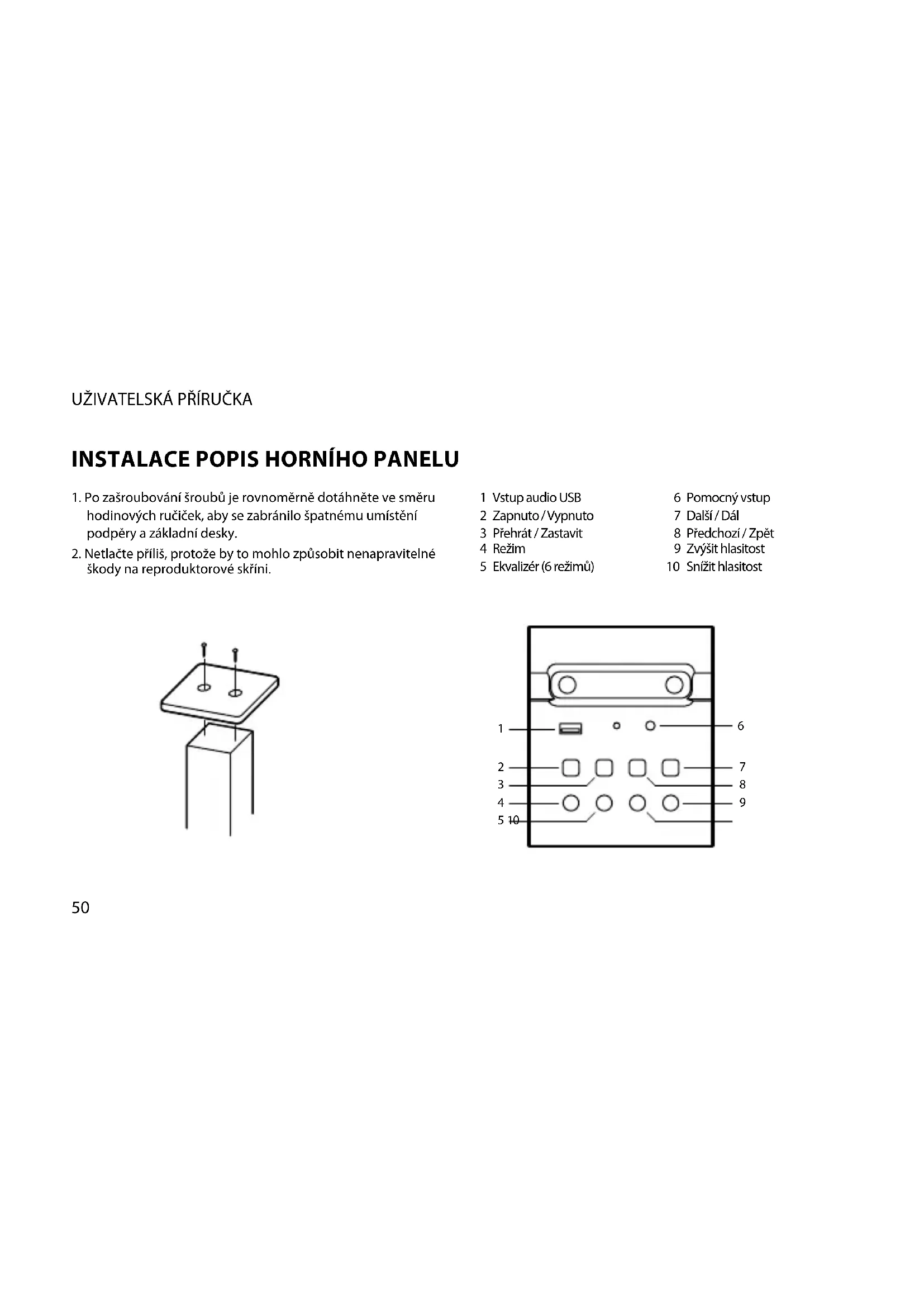 Vstup audio USB Zapnuto / Vypnuto Přehrát / Zastavit Režim Ekvalizér (6 režimů) Pomocný vstup Další / Dál Předchozí / Zpět Zvýšit hlasitost Snížit hlasitost