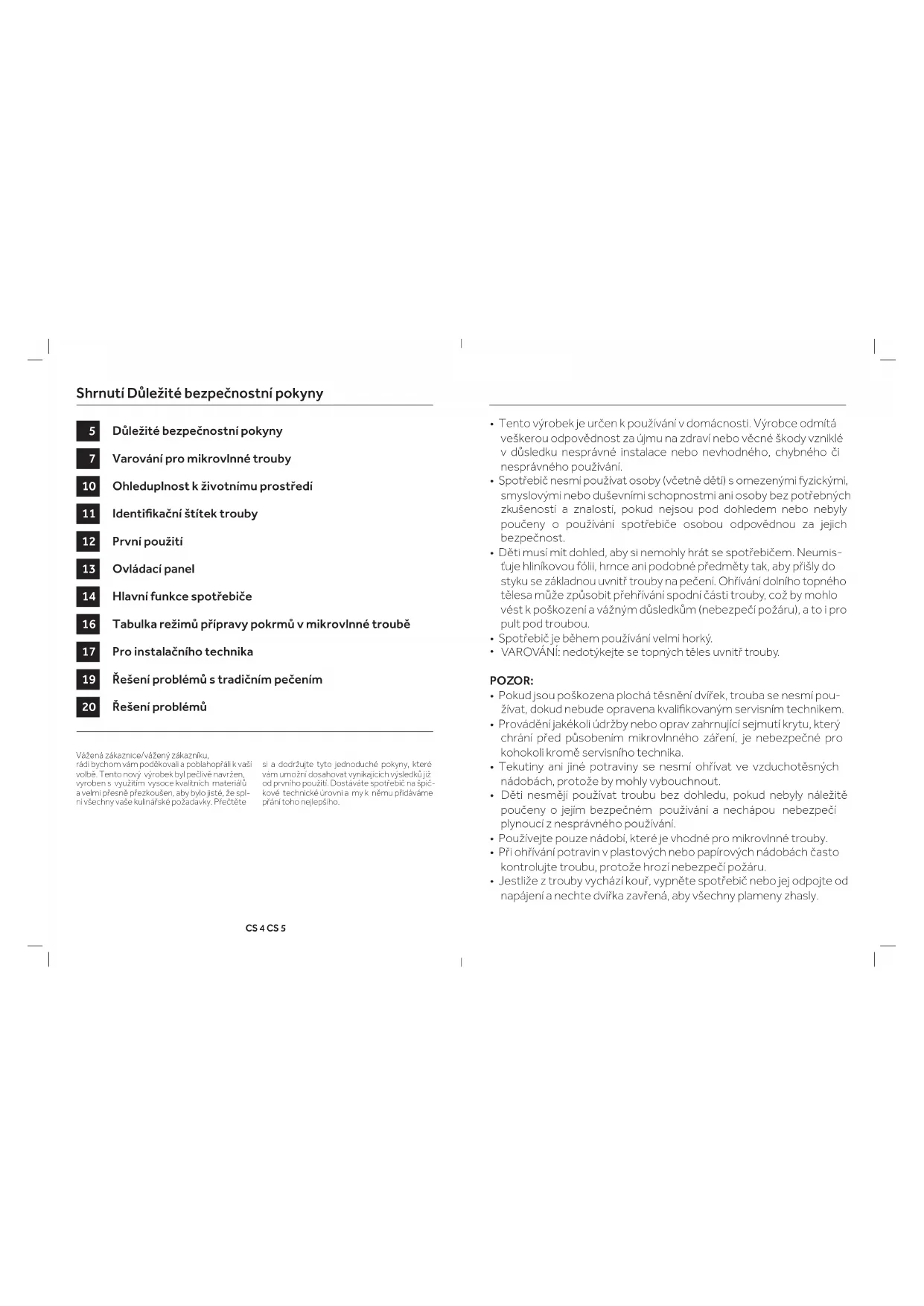 CANDY HOOVER GROUP Via Comolli 16 Brugherio – Italy User ManualUser Instructions OVENS 40EN Bedienungsanleitung ÖFEN 22DE Pokyny pro uživatele TROUBY 4CS Instrucciones de uso HORNOS 58ES Mode d’emploi FOURS 76FR Istruzioni per l'uso FORNI 94IT Instrukcje użytkownika PIEKARNIKI 112PL Instruções para o utilizador FORNOS 130PT Návod na použitie RÚRY 148SKCS 4 CS 5 Vážená zákaznice/vážený zákazníku, rádi bychom vám poděkovali a poblahopřáli k vaší volbě. Tento nový výrobek byl pečlivě navržen, vyroben s využitím vysoce kvalitních materiálů avelmi přesně přezkoušen, aby bylo jisté, že spl- ní všechny vaše kulinářské požadavky. Přečtěte si a dodržujte tyto jednoduché pokyny, které vám umožní dosahovat vynikajících výsledků již od prvního použití. Dostáváte spotřebič na špič- kové technické úrovni a my k němu přidáváme přání toho nejlepšího. Důležité bezpečnostní pokyny Varování pro mikrovlnné trouby Ohleduplnost k životnímu prostředí Identikační štítek trouby První použití Ovládací panel Hlavní funkce spotřebiče Tabulka režimů přípravy pokrmů v mikrovlnné troubě Pro instalačního technika Řešení problémů s tradičním pečením Řešení problémů