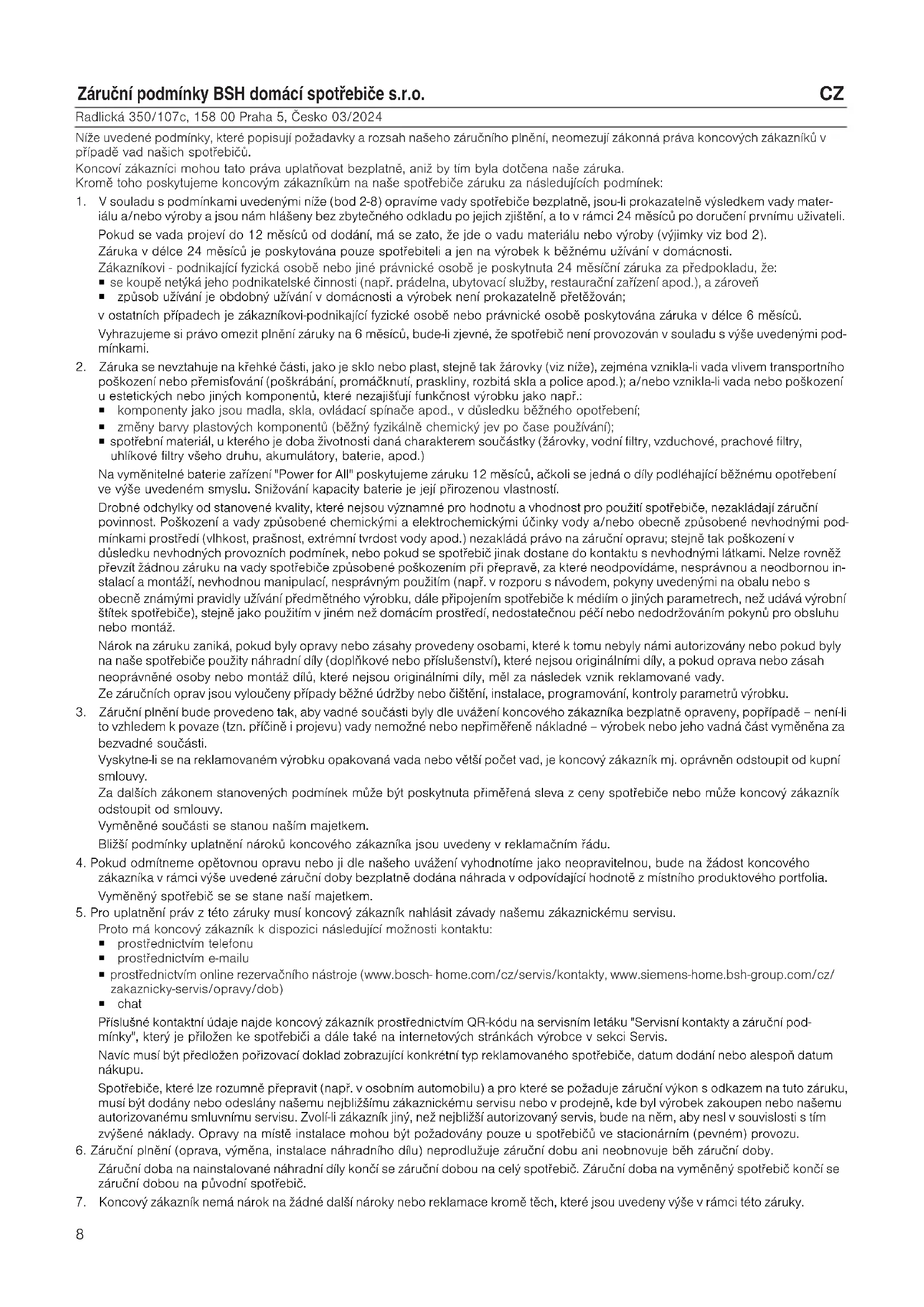 Radlická 350/107c, 158 00 Praha 5, Česko 03/2024 Níže uvedené podmínky, které popisují požadavky a rozsah našeho záručního plnění, neomezují zákonná práva koncových zákazníků v případě vad našich spotřebičů. Koncoví zákazníci mohou tato práva uplatňovat bezplatně, aniž by tím byla dotčena naše záruka. Kromě toho poskytujeme koncovým zákazníkům na naše spotřebiče záruku za následujících podmínek: 1. V souladu s podmínkami uvedenými níže (bod 2-8) opravíme vady spotřebiče bezplatně, jsou-li prokazatelně výsledkem vady mater- iálu a/nebo výroby a jsou nám hlášeny bez zbytečného odkladu po jejich zjištění, a to v rámci 24 měsíců po doručení prvnímu uživateli. Pokud se vada projeví do 12 měsíců od dodání, má se zato, že jde o vadu materiálu nebo výroby (výjimky viz bod 2). Záruka v délce 24 měsíců je poskytována pouze spotřebiteli a jen na výrobek k běžnému užívání v domácnosti. Zákazníkovi - podnikající fyzická osobě nebo jiné právnické osobě je poskytnuta 24 měsíční záruka za předpokladu, že: ¡ se koupě netýká jeho podnikatelské činnosti (např. prádelna, ubytovací služby, restaurační zařízení apod.), a zároveň ¡ způsob užívání je obdobný užívání v domácnosti a výrobek není prokazatelně přetěžován; v ostatních případech je zákazníkovi-podnikající fyzické osobě nebo právnické osobě poskytována záruka v délce 6 měsíců. Vyhrazujeme si právo omezit plnění záruky na 6 měsíců, bude-li zjevné, že spotřebič není provozován v souladu s výše uvedenými pod- mínkami. 2. Záruka se nevztahuje na křehké části, jako je sklo nebo plast, stejně tak žárovky (viz níže), zejména vznikla-li vada vlivem transportního poškození nebo přemisťování (poškrábání, promáčknutí, praskliny, rozbitá skla a police apod.); a/nebo vznikla-li vada nebo poškození u estetických nebo jiných komponentů, které nezajišťují funkčnost výrobku jako např.: ¡ komponenty jako jsou madla, skla, ovládací spínače apod., v důsledku běžného opotřebení; ¡ změny barvy plastových komponentů (běžný fyzikálně chemický jev po čase používání); ¡ spotřební materiál, u kterého je doba životnosti daná charakterem součástky (žárovky, vodní filtry, vzduchové, prachové filtry, uhlíkové filtry všeho druhu, akumulátory, baterie, apod.) Na vyměnitelné baterie zařízení "Power for All" poskytujeme záruku 12 měsíců, ačkoli se jedná o díly podléhající běžnému opotřebení ve výše uvedeném smyslu. Snižování kapacity baterie je její přirozenou vlastností. Drobné odchylky od stanovené kvality, které nejsou významné pro hodnotu a vhodnost pro použití spotřebiče, nezakládají záruční povinnost. Poškození a vady způsobené chemickými a elektrochemickými účinky vody a/nebo obecně způsobené nevhodnými pod- mínkami prostředí (vlhkost, prašnost, extrémní tvrdost vody apod.) nezakládá právo na záruční opravu; stejně tak poškození v důsledku nevhodných provozních podmínek, nebo pokud se spotřebič jinak dostane do kontaktu s nevhodnými látkami. Nelze rovněž převzít žádnou záruku na vady spotřebiče způsobené poškozením při přepravě, za které neodpovídáme, nesprávnou a neodbornou in- stalací a montáží, nevhodnou manipulací, nesprávným použitím (např. v rozporu s návodem, pokyny uvedenými na obalu nebo s obecně známými pravidly užívání předmětného výrobku, dále připojením spotřebiče k médiím o jiných parametrech, než udává výrobní štítek spotřebiče), stejně jako použitím v jiném než domácím prostředí, nedostatečnou péčí nebo nedodržováním pokynů pro obsluhu nebo montáž. Nárok na záruku zaniká, pokud byly opravy nebo zásahy provedeny osobami, které k tomu nebyly námi autorizovány nebo pokud byly na naše spotřebiče použity náhradní díly (doplňkové nebo příslušenství), které nejsou originálními díly, a pokud oprava nebo zásah neoprávněné osoby nebo montáž dílů, které nejsou originálními díly, měl za následek vznik reklamované vady. Ze záručních oprav jsou vyloučeny případy běžné údržby nebo čištění, instalace, programování, kontroly parametrů výrobku. 3. Záruční plnění bude provedeno tak, aby vadné součásti byly dle uvážení koncového zákazníka bezplatně opraveny, popřípadě – není-li to vzhledem k povaze (tzn. příčině i projevu) vady nemožné nebo nepřiměřeně nákladné – výrobek nebo jeho vadná část vyměněna za bezvadné součásti. Vyskytne-li se na reklamovaném výrobku opakovaná vada nebo větší počet vad, je koncový zákazník mj. oprávněn odstoupit od kupní smlouvy. Za dalších zákonem stanovených podmínek může být poskytnuta přiměřená sleva z ceny spotřebiče nebo může koncový zákazník odstoupit od smlouvy. Vyměněné součásti se stanou naším majetkem. Bližší podmínky uplatnění nároků koncového zákazníka jsou uvedeny v reklamačním řádu.