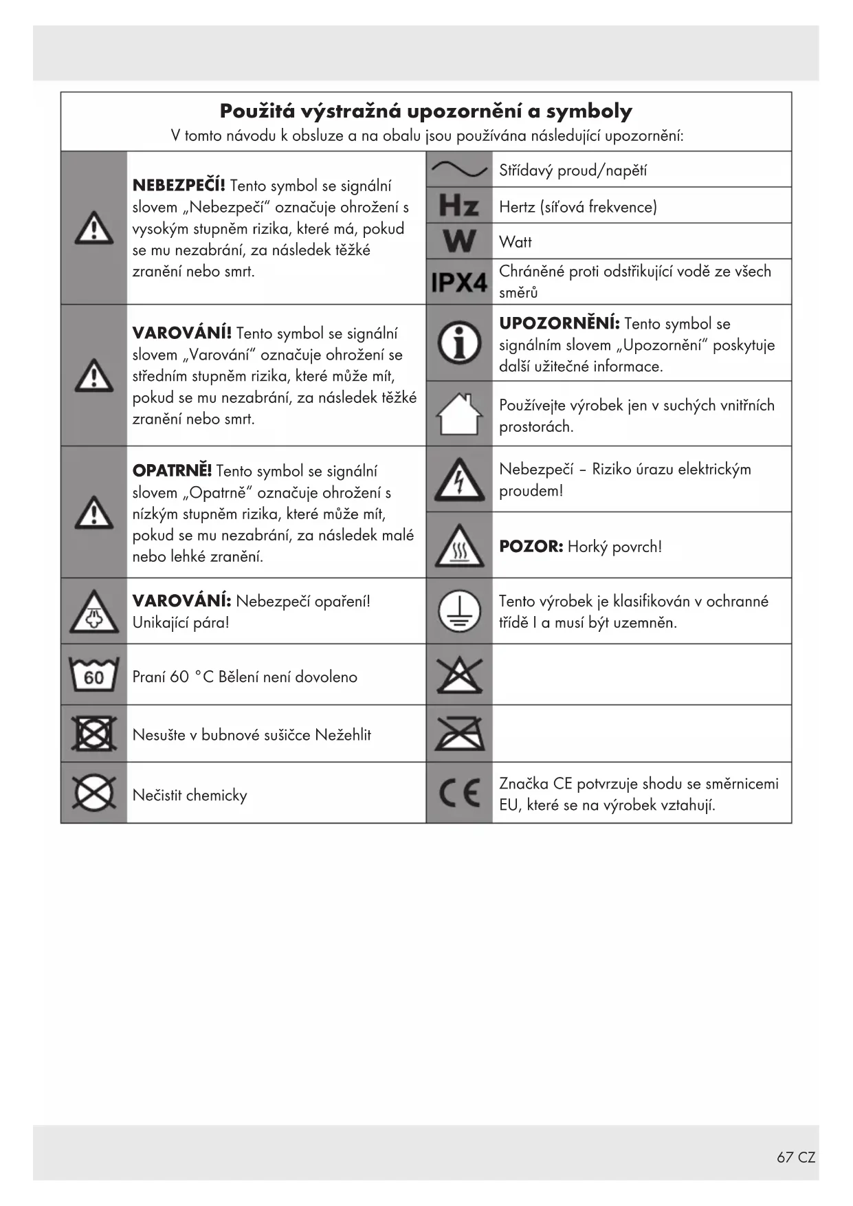 VAROVÁNÍ! Neponořujte elektrické části výrobku do vody nebo jiných kapalin. Nikdy výrobek nedržte pod tekoucí vodou. Otřete výrobek lehce navlhčeným hadříkem. Nedovolte, aby dovnitř výrobku pronikla voda nebo jiné kapaliny. K čištění výrobku a jeho příslušenství nepoužívejte žádné drsné, agresivní čisticí prostředky nebo tvrdé kartáče. Po čištění: Nechte všechny díly úplně uschnout. Čištění příslušenství Vyčistěte všechny díly v teplé mýdlové vodě. Po čištění: Nechte všechny díly příslušenství úplně uschnout.76 CZ Bavlněný povlak[] vyčistěte Bavlněný povlak[] může být prán při teplotě vody až 60°C. Po čištění: Nechte bavlněný povlak[] úplně uschnout. Můžete také použít sušičku při nízké teplotě (55°C). Odstranění usazenin vodního kamene Když se intenzita páry drasticky sníží, může být případně nezbytné odstranit usazeniny vodního kamene z nádržky na vodu[2]/příslušenství: Nádržka na vodu[2]: Vytáhněte síťovou zástrčku[7] ze zásuvky. Naplňte nádržku na vodu[2] směsí vody z vodovodu a octa (v poměru 2:1). Počkejte 24hodin. Vyprázdněte směs do umyvadla. Vypláchněte nádržku na vodu[2] čerstvou vodou (viz „Plnění vodní nádržky“). Příslušenství: Vytáhněte síťovou zástrčku[7] ze zásuvky. Naplňte nádržku na vodu[2] směsí vody z vodovodu a octa (v poměru 2:1). Nasaďte příslušenství, ze kterého chcete odstranit usazeniny vodního kamene. Zajistěte polohu výrobku, abyste se ujistili, že pára není namířena na okolní předměty a povrchy. Výrobek zapněte. Nechte výrobek do provozu, až se směs zcela spotřebuje. Skladování Pokud není výrobek používán, skladujte ho v originálním obalu. Uchovávejte výrobek a suchém místě mimo dosah dětí. Skladujte výrobek pouze s vyprázdněnou nádržkou na vodu[2]. Zlikvidování Obal se skládá z ekologických materiálů, které můžete zlikvidovat prostřednictvím místních sběren recyklovatelných materiálů. Při třídění odpadu se řiďte podle označení obalových materiálů zkratkami (a) a čísly (b), s následujícím významem: 1–7: umělé hmoty / 20–22: papír a lepenka / 80–98: složené látky. Výrobek a obalové materiály jsou recyklovatelné, zlikvidujte je odděleně pro lepší odstranění odpadu. Logo Triman platí jen pro Francii. O možnostech likvidace vysloužilých zařízení se informujte u správy vaší obce nebo města. V zájmu ochrany životního prostředí vysloužilý výrobek nevyhazujte do domovního odpadu, ale předejte k odborné likvidaci. O sběrnách a jejich otevíracích hodinách se můžete informovat u příslušné správy města nebo obce.77 CZ Záruka Výrobek byl vyroben s nejvyšší pečlivostí podle přísných kvalitativních směrnic a před odesláním prošel výstupní kontrolou. V případě závad máte možnost uplatnění zákonných práv vůči prodejci. Vaše práva ze zákona nejsou omezena naší níže uvedenou zárukou. Na tento artikl platí 3 záruka od data zakoupení. Záruční lhůta začíná od data zakoupení. Uschovejte si dobře originál pokladní stvrzenky. Tuto stvrzenku budete potřebovat jako doklad o zakoupení. Pokud se do 3 let od data zakoupení tohoto výrobku vyskytne vada materiálu nebo výrobní vada, výrobek Vám – dle našeho rozhodnutí – bezplatně opravíme nebo vyměníme. Tato záruka zaniká, jestliže se výrobek poškodí, neodborně použil nebo neobdržel pravidelnou údržbu. Záruka platí na vady materiálu a výrobní vady. Tato záruka se nevztahuje na díly výrobku podléhající opotřebení (např. na baterie), dále na poškození křehkých, choulostivých dílů, např. vypínačů, akumulátorů nebo dílů zhotovených ze skla. Postup v případě uplatňování záruky Pro zajištění rychlého zpracování Vašeho případu se řiďte následujícími pokyny: Pro všechny požadavky si připravte pokladní stvrzenku a číslo artiklu (např. IAN 375134_2104) jako doklad o zakoupení. Číslo artiklu najdete na typovém štítku, gravuře, titulní stránce návodu (vlevo dole) nebo na nálepce na zadní nebo spodní straně. V případě poruch funkce nebo jiných závad nejdříve kontaktujte, telefonicky nebo e-mailem, v následujícím textu uvedené servisní oddělení. Výrobek registrovaný jako vadný potom můžete s přiloženým dokladem o zakoupení (pokladní stvrzenkou) a údaji k závadě a kdy k ní došlo, bezplatně zaslat na adresu servisu, která Vám byla sdělena. Servis Servis Česká republika Tel.: 800600632 E-Mail: owim@lidl.cz78 SK Použité výstražné upozornenia a symboly ........................... Strana 79 Úvod........................................................................ Strana 80 Použitie v súlade s určením...................................................... Strana 80 Rozsah dodávky.............................................................. Strana 81 Popis súčiastok ............................................................... Strana 81 Technické údaje . . . . . . . . . . . . . . . . . . . . . . . . . . . . . . . . . . . . . . . . . . . . . . . . . . . . . . . . . . . . . . Strana 81 Bezpečnostné upozornenia ............................................. Strana 81 Pred prvým použitím..................................................... Strana 85 Príslušenstvo a možnosti použitia...................................... Strana 85 Montáž..................................................................... Strana 86 Obsluha .................................................................... Strana 86 Naplnenie nádrže na vodu ..................................................... Strana 86 Zapnutie/vypnutie ............................................................ Strana 86 Detská poistka .............................................