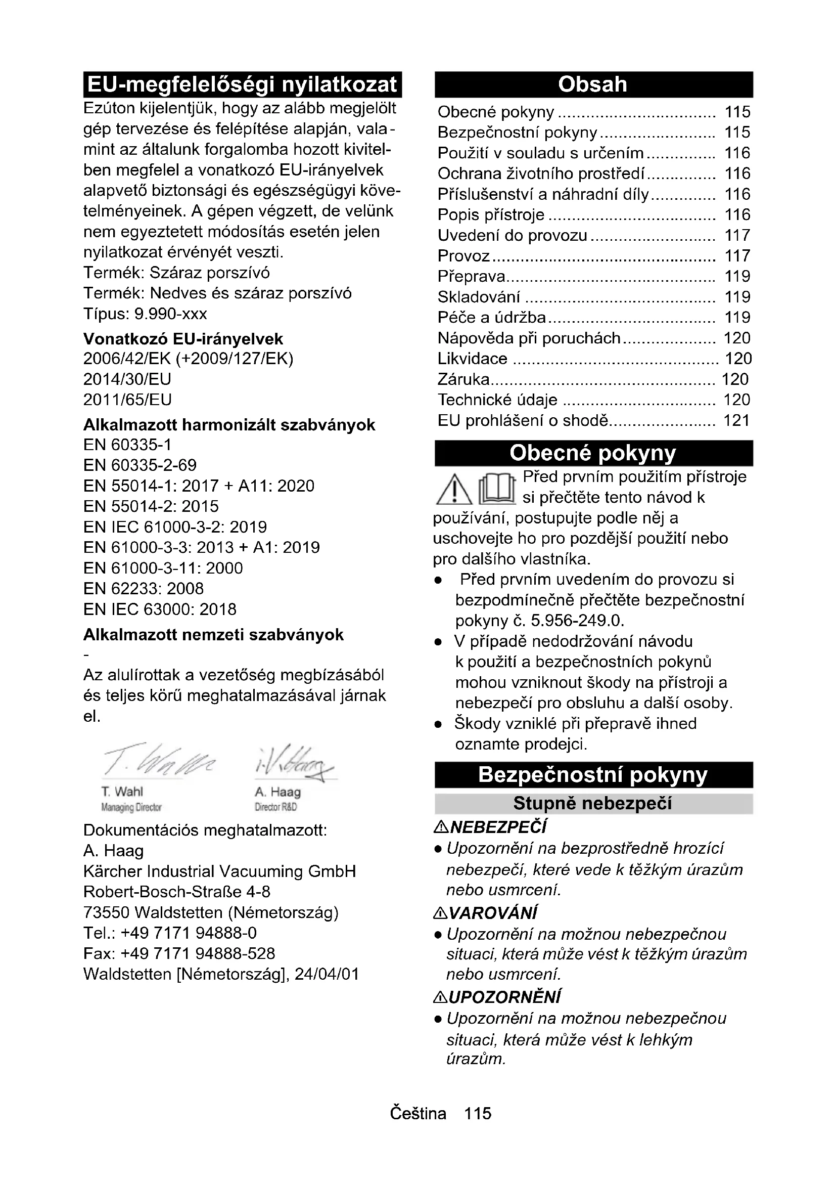 Az alulírottak a vezetőség megbízásából és teljes körű meghatalmazásával járnak el. Dokumentációs meghatalmazott: A. Haag Kärcher Industrial Vacuuming GmbH Robert-Bosch-Straße 4-8 73550 Waldstetten (Németország) Tel.: +49 7171 94888-0 Fax: +49 7171 94888-528 Waldstetten [Németország], 24/04/01 Obsah Obecné pokyny Před prvním použitím přístroje si přečtěte tento návod k používání, postupujte podle něj a uschovejte ho pro pozdější použití nebo pro dalšího vlastníka. ● Před prvním uvedením do provozu si bezpodmínečně přečtěte bezpečnostní pokyny č. 5.956-249.0. ● V případě nedodržování návodu