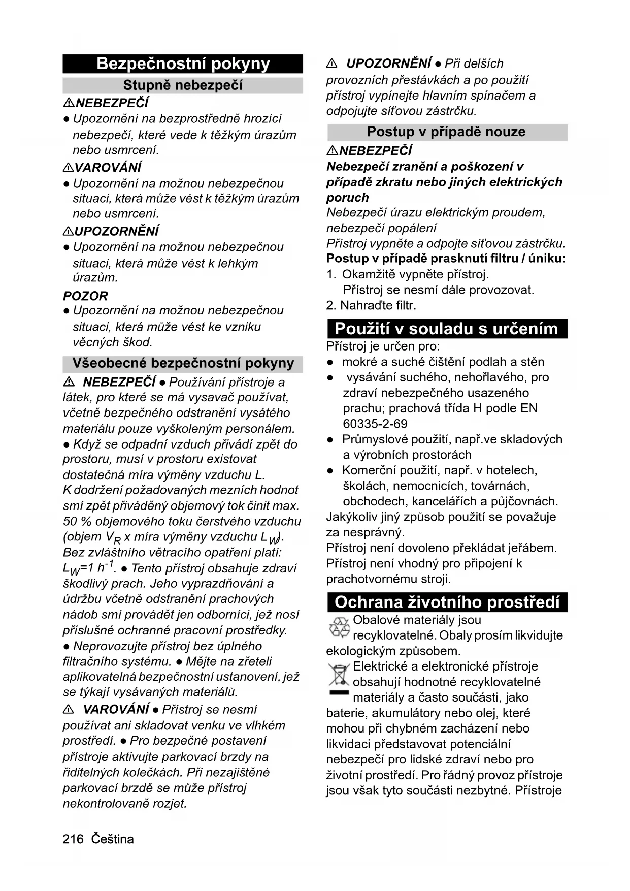 - EU prohlášení o shodě 16 Čeština Bezpečnostní pokyny Stupně nebezpečí NEBEZPEČÍ ● Upozornění na bezprostředně hrozící nebezpečí, které vede k těžkým úrazům nebo usmrcení. 몇 VAROVÁNÍ ● Upozornění na možnou nebezpečnou situaci, která může vést k těžkým úrazům nebo usmrcení. 몇 UPOZORNĚNÍ ● Upozornění na možnou nebezpečnou situaci, která může vést k lehkým úrazům. POZOR ● Upozornění na možnou nebezpečnou situaci, která může vést ke vzniku věcných škod. Všeobecné bezpečnostní pokyny NEBEZPEČÍ ● Používání přístroje a látek, pro které se má vysavač používat, včetně bezpečného odstranění vysátého materiálu pouze vyškoleným personálem. ● Když se odpadní vzduch přivádí zpět do prostoru, musí v prostoru existovat dostatečná míra výměny vzduchu L. K dodržení požadovaných mezních hodnot smí zpět přiváděný objemový tok činit max. 50 % objemového toku čerstvého vzduchu (objem V p. 2272