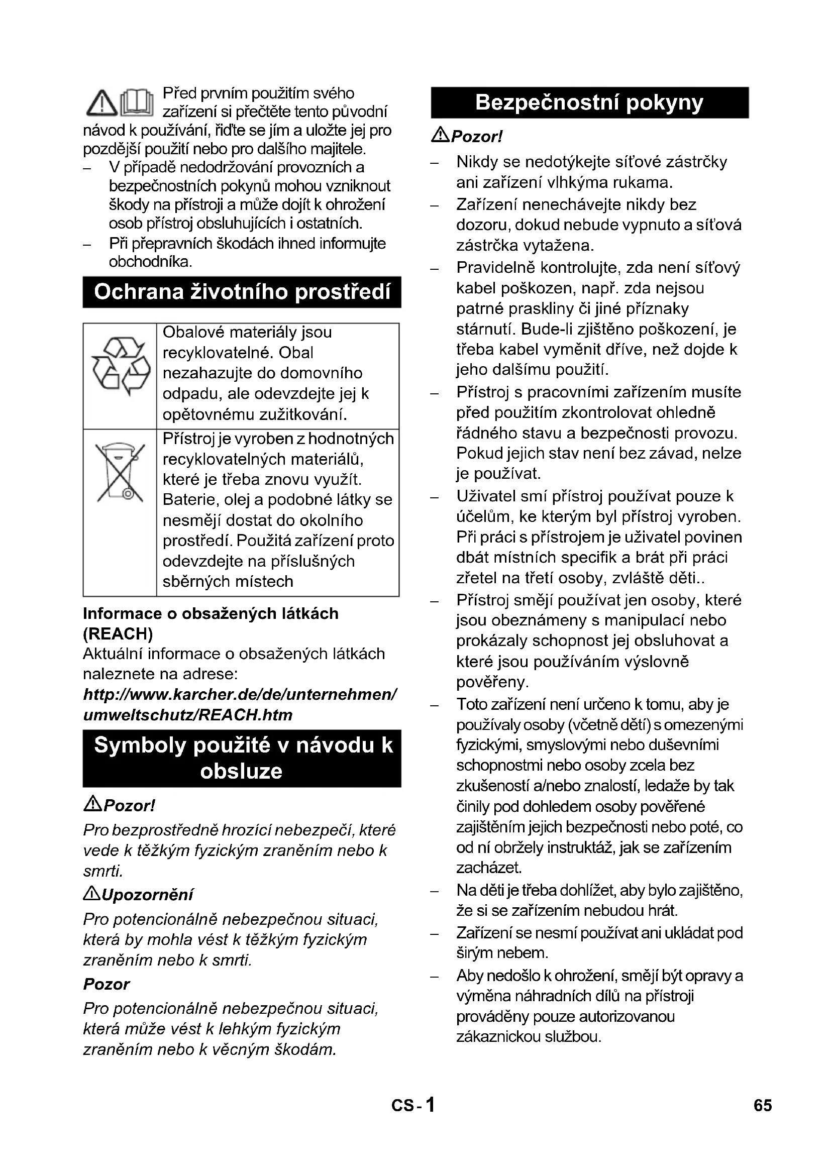 CEO Head of Approbation 64 HU- 1 Před prvním použitím svého zařízení si přečtěte tento původní návod k používání, řiďte se jím a uložte jej pro pozdější použití nebo pro dalšího majitele. – V případě nedodržování provozních a bezpečnostních pokynů mohou vzniknout škody na přístroji a může dojít k ohrožení osob přístroj obsluhujících i ostatních. – Při přepravních škodách ihned informujte obchodníka. Informace o obsažených látkách (REACH) Aktuální informace o obsažených látkách naleznete na adrese: http://www.karcher.de/de/unternehmen/ umweltschutz/REACH.htm Pozor! Pro bezprostředně hrozící nebezpečí, které vede k těžkým fyzickým zraněním nebo k smrti. 몇 Upozornění Pro potencionálně nebezpečnou situaci, která by mohla vést k těžkým fyzickým zraněním nebo k smrti. Pozor Pro potencionálně nebezpečnou situaci, která může vést k lehkým fyzickým zraněním nebo k věcným škodám. Pozor! – Nikdy se nedotýkejte síťové zástrčky ani zařízení vlhkýma rukama. – Zařízení nenechávejte nikdy bez dozoru, dokud nebude vypnuto a síťová zástrčka vytažena. – Pravidelně kontrolujte, zda není síťový kabel poškozen, např. zda nejsou patrné praskliny či jiné příznaky stárnutí. Bude-li zjištěno poškození, je třeba kabel vyměnit dříve, než dojde k jeho dalšímu použití. – Přístroj s pracovními zařízením musíte před použitím zkontrolovat ohledně řádného stavu a bezpečnosti provozu. Pokud jejich stav není bez závad, nelze je používat. – Uživatel smí přístroj používat pouze k účelům, ke kterým byl přístroj vyroben. Při práci s přístrojem je uživatel povinen dbát místních specifik a brát při práci zřetel na třetí osoby, zvláště děti.. – Přístroj smějí používat jen osoby, které jsou obeznámeny s manipulací nebo prokázaly schopnost jej obsluhovat a které jsou používáním výslovně pověřeny. – Toto zařízení není určeno k tomu, aby je používaly osoby (včetně dětí) s omezenými fyzickými, smyslovými nebo duševními schopnostmi nebo osoby zcela bez zkušeností a/nebo znalostí, ledaže by tak činily pod dohledem osoby pověřené zajištěním jejich bezpečnosti nebo poté, co od ní obržely instruktáž, jak se zařízením zacházet. – Na děti je třeba dohlížet, aby bylo zajištěno, že si se zařízením nebudou hrát. – Zařízení se nesmí používat ani ukládat pod širým nebem. – Aby nedošlo k ohrožení, smějí být opravy a výměna náhradních dílů na přístroji prováděny pouze autorizovanou zákaznickou službou. Ochrana životního prostředí Obalové materiály jsou recyklovatelné. Obal nezahazujte do domovního odpadu, ale odevzdejte jej k opětovnému zužitkování. Přístroj je vyroben z hodnotných recyklovatelných materiálů, které je třeba znovu využít. Baterie, olej a podobné látky se nesmějí dostat do okolního prostředí. Použitá zařízení proto odevzdejte na příslušných sběrných místech Symboly použité v návodu k obsluze Bezpečnostní pokyny 65CS- 2 – Toto dmychadlo je určeno k vysoušení koberců/kobercových podlah, u kterých bylo provedeno mokré čištění. – Tento přístroj je určen výhradně k průmyslovému použití.Jakékoli jiné používání se považuje za nesprávné. Za škody vzniklé takovým používáním výrobce neručí; rizika nese výhradně uživatel.1Přepravní držadlo 2 Upevnění přepravní rukojeti 3 Sít'ový kabel4Přepravní kolo 5Přídržný díl s křížovými rukojeťmi 6 Ventilátor7 Rukojet' 8 Spínač přístroje Î Montáž přepravní rukojeti. Upozornění: Při instalaci přístroje dbejte na to, aby byl prostor kolem mříže dmychadla volný. Î Je-li to možné, otevírejte dveře a okna, aby se zlepšilo větrání. Î Zařízení postavte na koberec, který má být vysušen.Î Koberec nadzvedněte. Î Koberec zasuňte pod přídržný díl zařízení a otáčením křížových rukojetí jej zajistěte. Î Zasuňte sít'ovou zástrčku do zásuvky. Î Přístroj zapněte. Î Vypněte přístroj. Î Vytáhněte zástrčku ze sítě. Používání v souladu s určením Prvky přístroje Uvedení do provozu