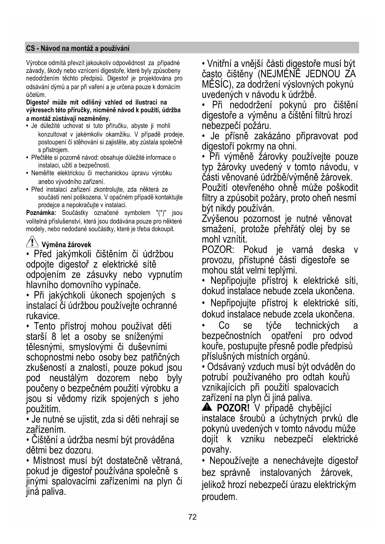 - Při výměně žárovky používejte pouze typ žárovky uvedený v tomto návodu, v části věnované údržbě/výměně žárovek. Použití otevřeného ohně může poškodit filtry a způsobit požáry, proto oheň nesmí být nikdy používán. Zvýšenou pozornost je nutné věnovat smažení, protože přehřátý olej by se mohl vznítit. POZOR: Pokud je varná deska v provozu, přístupné části digestoře se mohou stát velmi teplými.