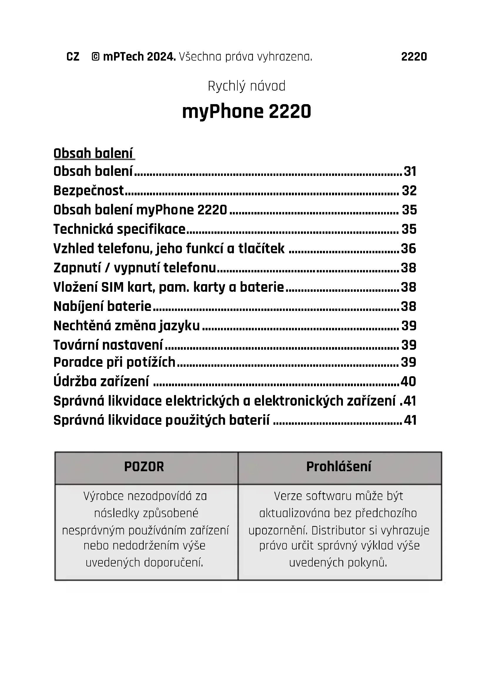 - Use the original accessories only. Violation of this rule may result in an invalidation of the warranty.EN © mPTech 2024. All rights reserved 2220 Correct disposal of electrical and electronic equipment The device is marked with a crossed-out garbage bin, in accordance with the European Directive 2012/19/EU on used electrical and electronic Equipment (Waste Electrical and Electronic equipment - WEEE). Products marked with this symbol should not be disposed of or dumped with other household waste after a period of use. The user is obliged to get rid of used electrical and electronic equipment by delivering it to designated recycling point in which dangerous waste are being recycled. Collecting this type of waste in designated locations, and the actual process of their recovery contribute to the protection of natural resources. Proper disposal of used electrical and electronic equipment is beneficial to human health and environment. To obtain information on where and how to dispose of used electrical and electronic equipment in an environmentally friendly manner user should contact their local government office, the waste collection point, or point of sale, where the equipment was purchased. Correct disposal of used batteries According to the EU directive 2006/66/EC with changes contained in EU directive 2013/56/UE on the disposal of batteries, this product is marked with crossed-out garbage bin symbol. The symbol indicates that the batteries used in this product should not be disposed with regular household waste, but treated according to the legal directives and local regulations. It is not allowed toEN © mPTech 2024. All rights reserved 2220 dispose of batteries and accumulators with unsorted municipal waste. Users of batteries and accumulators must use the available collection points of these items, which allows them to return, recycle and disposal. Within the EU, the collection and recycling of batteries and accumulators is a subject to separate procedures. To learn more about existing procedures of recycling of batteries and accumulators please contact your local office or an institution for waste disposal or landfill.CZ © mPTech 2024. Všechna práva vyhrazena. 2220 Rychlý návod myPhone 2220 Obsah balení Obsah balení ....................................................................................... 31 Bezpečnost ......................................................................................... 32 Obsah balení myPhone 2220 ....................................................... 35 Technická specifikace..................................................................... 35 Vzhled telefonu, jeho funkcí a tlačítek .................................... 36 Zapnutí / vypnutí telefonu ........................................................... 38 Vložení SIM kart, pam. karty a baterie ..................................... 38 Nabíjení baterie ................................................................................ 38 Nechtěná změna jazyku ................................................................ 39 Tovární nastavení ............................................................................ 39 Poradce při potížích ........................................................................ 39 Údržba zařízení ................................................................................ 40 Správná likvidace elektrických a elektronických zařízení . 41 Správná likvidace použitých baterií .......................................... 41 POZOR Prohlášení Výrobce nezodpovídá za následky způsobené nesprávným používáním zařízení nebo nedodržením výše uvedených doporučení. Verze softwaru může být aktualizována bez předchozího upozornění. Distributor si vyhrazuje právo určit správný výklad výše uvedených pokynů.CZ © mPTech 2024. Všechna práva vyhrazena. 2220 POUŽITÍ UŽIVATELSKÉ PŘÍRUČKY Bez písemného souhlasu výrobce nesmí být žádná část této příručky reprodukována, distribuována, přeložena nebo přednášena v jakékoliv formě, elektronicky nebo fyzicky, včetně kopírování, nahrávání nebo ukládání v jakémkoli systému pro sdílení informací. Před použitím si přečtěte bezpečnostní upozornění a uživatelskou příručku. Popisy obsažené v této příručce jsou založeny na výchozím nastavení telefonu. Nejnovější verzi příručky naleznete na našich webových stránkách: www.myphone-mobile.com/qr/myphone-2220 V závislosti na nainstalované verzi softwaru, aplikace, poskytovatele služeb, SIM karty nebo zemi nemusí některé popisy v této příručce odpovídat vašemu telefonu. Bezpečnost —ČERPACÍ STANICE— Nepoužívejte mobilní telefon při tankování na čerpací stanici nebo v blízkosti chemikálií. POZOR! V místech, kde hrozí nebezpečí výbuchu (např. čerpací stanice, chemické továrny, atd.) je vhodné telefon zcela vypnout. Na těchto místech se řiďte předpisy pro používání GSM zařízení.