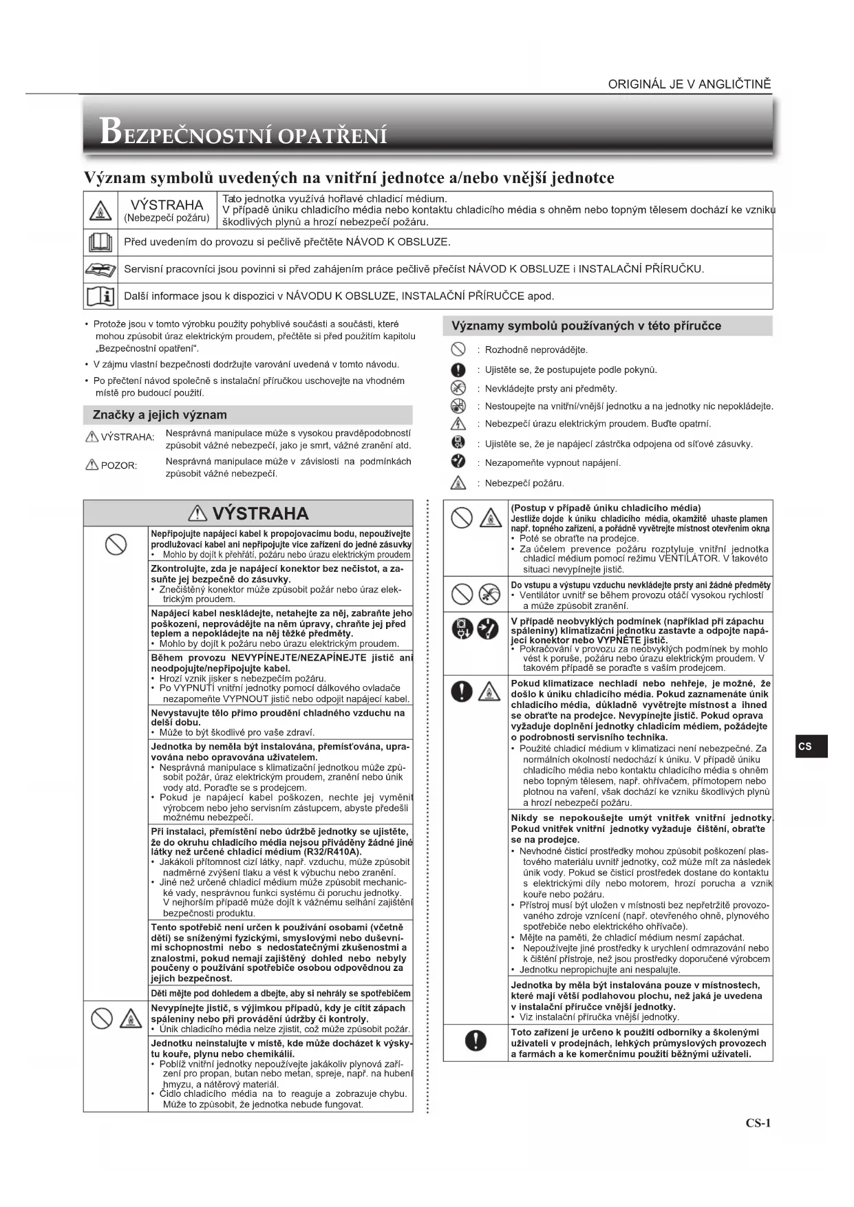 Nevypínejte jistič, s výjimkou případů, kdy je cítit zápach spáleniny nebo při provádění údržby či kontroly.• Únik chladicího média nelze zjistit, což může způsobit požár.Jednotku neinstalujte v místě, kde může docházet k výsky-tu kouře, plynu nebo chemikálií.• Poblíž vnitřní jednotky nepoužívejte jakákoliv plynová zaří-zení pro propan, butan nebo metan, spreje, např. na hubení hmyzu, a nátěrový materiál.• Čidlo chladicího média na to reaguje a zobrazuje chybu. Může to způsobit, že jednotka nebude fungovat.• Protože jsou v tomto výrobku použity pohyblivé součásti a součásti, které mohou způsobit úraz elektrickým proudem, přečtěte si před použitím kapitolu „Bezpečnostní opatření“.• V zájmu vlastní bezpečnosti dodržujte varování uvedená v tomto návodu.• Po přečtení návod společně s instalační příručkou uschovejte na vhodném místě pro budoucí použití. Značky a jejich význam VÝSTRAHA:Nesprávná manipulace může s vysokou pravděpodobností způsobit vážné nebezpečí, jako je smrt, vážné zranění atd. POZOR:Nesprávná manipulace může v závislosti na podmínkách způsobit vážné nebezpečí. (Postup v případě úniku chladicího média)Jestliže dojde k úniku chladicího média, okamžitě uhaste plamen např. topného zařízení, a pořádně vyvětrejte místnost otevřením okna