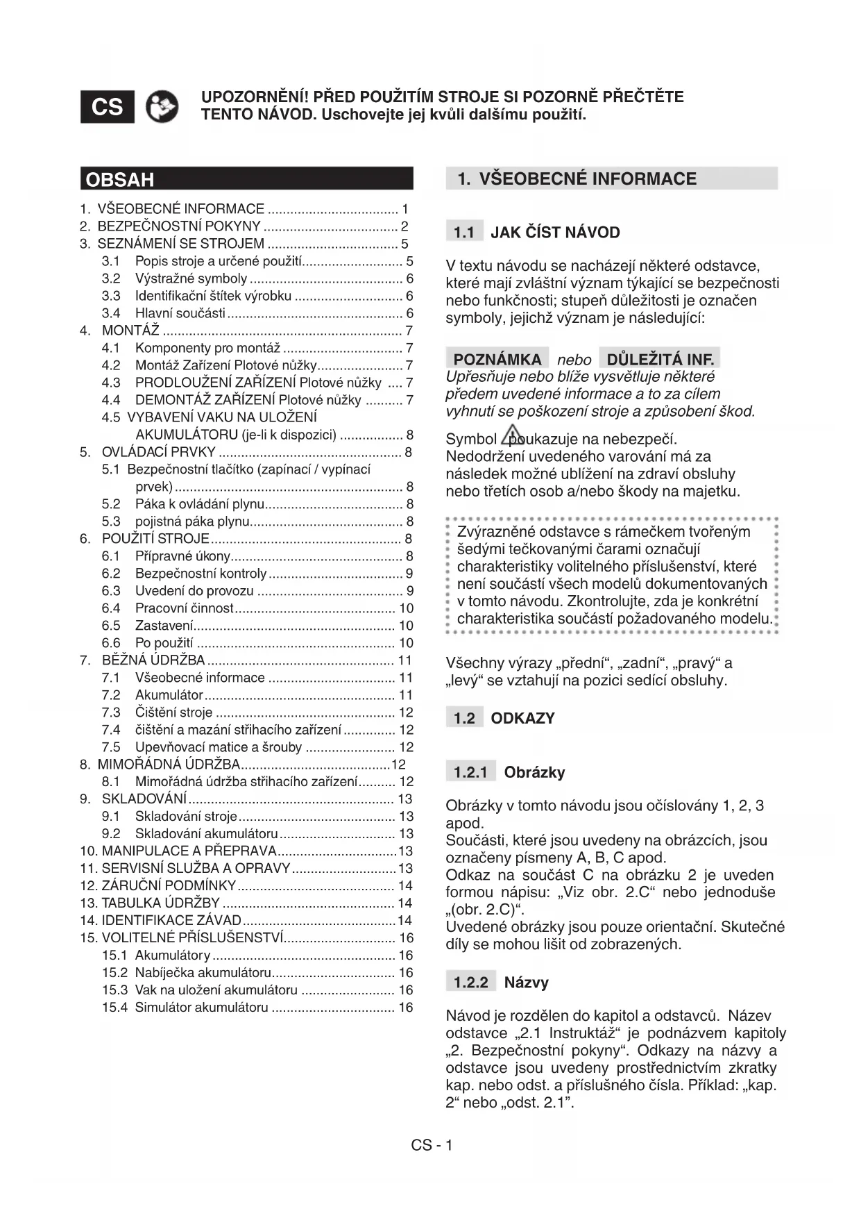 Návod je rozdělen do kapitol a odstavců. Název odstavce „2.1 Instruktáž“ je podnázvem kapitoly „2. Bezpečnostní pokyny“. Odkazy na názvy a odstavce jsou uvedeny prostřednictvím zkratky kap. nebo odst. a příslušného čísla. Příklad: „kap. 2“ nebo „odst. 2.1”. OBSAH