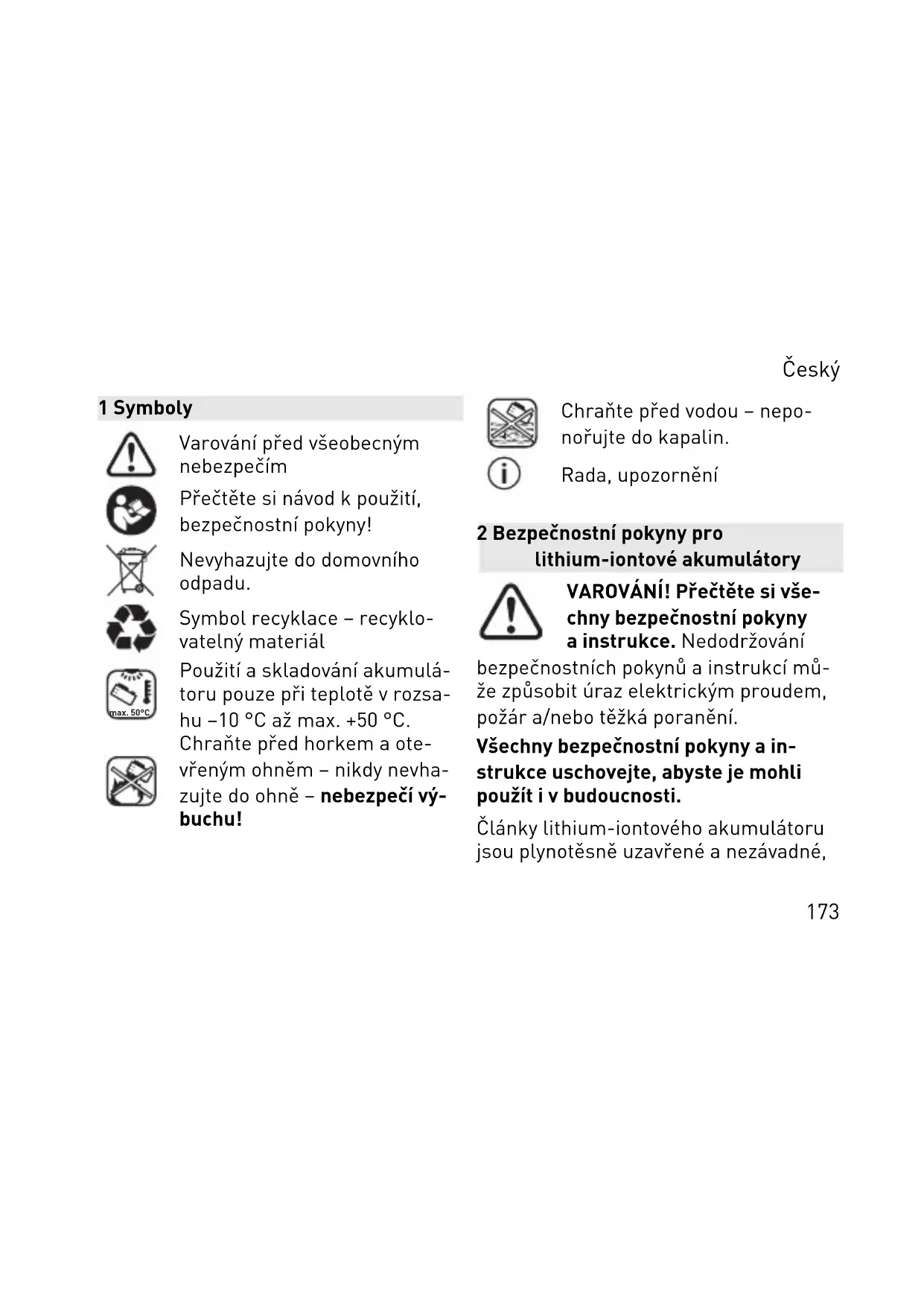 1721 Symboly Varování před všeobecným nebezpečím Přečtěte si návod k použití, bezpečnostní pokyny! Nevyhazujte do domovního odpadu. Symbol recyklace – recyklo vatelný materiál max. 50°C Použití a skladování akumulá toru pouze při teplotě v rozsa hu −10 °C až max. +50 °C. Chraňte před horkem a ote vřeným ohněm – nikdy nevha zujte do ohně – nebezpečí vý buchu! Chraňte před vodou – nepo nořujte do kapalin. Rada, upozornění 2 Bezpečnostní pokyny pro lithium-iontové akumulátory VAROVÁNÍ! Přečtěte si vše chny bezpečnostní pokyny a instrukce. Nedodržování bezpečnostních pokynů a instrukcí mů že způsobit úraz elektrickým proudem, požár a/nebo těžká poranění. Všechny bezpečnostní pokyny a in strukce uschovejte, abyste je mohli použít i v budoucnosti. Články lithium-iontového akumulátoru jsou plynotěsně uzavřené a nezávadné, Český 173pokud se při používání a manipulaci do držují předpisy výrobce. – S vybitými akumulátory zacházejte opatrně. Akumulátory představují zdroj nebezpečí, protože mohou způ sobit velmi vysoký zkratový proud. I když se zdá, že jsou lithium-iontové akumulátory vybité, nikdy se nevybijí úplně. – Vyvarujte se působení fyzické síly a nárazů. Nárazy a vniknutí předmě tů mohou akumulátory poškodit. To může způsobit vytečení, zahřívání, vznik kouře, vznícení nebo výbuch akumulátoru. – Nepoužívaný akumulátor udržujte v dostatečné vzdálenosti od kovových předmětů (např. hřebíků, šroubů, klíčů, kancelářských svorek), které by mohly způsobit přemostění kon taktů. Zkrat mezi kontakty akumulá toru může způsobit popáleniny nebo požár. – Akumulátor chraňte před horkem, např. i před delším slunečním záře ním, a před ohněm. Oheň a teploty nad 130 °C mohou způsobit výbuch. – Akumulátor neotevírejte. Otevření nebo úprava akumulátoru mohou po škodit bezpečnostní prvky. To může způsobit zahřívání, vznik kouře, vzní cení nebo výbuch akumulátoru. – Akumulátor neponořujte do kapalin, jako jsou (slaná) voda nebo nápoje. Kontakt s kapalinami může akumulá tor poškodit. To může způsobit zahří vání, vznik kouře, vznícení nebo vý buch akumulátoru. Akumulátor dále Český 174nepoužívejte a kontaktujte autorizova ný zákaznický servis Festool. – Akumulátory nabíjejte pouze v nabí ječkách, které jsou doporučené vý robcem (viz obrázek). U nabíječky, která je vhodná pro určitý druh aku mulátorů, hrozí nebezpečí požáru, po kud se používá s jinými akumulátory. – Hořící lithium-iontové akumulátory nikdy nehaste vodou! Použijte písek nebo hasicí deku. – Při poškození a nesprávném používá ní akumulátoru mohou unikat výpary. Výpary mohou podráždit dýchací ce sty. Zajistěte přívod čerstvého vzdu chu a v případě obtíží vyhledejte léka ře. – Akumulátor používejte jen ve spojení s vaším zařízením Festool. Jen tak bude akumulátor chráněný před ne bezpečným přetížením. Používání ji ného zařízení může způsobit poranění a nebezpečí požáru. – Při nesprávném používání může z akumulátoru unikat kapalina. Za braňte kontaktu s touto kapalinou. Při náhodném kontaktu opláchněte postižené místo vodou. Pokud se ka palina dostane do očí, vyhledejte na víc lékařskou pomoc. Kapalina vyté kající z akumulátoru může způsobit podráždění kůže nebo popáleniny. – Z vadného akumulátoru může vytékat kapalina, která může potřísnit okolní předměty. Zkontrolujte zasažené díly. Vyčistěte je tím, že kapalinu vysajete suchými papírovými utěrkami a omy jete dostatečným množstvím vody. Ve Český 175změte si ochranné rukavice, abyste zabránili kontaktu s pokožkou. V pří padě potřeby díly vyměňte. – Nepoužívejte poškozené nebo upra vené akumulátory. Poškozené nebo upravené akumulátory mohou mít ne předvídatelné vlastnosti způsobující oheň, výbuch nebo zranění. – Poškozené akumulátory nepoužívej te. Akumulátor se musí okamžitě přestat používat, pokud vykazuje ne normální vlastnosti, jako je zápach, zahřívání, změna barvy nebo defor mace. Pokud se bude akumulátor dá le používat, může dojít k zahřívání, vzniku kouře, vznícení nebo k explozi. – Akumulátor neotevírejte, nestlačuj te, nepřehřívejte (nad 80 °C) ani ne spalujte. V případě nedodržení těchto pokynů hrozí riziko popálení a vzniku požáru. Respektujte pokyny výrobce. 3 Technické údaje Akumulátor BP 18 Li Frekvence 2 402 MHz – 2 480 MHz Ekvivalentní izo tropicky vyzářený výkon (EIRP) < 10 dBm Český 176Hmotnost BP 18 Li 3,1 Ergo I 0,4 kg BP 18 Li 3,1 CI 0,4 kg BP 18 Li 5,2 ASI 0,7 kg BP 18 Li 6,2 ASI 0,7 kg BP 18 Li 4,0 HPC-ASI 0,6 kg Další technické údaje viz typový štítek na akumulátoru. 4 Použití v souladu s daným účelem Akumulátory jsou vhodné pro použití s akumulátorovým zařízením Festool a uvedenými nabíječkami Festool (viz obrázek). Akumulátor je vhodný pro automatické zapínání/vypínání mobilního vysavače. 5 Jednotlivé součásti [1-1] Tlačítko pro zobrazení kapacity [1-2] Ukazatel kapacity [1-3] Ukazatel Bluetooth