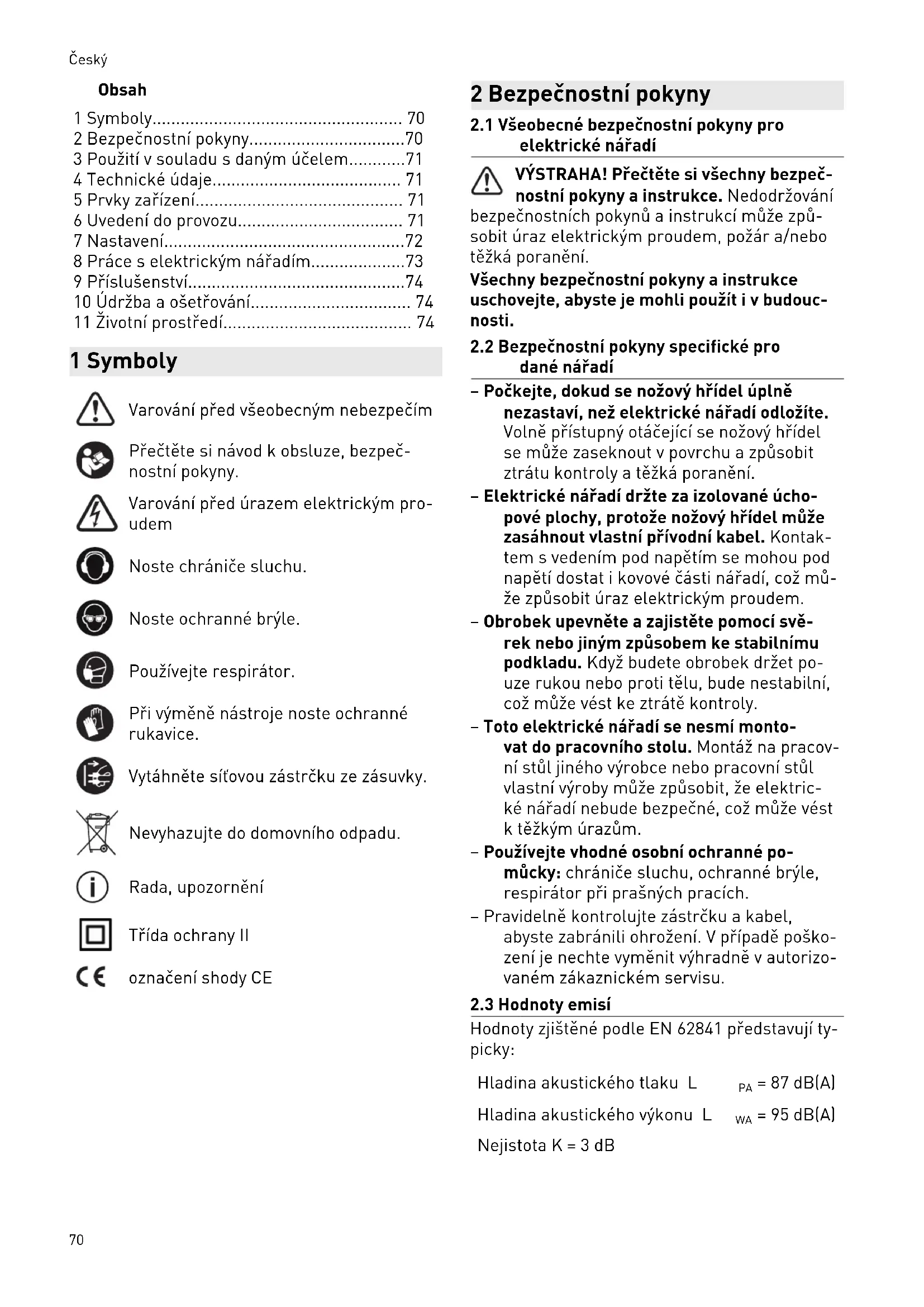dané nářadí – Počkejte, dokud se nožový hřídel úplně nezastaví, než elektrické nářadí odložíte. Volně přístupný otáčející se nožový hřídel se může zaseknout v povrchu a způsobit ztrátu kontroly a těžká poranění. – Elektrické nářadí držte za izolované úcho pové plochy, protože nožový hřídel může zasáhnout vlastní přívodní kabel. Kontak tem svedením pod napětím se mohou pod napětí dostat ikovové části nářadí, což mů že způsobit úraz elektrickým proudem. – Obrobek upevněte azajistěte pomocí svě rek nebo jiným způsobem ke stabilnímu podkladu. Když budete obrobek držet po uze rukou nebo proti tělu, bude nestabilní, což může vést ke ztrátě kontroly. – Toto elektrické nářadí se nesmí monto vat do pracovního stolu. Montáž na pracov ní stůl jiného výrobce nebo pracovní stůl vlastní výroby může způsobit, že elektric ké nářadí nebude bezpečné, což může vést ktěžkým úrazům. – Používejte vhodné osobní ochranné po můcky: chrániče sluchu, ochranné brýle, respirátor při prašných pracích. – Pravidelně kontrolujte zástrčku akabel, abyste zabránili ohrožení. Vpřípadě poško zení je nechte vyměnit výhradně vautorizo vaném zákaznickém servisu.