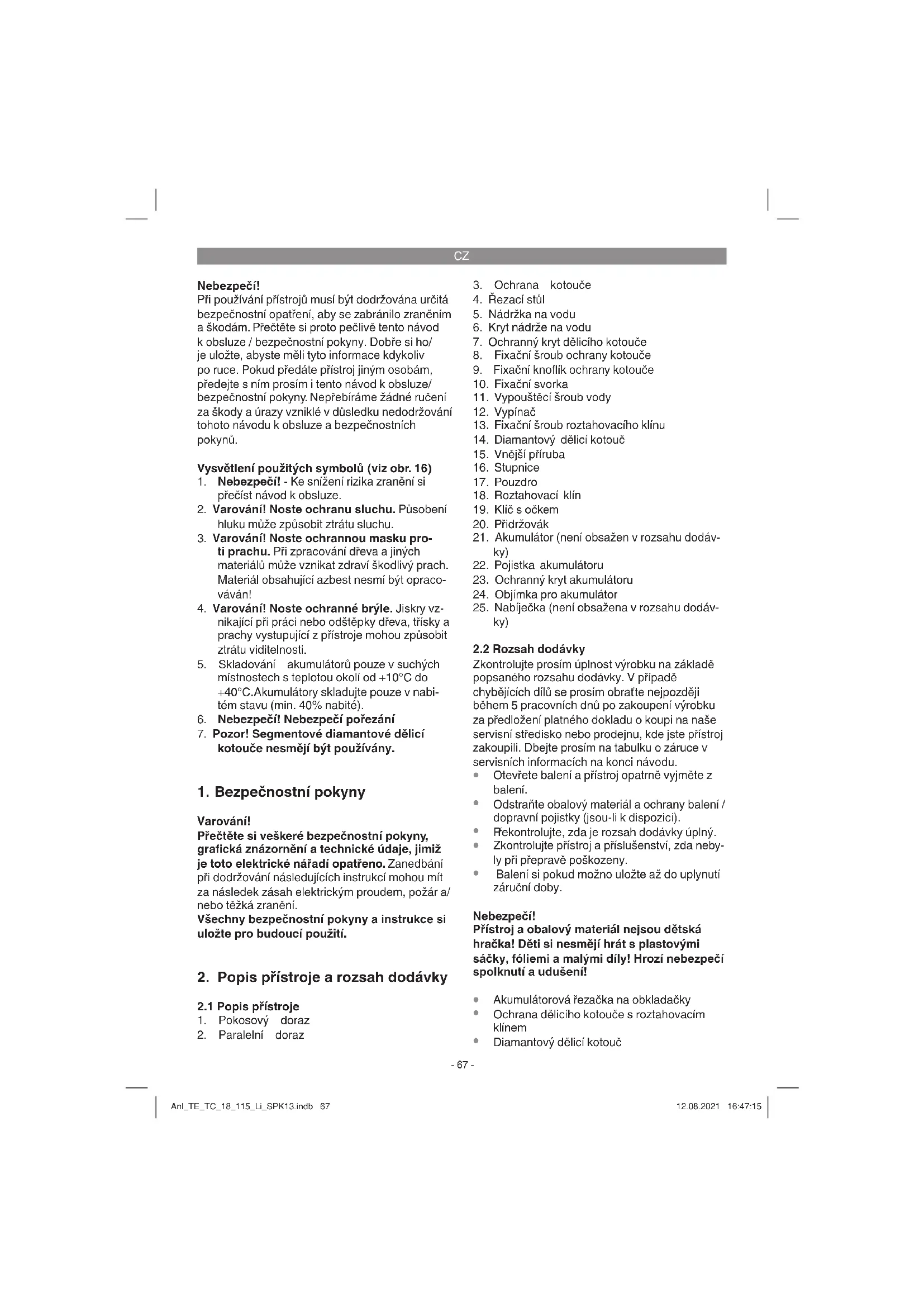 Prosím přečtěte si pečlivě návod k použití a dbejte jeho pokynů. Na základě tohoto návodu k použití se seznamte s přístrojem, jeho správným používáním a také s bezpečnostními pokyny. Nebezpečí! Z bezpečnostních důvodů nesmí děti a mladiství mladší 16 let a osoby, které nejsou s tímto návo- dem k použití seznámeny, řezačku na obkladačky obsluhovat. Anl_TE_TC_18_115_Li_SPK13.indb 68Anl_TE_TC_18_115_Li_SPK13.indb 68 12.08.2021 16:47:1512.08.2021 16:47:15CZ