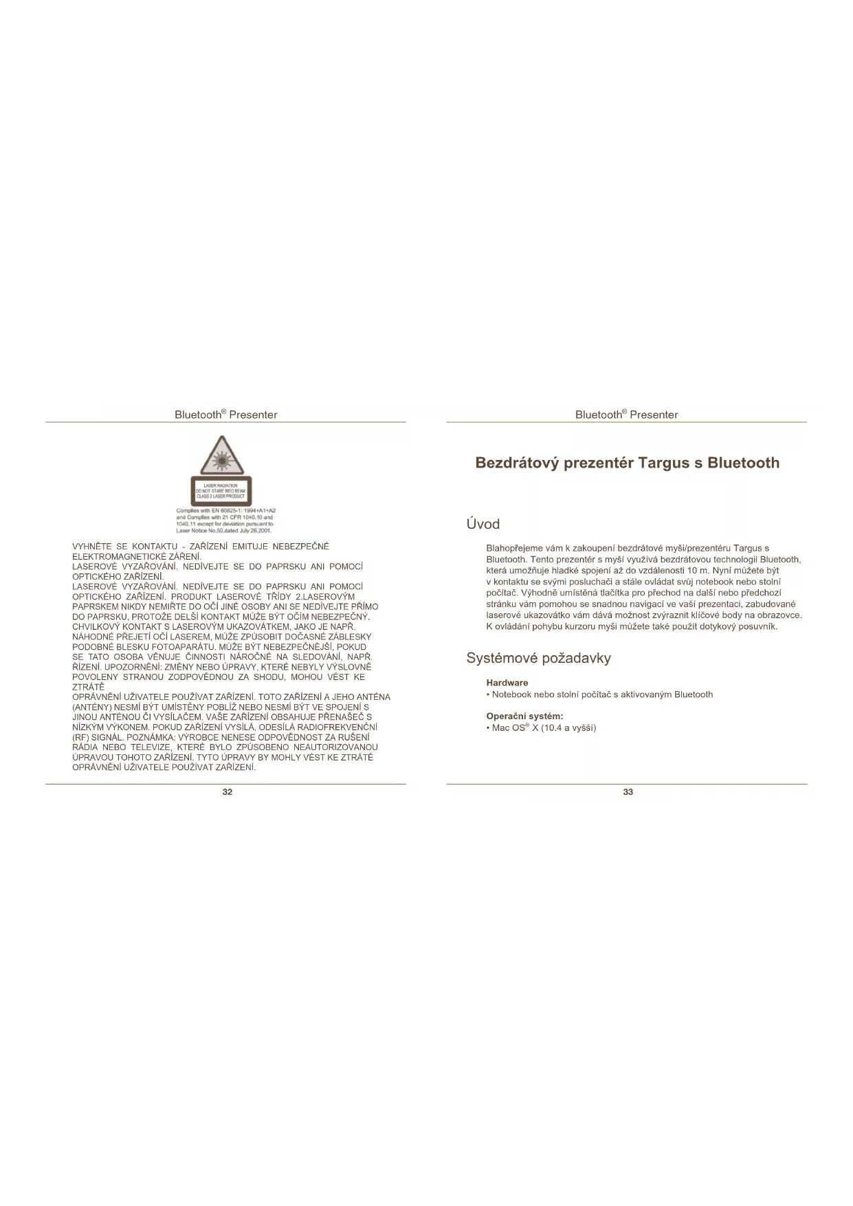 Bezdrátový prezentér Targus s Bluetooth VYHNĚTE SE KONTAKTU - ZAŘÍZENÍ EMITUJE NEBEZPEČNÉ ELEKTROMAGNETICKÉ ZÁŘENÍ.LASEROVÉ VYZAŘOVÁNÍ. NEDÍVEJTE SE DO PAPRSKU ANI POMOCÍ OPTICKÉHO ZAŘÍZENÍ.LASEROVÉ VYZAŘOVÁNÍ. NEDÍVEJTE SE DO PAPRSKU ANI POMOCÍ OPTICKÉHO ZAŘÍZENÍ. PRODUKT LASEROVÉ TŘÍDY 2.LASEROVÝM PAPRSKEM NIKDY NEMIŘTE DO OČÍ JINÉ OSOBY ANI SE NEDÍVEJTE PŘÍMO DO PAPRSKU, PROTOŽE DELŠÍ KONTAKT MŮŽE BÝT OČÍM NEBEZPEČNÝ. CHVILKOVÝ KONTAKT S LASEROVÝM UKAZOVÁTKEM, JAKO JE NAPŘ.NÁHODNÉ PŘEJETÍ OČÍ LASEREM, MŮŽE ZPŮSOBIT DOČASNÉ ZÁBLESKY PODOBNÉ BLESKU FOTOAPARÁTU. MŮŽE BÝT NEBEZPEČNĚJŠÍ, POKUD SE TATO OSOBA VĚNUJE ČINNOSTI NÁROČNÉ NA SLEDOVÁNÍ, NAPŘ. ŘÍZENÍ. UPOZORNĚNÍ: ZMĚNY NEBO ÚPRAVY, KTERÉ NEBYLY VÝSLOVNĚ POVOLENY STRANOU ZODPOVĚDNOU ZA SHODU, MOHOU VÉST KE ZTRÁTĚOPRÁVNĚNÍ UŽIVATELE POUŽÍVAT ZAŘÍZENÍ. TOTO ZAŘÍZENÍ A JEHO ANTÉNA (ANTÉNY) NESMÍ BÝT UMÍSTĚNY POBLÍŽ NEBO NESMÍ BÝT VE SPOJENÍ S JINOU ANTÉNOU ČI VYSÍLAČEM. VAŠE ZAŘÍZENÍ OBSAHUJE PŘENAŠEČ S NÍZKÝM VÝKONEM. POKUD ZAŘÍZENÍ VYSÍLÁ, ODESÍLÁ RADIOFREKVENČNÍ (RF) SIGNÁL. POZNÁMKA: VÝROBCE NENESE ODPOVĚDNOST ZA RUŠENÍ RÁDIA NEBO TELEVIZE, KTERÉ BYLO ZPŮSOBENO NEAUTORIZOVANOU ÚPRAVOU TOHOTO ZAŘÍZENÍ. TYTO ÚPRAVY BY MOHLY VÉST KE ZTRÁTĚ OPRÁVNĚNÍ UŽIVATELE POUŽÍVAT ZAŘÍZENÍ. Úvod Blahopřejeme vám k zakoupení bezdrátové myši/prezentéru Targus s Bluetooth. Tento prezentér s myší využívá bezdrátovou technologii Bluetooth, která umožňuje hladké spojení až do vzdálenosti 10 m. Nyní můžete být v kontaktu se svými posluchači a stále ovládat svůj notebook nebo stolní počítač. Výhodně umístěná tlačítka pro přechod na další nebo předchozí stránku vám pomohou se snadnou navigací ve vaší prezentaci, zabudované laserové ukazovátko vám dává možnost zvýraznit klíčové body na obrazovce. K ovládání pohybu kurzoru myši můžete také použít dotykový posuvník. Systémové požadavky Hardware