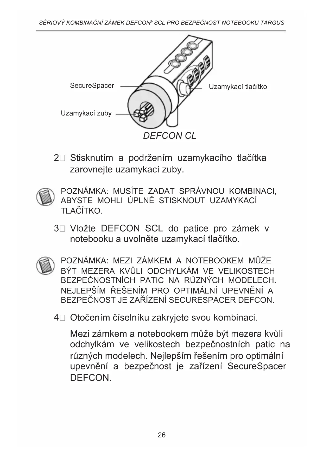 SCL pro bezpečnost notebooku Targus. DECON SCL pomáhá chránit váš cenný notebook před krádeží pomocí sériového zámku s kombinací čtyř číslic. Přednastavený kombinační zámek odstraňuje potřebu kláves a znemožňuje vynulování kombinace. Balení kromě této uživatelské příručky obsahuje: Sériový kombinační kabelový zámek DEFCON SCL DEFCON SecureSpacers Bezpečnostní základnu DEFCON VAROVÁNÍ: PŘED POUŽITÍM DEFCON SCL SI MUSÍTE ZAPSAT NASTAVENOU KOMBINACI.