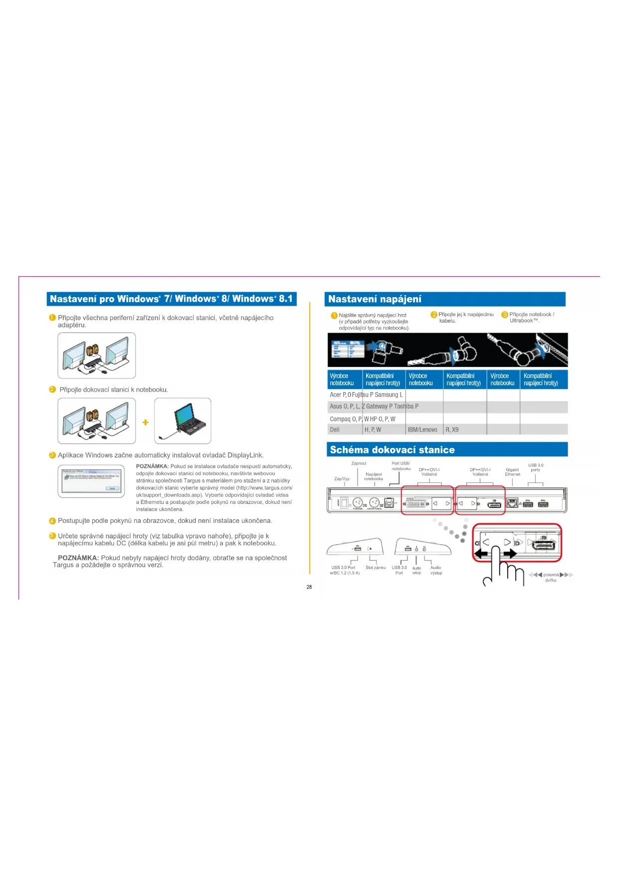 Najděte správný napájecí hrot (v případě potřeby vyzkoušejte odpovídající typ na notebooku). Připojte jej k napájecímu kabelu. Připojte notebook / Ultrabook™. Výrobce notebooku Kompatibilní napájecí hrot(y) Výrobce notebooku Kompatibilní napájecí hrot(y) Výrobce notebooku Kompatibilní napájecí hrot(y) Acer P, O Fujitsu P Samsung L Asus O, P, L, Z Gateway P Toshiba P Compaq O, P, W HP O, P, W Dell H, P, W IBM/Lenovo R, X9 Zap/VypPort USB/ notebookuUSB 3.0 portyZapnoutNapájení notebookuGigabit EthernetDP++/DVI-IVolitelnéDP++/DVI-IVolitelné Audio vstupUSB 3.0 Port Audio výstupposuvná dvířkaSlot zámkuUSB 3.0 Portw/BC 1,2 (1,5 A)POZNÁMKA: Pokud se instalace ovladače nespustí automaticky, odpojte dokovací stanici od notebooku, navštivte webovou stránku společnosti Targus s materiálem pro stažení a z nabídky dokovacích stanic vyberte správný model (http://www.targus.com/uk/support_downloads.asp). Vyberte odpovídající ovladač videa a Ethernetu a postupujte podle pokynů na obrazovce, dokud není instalace ukončena.32 CZ – Ceština29 Nabídka Manažer DisplayLink