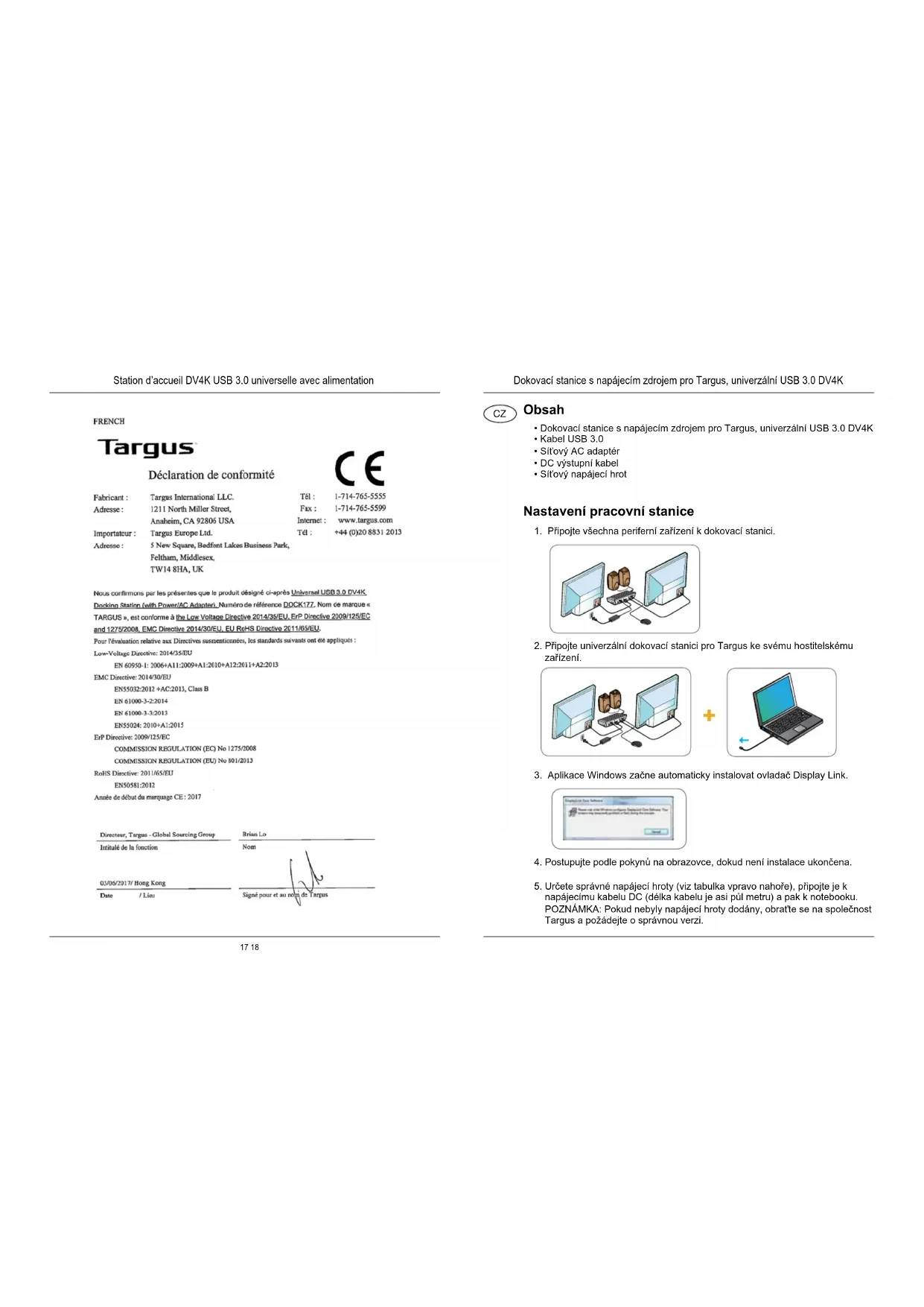 - Ubuntu 14.04.x LTS and 16.04 LTS on x86 platform (*více informací o kompatibilitě a omezeních naleznete na www:displaylink.com) Pro zajištění nejlepšího výkonu systému Windows aktualizujte adaptér obrazovky hostitelského PC a ovladače USB 3.0. Tyto aktualizace jsou často dostupné u vašeho oddělení IT nebo u výrobce PC, pokud máte správcovská práva ke stažení či instalaci ovladačů pro váš PC. Vítejte v systému Display Link Manager univerzální dokovací stanice pro Targus. Pokud již nebyl software Display Link Manager instalován, můžete jej stáhnout jako aktualizaci ze serveru Windows nebo ze stránek www.targus.com. Software je uveden pod ikonou v liště úkolů systému Windows a umožňuje snadné připojení dalších monitorů k notebooku nebo na plochu prostřednictvím dokovací stanice Targus. Použitím zobrazení ovladacího panelu pro zobrazení rozlišení obrazovky systému Windows lze konfigurovat připojené obrazovky tak, aby zobrazovaly vaši havní obrazovku, nebo k rozšíření plochy Windows pro zobrazení více aplikací zároveň. Grafická zařízení Display Link USB lze také nastavit tak, aby se zobrazovaly jako hlavní obrazovka. Dokovací stanice s napájecím zdrojem pro Targus, univerzální USB 3.0 DV4K21 22folding line2 staples here (saddle stitching)folding line2 staples here (saddle stitching)Open size: 10”W x7”H Folded Size: 5”W x 7”H Material: 80gsm woodfree paper Color: GrayscaleDiecut Nastavení v systému OS-X Nastavení systému Android Během instalace softwaru Display Link pro OS-X, jenž je dostupný na stránkách www.targus.com, mohou uživatelé MacBook použít k nastavení externích obrazovek systém preferencí pro obrazovky. OS-X umožňuje konfiguraci všech dalších USB obrazovek včetně: