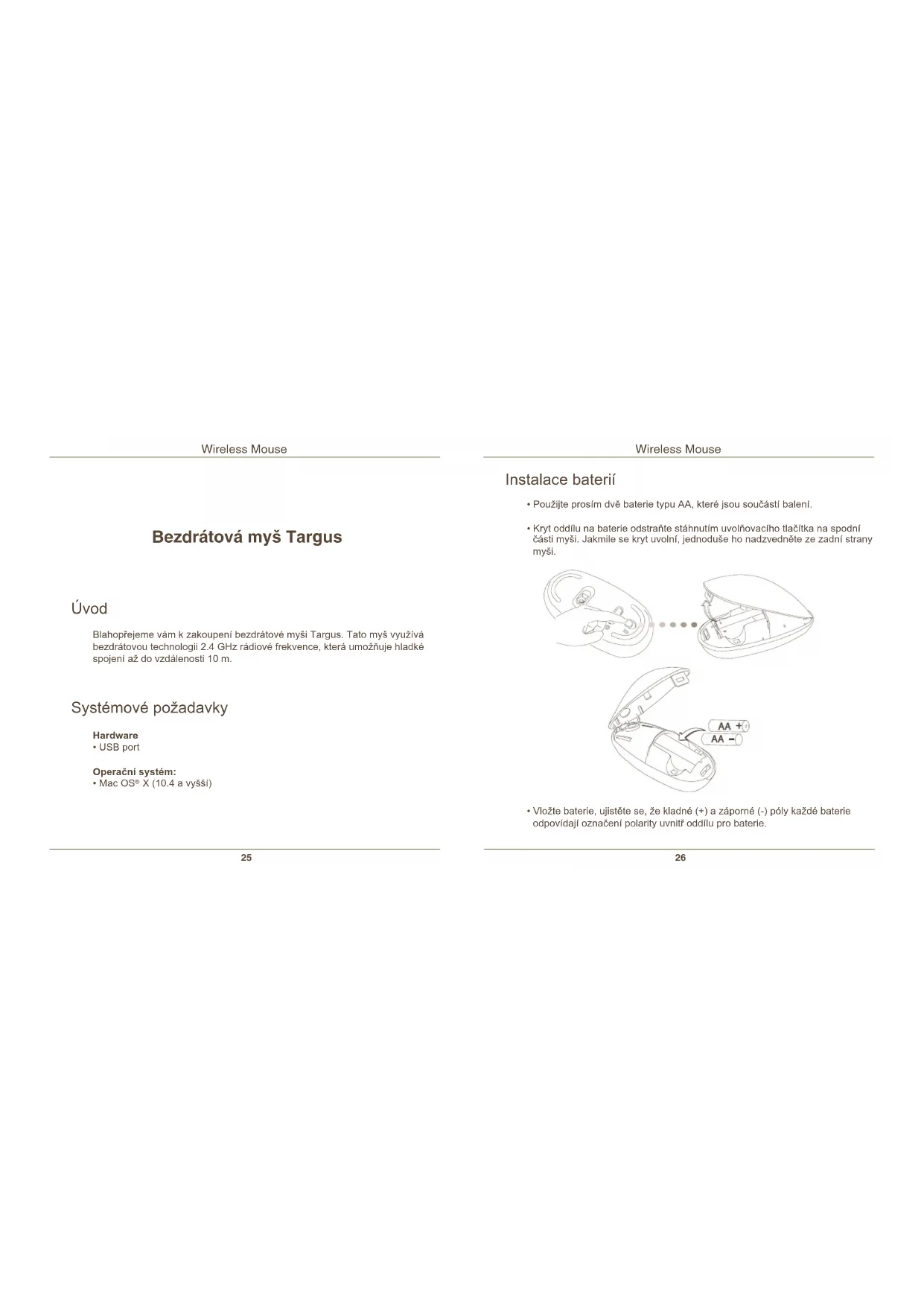 Bezdrátová myš Targus Úvod Blahopřejeme vám k zakoupení bezdrátové myši Targus. Tato myš využívá bezdrátovou technologii 2.4 GHz rádiové frekvence, která umožňuje hladké spojení až do vzdálenosti 10 m. Systémové požadavky Hardware