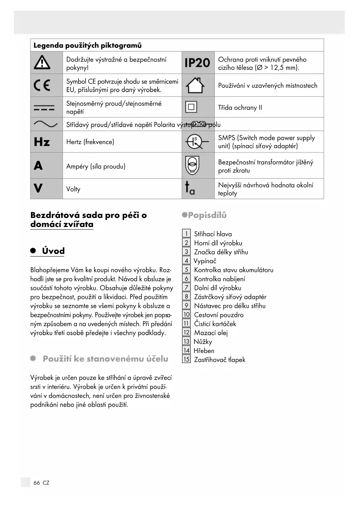 ným způsobem a na uvedených místech. Při předání výrobku třetí osobě předejte i všechny podklady. Použití ke stanovenému účelu Výrobek je určen pouze ke stříhání a úpravě zvířecí srsti v interiéru. Výrobek je určen k privátní použí- vání v domácnostech, není určen pro živnostenské podnikání nebo jiné oblasti použití. Popis dílů