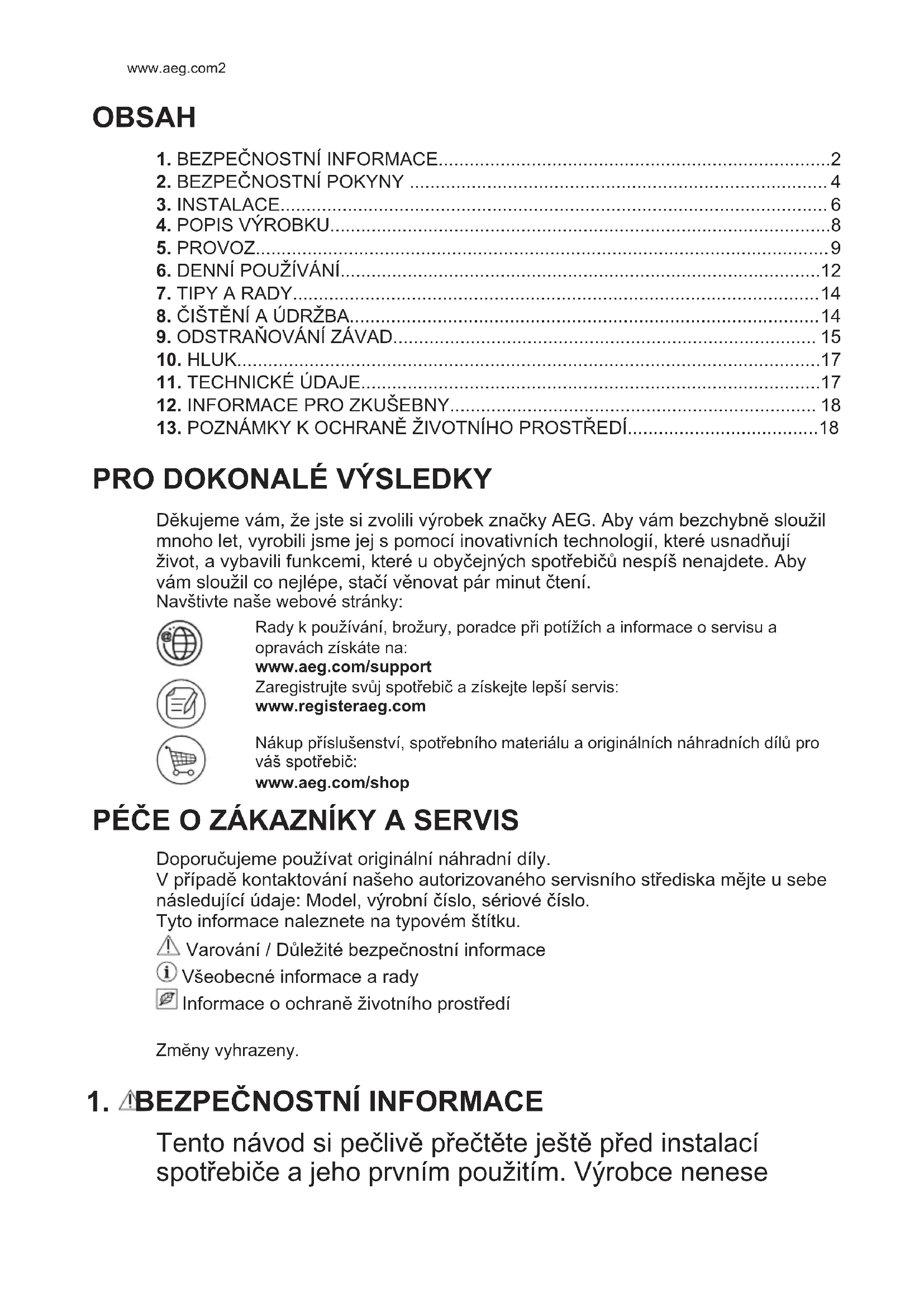 Děkujeme vám, že jste si zvolili výrobek značky AEG. Aby vám bezchybně sloužil mnoho let, vyrobili jsme jej s pomocí inovativních technologií, které usnadňují život, a vybavili funkcemi, které u obyčejných spotřebičů nespíš nenajdete. Aby vám sloužil co nejlépe, stačí věnovat pár minut čtení. Navštivte naše webové stránky: Rady k používání, brožury, poradce při potížích a informace o servisu a opravách získáte na: www.aeg.com/support Zaregistrujte svůj spotřebič a získejte lepší servis: www.registeraeg.com Nákup příslušenství, spotřebního materiálu a originálních náhradních dílů pro váš spotřebič: www.aeg.com/shop PÉČE O ZÁKAZNÍKY A SERVIS Doporučujeme používat originální náhradní díly. V případě kontaktování našeho autorizovaného servisního střediska mějte u sebe následující údaje: Model, výrobní číslo, sériové číslo. Tyto informace naleznete na typovém štítku. Varování / Důležité bezpečnostní informace Všeobecné informace a rady Informace o ochraně životního prostředí Zmĕny vyhrazeny.