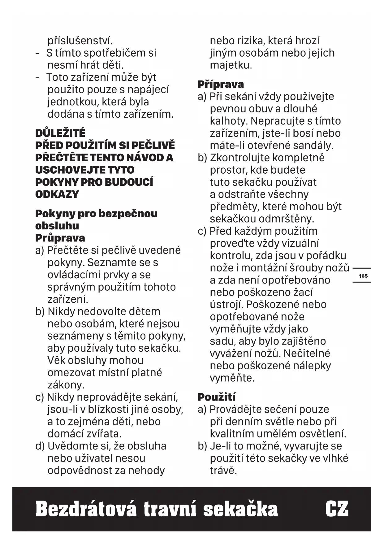 POKYNY VAROVÁNÍ Přečtěte si všechna bezpečnostní varování a všechny pokyny. Nebudete-li dodržovat uvedená varování a pokyny, může dojít k úrazu elektrickým proudem, požáru nebo vážným zraněním. Pečlivě si přečtěte všechny uvedené pokyny, aby byla zaručena bezpečná obsluha tohoto stroje. Uschovejte všechna varování a pokyny pro budoucí odkazy. - Tento spotřebič není určen pro používání osobami (včetně dětí) trpící fyzickými, smyslovými či psychickými poruchami ani osobami bez náležitých znalostí a zkušeností. Pokud jej chtějí používat, musí být pod dozorem osoby odpovědné za jejich bezpečnost nebo je tato osoba musí poučit o bezpečném používání165 Bezdrátová travní sekačka