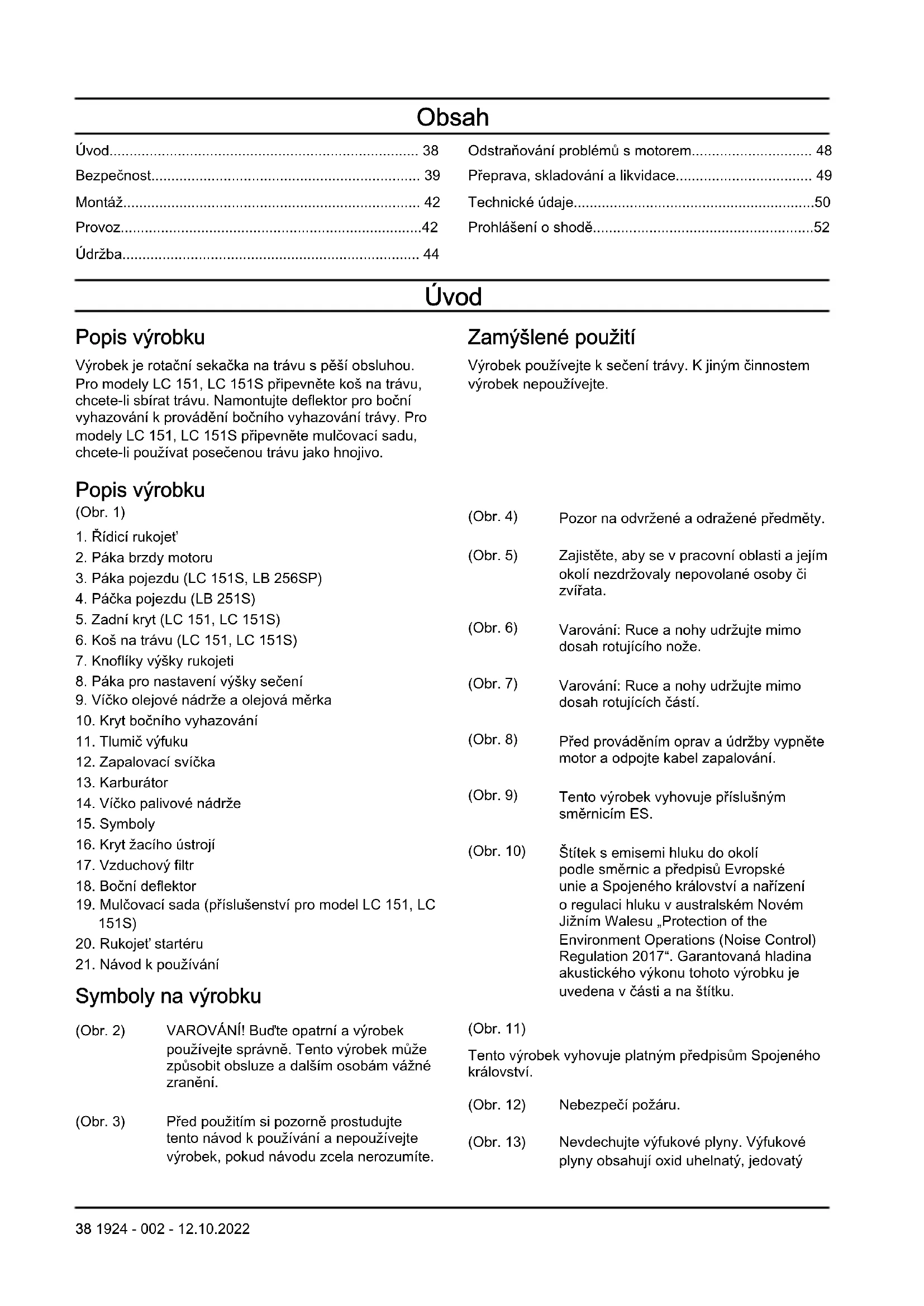 Symboly na výrobku (Obr. 2) VAROVÁNÍ! Buďte opatrní avýrobek používejte správně. Tento výrobek může způsobit obsluze adalším osobám vážné zranění. (Obr. 3) Před použitím si pozorně prostudujte tento návod kpoužívání anepoužívejte výrobek, pokud návodu zcela nerozumíte. (Obr. 4) Pozor na odvržené aodražené předměty. (Obr. 5) Zajistěte, aby se vpracovní oblasti ajejím okolí nezdržovaly nepovolané osoby či zvířata. (Obr. 6) Varování: Ruce anohy udržujte mimo dosah rotujícího nože. (Obr. 7) Varování: Ruce anohy udržujte mimo dosah rotujících částí. (Obr. 8) Před prováděním oprav aúdržby vypněte motor aodpojte kabel zapalování. (Obr. 9) Tento výrobek vyhovuje příslušným směrnicím ES. (Obr. 10) Štítek semisemi hluku do okolí podle směrnic apředpisů Evropské unie aSpojeného království anařízení oregulaci hluku vaustralském Novém Jižním Walesu „Protection of the Environment Operations (Noise Control) Regulation 2017“. Garantovaná hladina akustického výkonu tohoto výrobku je uvedena včásti ana štítku. (Obr. 11) Tento výrobek vyhovuje platným předpisům Spojeného království. (Obr. 12) Nebezpečí požáru. (Obr. 13) Nevdechujte výfukové plyny. Výfukové plyny obsahují oxid uhelnatý, jedovatý 38 1924 - 002 - 12.10.2022avelmi nebezpečný plyn bez zápachu. Nenechávejte motor spuštěný ve vnitřních nebo uzavřených prostorech. (Obr. 14) Horký povrch. (Obr. 15) Před nastartováním výrobku doplňte do motoru olej. Povšimněte si: Další symboly/štítky na výrobku se týkají certifikačních požadavků pro některé komerční oblasti. Odpovědnost za výrobek Jak uvádí zákon o odpovědnosti za výrobek, neneseme odpovědnost za žádnou škodu způsobenou našim výrobkem, pokud: