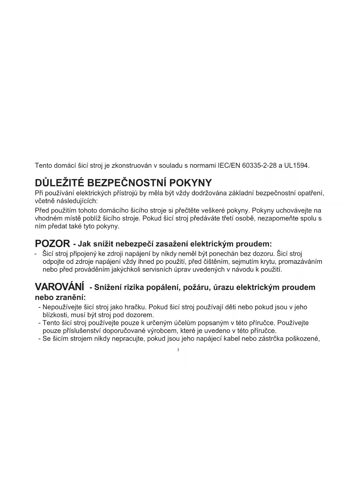 Při používání elektrických přístrojů by měla být vždy dodržována základní bezpečnostní opatření, včetně následujících: Před použitím tohoto domácího šicího stroje si přečtěte veškeré pokyny. Pokyny uchovávejte na vhodném místě poblíž šicího stroje. Pokud šicí stroj předáváte třetí osobě, nezapomeňte spolu s ním předat také tyto pokyny. POZOR - Jak snížit nebezpečí zasažení elektrickým proudem: - Šicí stroj připojený ke zdroji napájení by nikdy neměl být ponechán bez dozoru. Šicí stroj odpojte od zdroje napájení vždy ihned po použití, před čištěním, sejmutím krytu, promazáváním nebo před prováděním jakýchkoli servisních úprav uvedených v návodu k použití. VAROVÁNÍ - Snížení rizika popálení, požáru, úrazu elektrickým proudem nebo zranění: - Nepoužívejte šicí stroj jako hračku. Pokud šicí stroj používají děti nebo pokud jsou v jeho blízkosti, musí být stroj pod dozorem. - Tento šicí stroj používejte pouze k určeným účelům popsaným v této příručce. Používejte pouze příslušenství doporučované výrobcem, které je uvedeno v této příručce. - Se šicím strojem nikdy nepracujte, pokud jsou jeho napájecí kabel nebo zástrčka poškozené,II nebo pokud stroj nepracuje správně, byl poškozen, upadl na zem nebo spadl do vody. Šicí stroj doručte nejbližšímu autorizovanému prodejci nebo servisnímu středisku ke kontrole, opravě a nastavení elektrických či mechanických částí. - Šicí stroj nikdy nepoužívejte se zakrytými větracími otvory. Větrací otvory šicího stroje a nožní ovladač udržujte čisté, bez nahromaděných zbytků vláken, prachu a kousků látek. - Udržujte ruce v bezpečné vzdálenosti od všech pohybujících se částí. Je nutné dávat pozor zejména v blízkosti jehly šicího stroje. - Vždy používejte vhodnou stehovou desku. Nevhodná stehová deska může způsobit zlomení jehly. - Nepoužívejte nikdy ohnuté jehly. - Při šití látku netahejte ani na ni netlačte. Mohlo by dojít k vychýlení jehly a jejímu následnému zlomení. - Používejte ochranné brýle. - Při jakýchkoliv pracích v prostoru jehly, například při navlékání jehly, výměně jehly, navlékání cívky nebo výměně přítlačné patky atd., vždy šicí stroj vypněte ("0"). - Nikdy nevkládejte ani nestrkejte jakékoli předměty do otvorů v šicím stroji. - Šicí stroj nepoužívejte venku (mimo budovu). - Se šicím strojem nepracujte na místech, kde se používají aerosolové prostředky (spreje) nebo prostorách, kde se pracuje s technickým kyslíkem. - Před odpojením šicího stroje přepněte všechny ovladače do polohy vypnuto ("0") a poté vytáhněte zástrčku z elektrické zásuvky. - Zástrčku nikdy neodpojujte taháním za elektrický kabel. Při odpojování uchopte napájecí kabel za zástrčku, nikoli za kabel.III - Nožní ovladač slouží k ovládání šicího stroje. Na nožní ovladač nepokládejte žádné předměty. - Nikdy nepoužívejte stroj, pokud je mokrý. - Je-li osvětlovací lampa LED poškozena nebo rozbita, její výměna musí být provedena výrobcem nebo jeho servisním technikem nebo podobně kvalikovanou osobou, aby se zabránilo vzniku nebezpečí. - Je-li napájecí kabel propojený s nožním ovladačem poškozený, jeho výměna musí být provedena výrobcem nebo jeho servisním technikem nebo podobně kvalikovanou osobou, aby se zabránilo vzniku nebezpečí. - Tento šicí stroj je dodáván s dvojitou izolací. Používejte pouze identické náhradní díly. Viz pokyny pro servis přístrojů s dvojitou izolací.