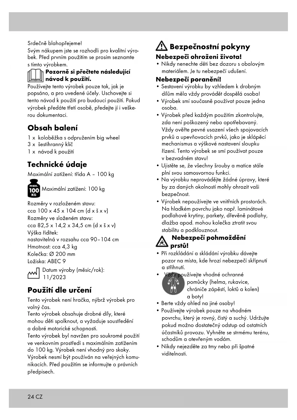 pitole „Výměna koleček“. Uskladnění, čištění Po použití doporučujeme výrobek důkladně vyčistit a vysušit. Odstraňte malé kamínky nebo jiné předměty, které eventuálně uvízly na kolečkách. Mokrá nebo vlhká kuličková ložiska vysušte čistým hadříkem. Z vnější strany namažte ložiska vhod- ným ložiskovým tukem, aby se zabránilo vnější korozi. Výrobek vždy uchovávejte na suchém místě. Pokyny k likvidaci Výrobek a obalové materiály likvidujte podle aktuálních místních předpisů. Uchovávejte obalové materiály (jako např. fóliové sáčky) nedostupné pro děti. O možnostech likvidace vysloužilého výrobku se informujte u Vaší obecní nebo městské správy. Výrobek a obaly likvidujte ekologicky. Recyklační kód slouží ke značení různých materiálů pro proces opětovné- ho zhodnocení (recyklace). Kód sestává ze symbolu recyklace, který má odrážet proces zhodnocení, a čísla, které označuje materiál. Pokyny k záruce a průběhu služby Výrobek byl vyroben s velkou péčí a za stálé kontroly. DELTA-SPORT HANDELSKONTOR GmbH poskytuje koncovým privátním zákaz- níkům na tento výrobek tři roky záruky od data nákupu (záruční lhůta) podle následující ustanovení. Záruka se týká pouze vad materiálu a závad ve zpracování. Záruka se nevztahuje na díly, které podléhají normálnímu opotřebení, a proto je nutné na ně pohlížet jako na rychle opotřebitelné díly (např. baterie), a na křehké díly, např. vypínače, akumulátory nebo díly vyrobené ze skla. Nároky z této záruky jsou vyloučeny, pokud vý- robek byl používán neodborně nebo nedovole- ným způsobem nebo nikoli v rámci stanoveného účelu určení nebo předpokládaného rozsahu používání nebo nebyla dodržena zadání v návodu k obsluze, ledaže by koncový zákazník prokázal, že existuje vada materiálu nebo došlo k chybě ve zpracování, které nevyplývají z některé výše uvedených okolností.27 Nároky ze záruky lze uplatnit pouze v rámci záruční lhůty po předložení originálního poklad- ního dokladu. Proto si prosím uschovejte originál pokladního dokladu. Doba záruky se neprodlu- žuje případnými opravami na základě záruky, zákonné záruky nebo kulance. Totéž platí také pro vyměněné a opravené díly. Při reklamacích se prosím obracejte na níže uve- denou horkou linku servisu nebo se s námi spojte e-mailem. Pokud se vyskytne případ reklamace, výrobek Vám – dle naší volby – bezplatně opra- víme, vyměníme nebo Vám vrátíme kupní cenu. Další práva ze záruky nevznikají. Vaše zákonná práva, zejména nároky na zajiště- ní záruky vůči konkrétnímu prodejci, nejsou touto zárukou omezena. IAN: 437057_2304 Servis Česko Tel.: 800 143 873 E-Mail: deltasport@lidl.cz CZ28 SK Blahoželáme! Svojím nákupom ste sa rozhodli pre kvalitný výrobok. Pred prvým použitím sa s výrobkom dôkladne oboznámte. Pozorne si prečítajte tento návod na použivanie. Výrobok používajte len uvedeným spôsobom a na uvedený účel. Tento návod na použivanie si dobre uschovajte. Pri odovzdávaní výrobku tretej osobe odovzdajte s výrobkom aj všetky podklady. Rozsah dodávky 1 x kolobežka 3 x šesťhranný kľúč 1 x návod na používanie Technické údaje Maximálne zaťaženie: trieda A – 100 kg Maximálne zaťaženie: 100 kg Rozmery v rozloženom stave: cca 100 x 45 x 104 cm (d x š x v) Rozmery v sklopenom stave: cca 82,5 x 14,2 x 34,5 cm (d x š x v) Výška kormidla: nastaviteľná cca od 90 do 104 cm Hmotnosť: cca 4,3 kg Kolieska: Ø 200 mm Ložiská: ABEC 9 Dátum výroby (mesiac/rok): 11/2023 Určené použitie Tento výrobok nie je hračka, ale výrobok na voľný čas. Výrobok obsahuje drobné súčiastky, ktoré by mohli prehltnúť deti, a vyžaduje si koncentráciu a dobré motorické schopnosti. Tento výrobok bol skonštruovaný na súkromné použitie v exteriéri pre maximálne zaťaženie 100 kg. Výrobok nie je vhodný na skákanie. Tento výrobok sa nesmie používať na verejných komunikáciách. Pred použitím sa informujte o zákonných ustanoveniach. Bezpečnostné pokyny Nebezpečenstvo života!