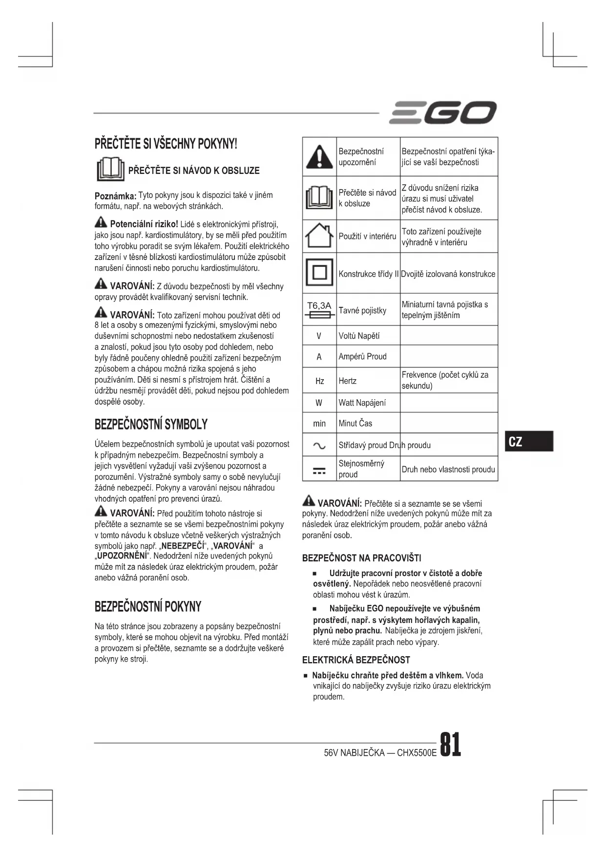 Tyto pouny uschovejte pro budouci pouziti. Tento navod obsahujedulezite bezpecnostni a provozni pouky pro 56V rychlonabijechu CHX5500E.