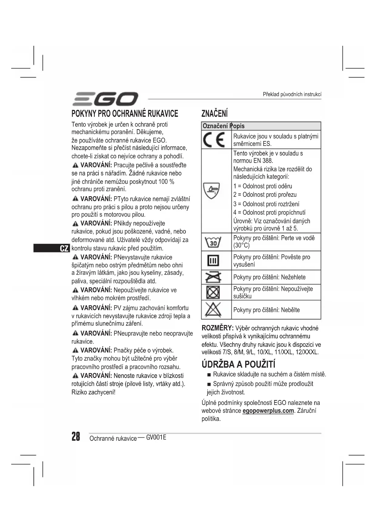■ Rukavice skladujte na suchém a čistém místě. ■ Správný způsob použití může prodloužit jejich životnost. Úplné podmínky společnosti EGO naleznete na webové stránce egopowerplus.com. Záruční politika. Překlad původních instrukcíCZ Ochranné rukavice — GV001E