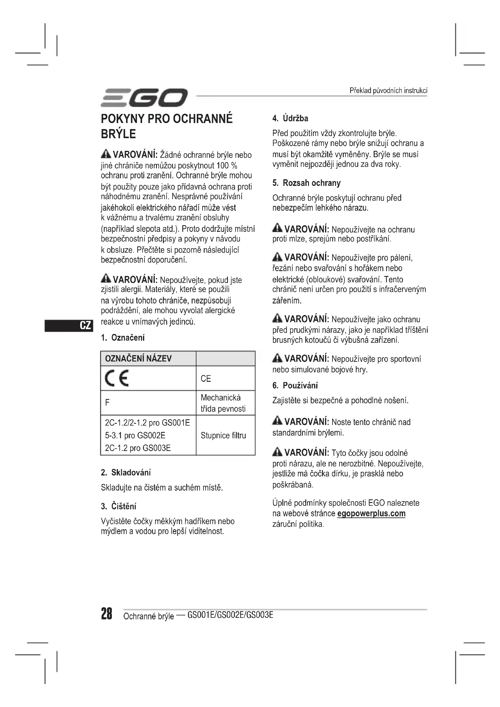 Zajistěte si bezpečné a pohodlné nošení. VAROVÁNÍ: Noste tento chránič nad standardními brýlemi. VAROVÁNÍ: Tyto čočky jsou odolné proti nárazu, ale ne nerozbitné. Nepoužívejte, jestliže má čočka dírku, je prasklá nebo poškrábaná. Úplné podmínky společnosti EGO naleznete na webové stránce egopowerplus.com záruční politika. Překlad původních instrukcíCZ Ochranné brýle — GS001E/GS002E/GS003E