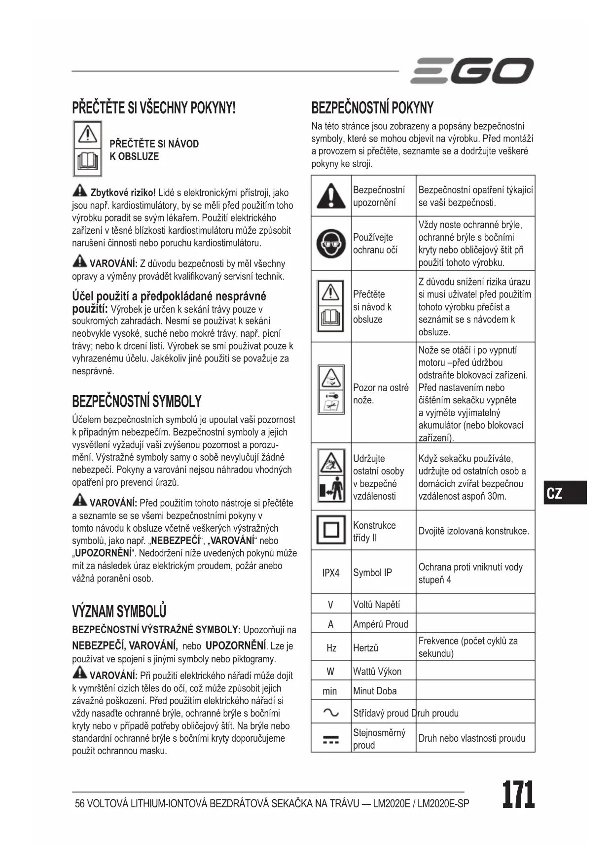 Na této stránce jsou zobrazeny a popsány bezpečnostní symboly, které se mohou objevit na výrobku. Před montáží a provozem si přečtěte, seznamte se a dodržujte veškeré pokyny ke stroji.Bezpečnostní upozorněníBezpečnostní opatření týkající se vaší bezpečnosti.Používejte ochranu očíVždy noste ochranné brýle, ochranné brýle s bočními kryty nebo obličejový štít při použití tohoto výrobku.Přečtěte si návod k obsluzeZ důvodu snížení rizika úrazu si musí uživatel před použitím tohoto výrobku přečíst a seznámit se s návodem k obsluze.Pozor na ostré nože.Nože se otáčí i po vypnutí motoru –před údržbou odstraňte blokovací zařízení. Před nastavením nebo čištěním sekačku vypněte a vyjměte vyjímatelný akumulátor (nebo blokovací zařízení).Udržujte ostatní osoby v bezpečné vzdálenostiKdyž sekačku používáte, udržujte od ostatních osob a domácích zvířat bezpečnou vzdálenost aspoň 30m.Konstrukce třídy IIDvojitě izolovaná konstrukce. IPX4 Symbol IPOchrana proti vniknutí vody stupeň 4 Voltů Napětí Ampérů Proud HertzůFrekvence (počet cyklů za sekundu) Wattů Výkon min Minut DobaStřídavý proud Druh prouduStejnosměrný proudDruh nebo vlastnosti proudu56 VOLTOVÁ LITHIUM-IONTOVÁ BEZDRÁTOVÁ SEKAČKA NA TRÁVU — LM2020E / LM2020E-SP172