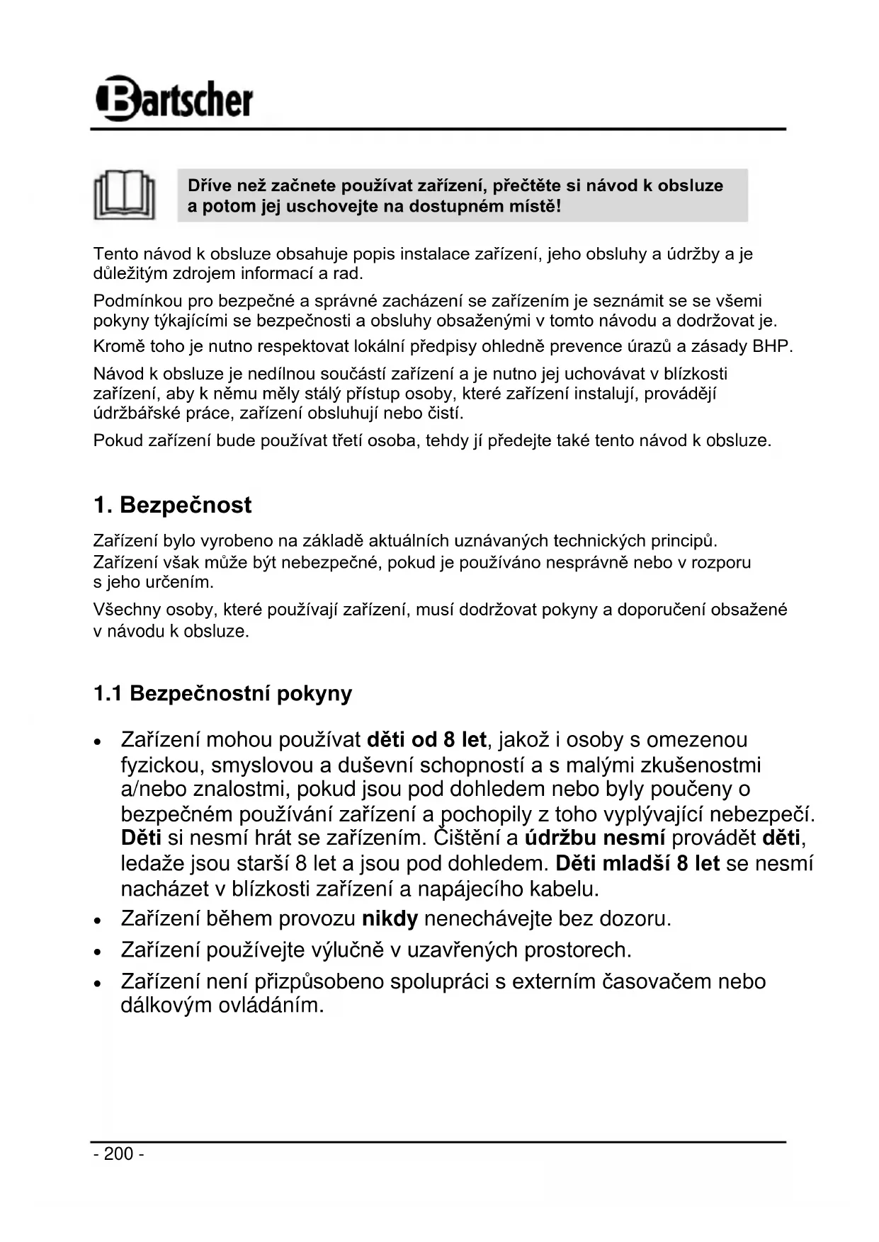 Zařízení mohou používat děti od 8 let, jakož i osoby s omezenou fyzickou, smyslovou a duševní schopností a s malými zkušenostmi a/nebo znalostmi, pokud jsou pod dohledem nebo byly poučeny o bezpečném používání zařízení a pochopily z toho vyplývající nebezpečí. Děti si nesmí hrát se zařízením. Čištění a údržbu nesmí provádět děti, ledaže jsou starší 8 let a jsou pod dohledem. Děti mladší 8 let se nesmí nacházet v blízkosti zařízení a napájecího kabelu. Zařízení během provozu nikdy nenechávejte bez dozoru. Zařízení používejte výlučně v uzavřených prostorech. Zařízení není přizpůsobeno spolupráci s externím časovačem nebo dálkovým ovládáním.- 201 -