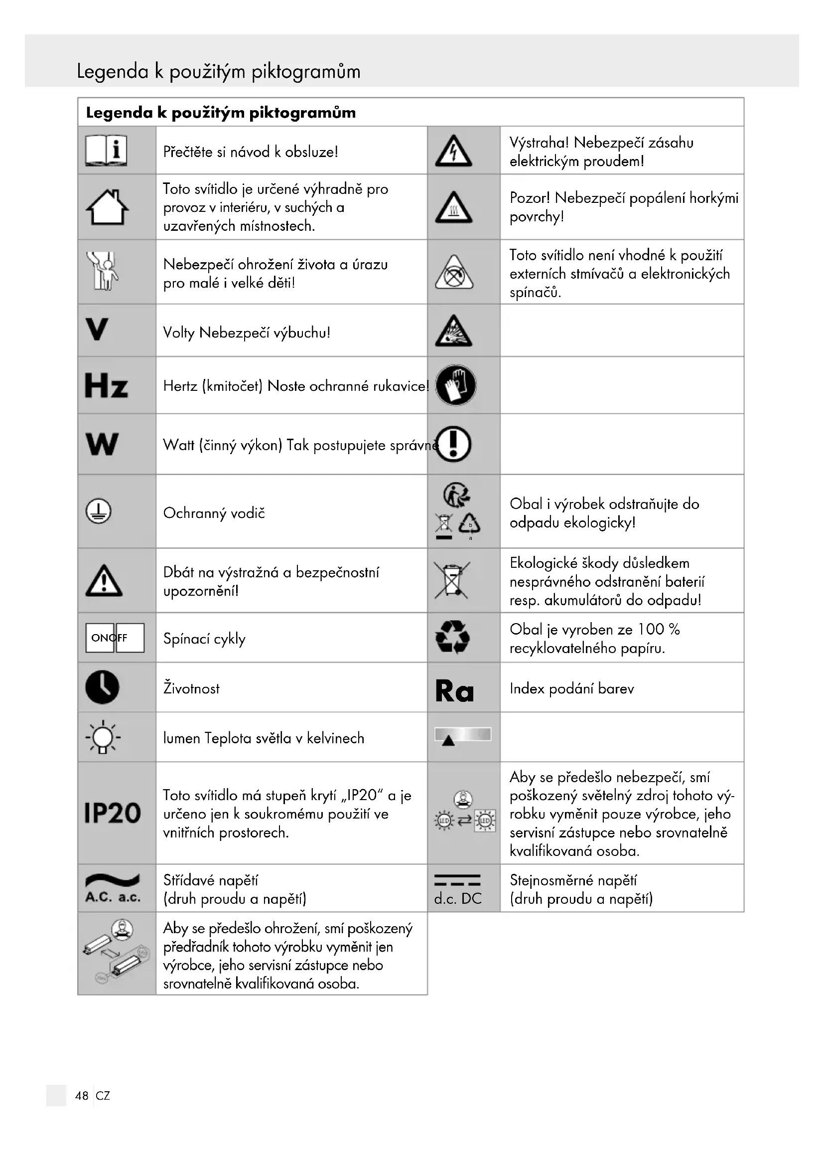 KÝMI POVRCHY! Nechte výrobek úplně vychladnout. Nepoužívejte žádná rozpouštědla, benzín apod. Svítidlo by se tím poškodilo. K čištění používejte jen suchou utěrku nepouštějící vlákna. Nasaďte zase pojistku nebo zapněte jistič vpojistkové skříni (do polohy I). Zlikvidování Obal se skládá zekologických materiálů, které mů- žete zlikvidovat prostřednictvím místních sběren re- cyklovatelných materiálů.