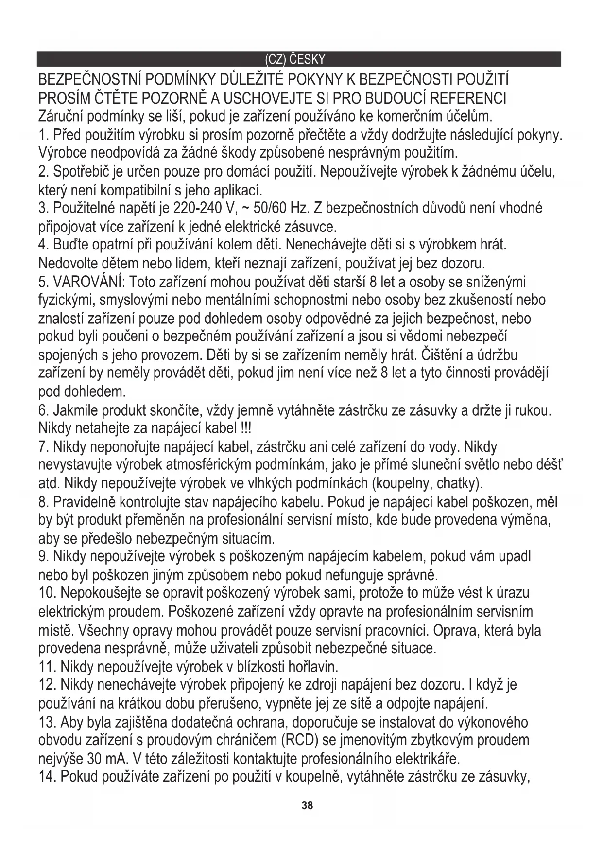 fyzickými, smyslovými nebo mentálními schopnostmi nebo osoby bez zkušeností nebo znalostí zařízení pouze pod dohledem osoby odpovědné za jejich bezpečnost, nebo pokud byli poučeni o bezpečném používání zařízení a jsou si vědomi nebezpečí spojených s jeho provozem. Děti by si se zařízením neměly hrát. Čištění a údržbu zařízení by neměly provádět děti, pokud jim není více než 8 let a tyto činnosti provádějí pod dohledem.