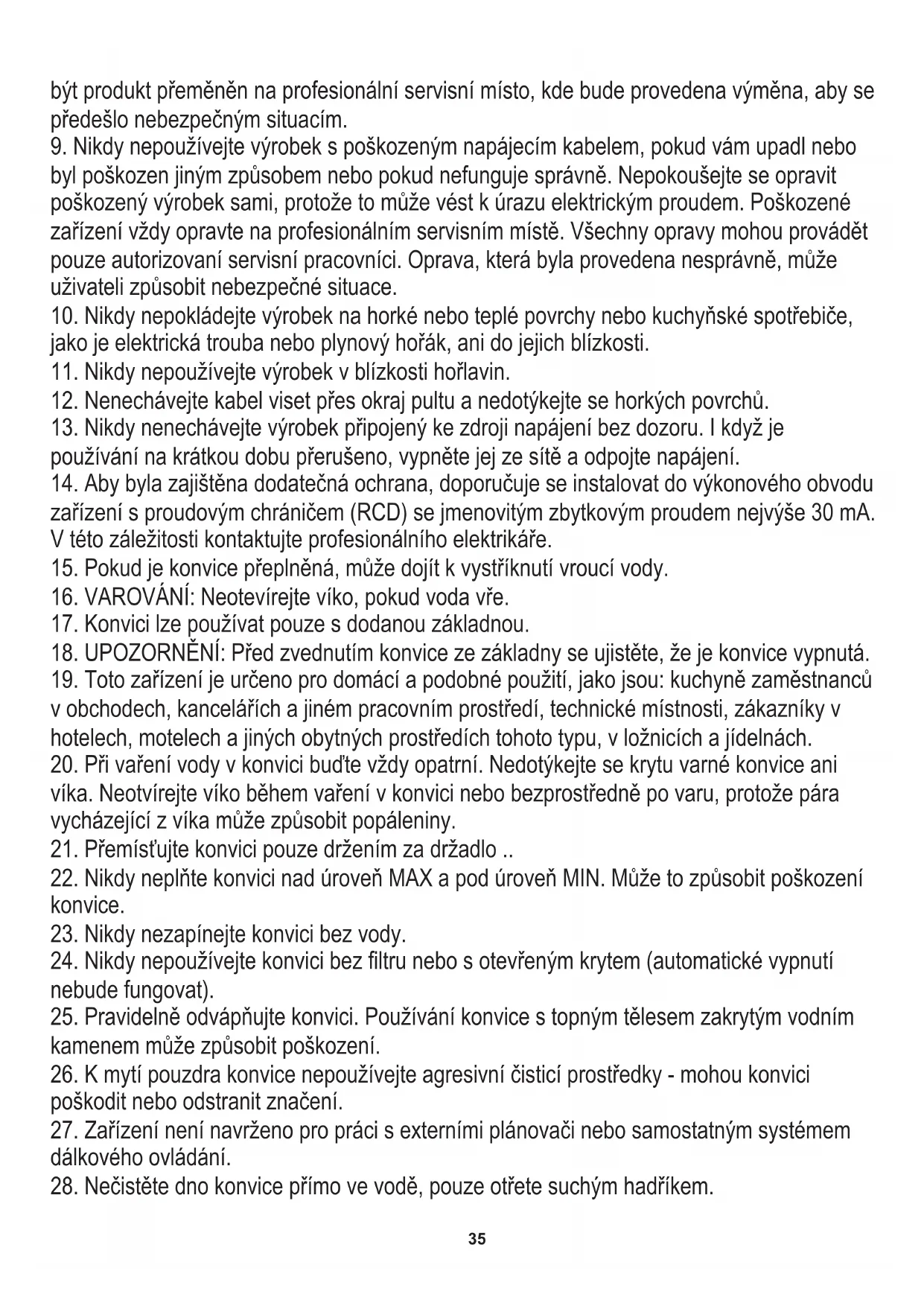 24. Nikdy nepoužívejte konvici bez filtru nebo s otevřeným krytem (automatické vypnutí