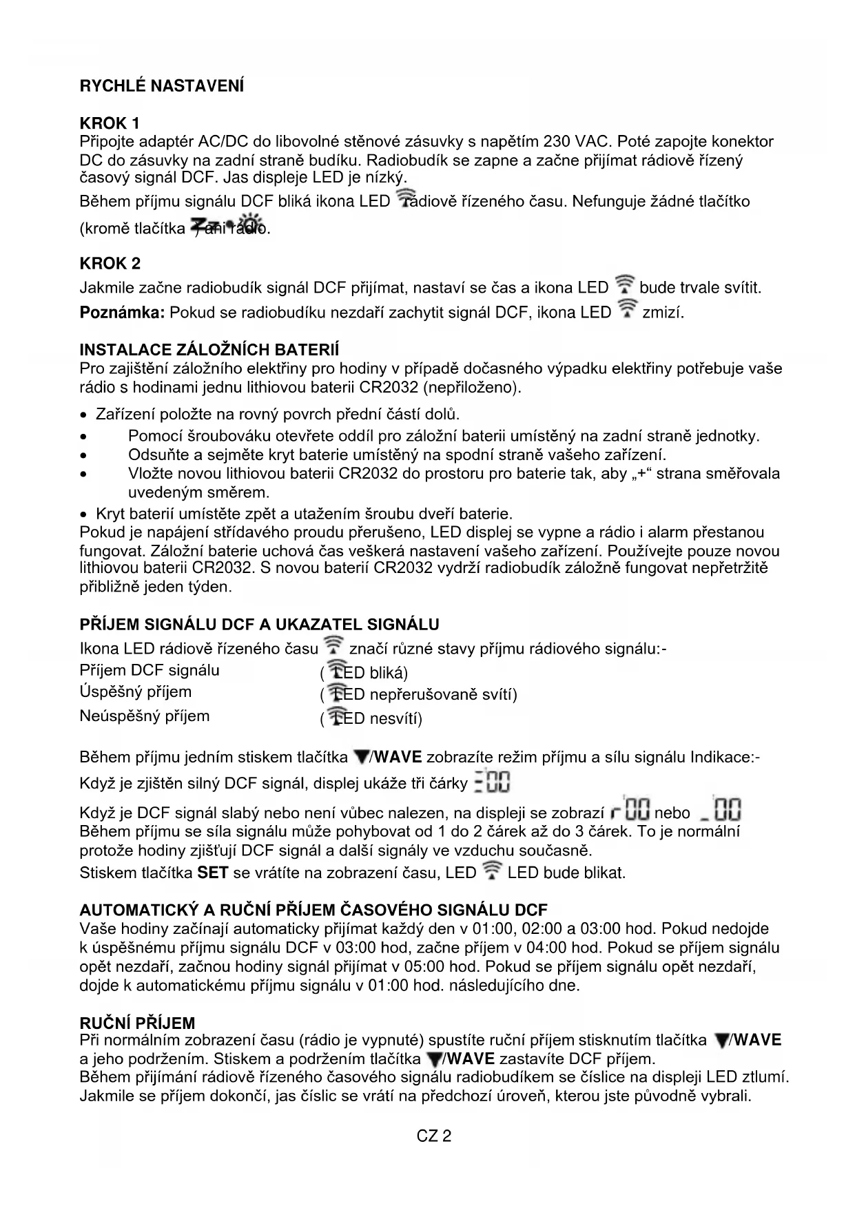 Pro zajištění záložního elektřiny pro hodiny v případě dočasného výpadku elektřiny potřebuje vaše rádio s hodinami jednu lithiovou baterii CR2032 (nepřiloženo). Zařízení položte na rovný povrch přední částí dolů. Pomocí šroubováku otevřete oddíl pro záložní baterii umístěný na zadní straně jednotky. Odsuňte a sejměte kryt baterie umístěný na spodní straně vašeho zařízení. Vložte novou lithiovou baterii CR2032 do prostoru pro baterie tak, aby „+“ strana směřovala uvedeným směrem. Kryt baterií umístěte zpět a utažením šroubu dveří baterie. Pokud je napájení střídavého proudu přerušeno, LED displej se vypne a rádio i alarm přestanou fungovat. Záložní baterie uchová čas veškerá nastavení vašeho zařízení. Používejte pouze novou lithiovou baterii CR2032. S novou baterií CR2032 vydrží radiobudík záložně fungovat nepřetržitě přibližně jeden týden. PŘÍJEM SIGNÁLU DCF A UKAZATEL SIGNÁLU Ikona LED rádiově řízeného času značí různé stavy příjmu rádiového signálu:- Příjem DCF signálu ( LED bliká) Úspěšný příjem ( LED nepřerušovaně svítí) Neúspěšný příjem ( LED nesvítí)