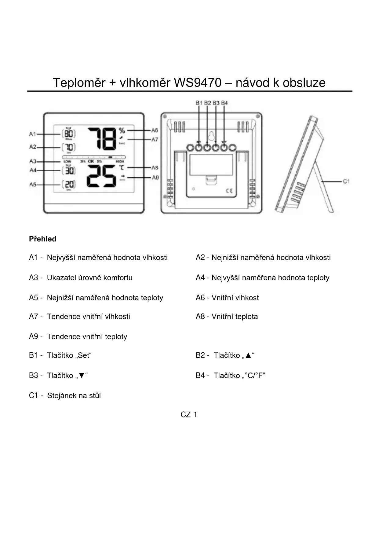 B1 - Tlačítko „Set“ B2 - Tlačítko „▲“ B3 - Tlačítko „▼“ B4 - Tlačítko „°C/°F“ C1 - Stojánek na stůlCZ 2 Začínáme Otevřete přihrádku na baterie. Vložte 2 ks 1,5V baterií AAA baterií tak, aby odpovídaly polaritě +/−, jak je uvedeno v přihrádce na baterie. Na displeji se zobrazí naměřená teplota a vlhkost. Opět zavřete přihrádku na baterie. Zobrazení teploty Stisknutím tlačítka °C/°F můžete přepínat mezi jednotkami teploty °C (stupně Celsia) nebo °F (stupně Fahrenheita). Ukazatel trendu Šipky ukazatele trendu ukazují, zda hodnoty teploty a vlhkosti právě rostou (šipka nahoru), zůstávají stálé (šipka do strany) nebo klesají (šipka dolů).CZ 3 Podmínky v místnosti Na displeji se objevuje značení označující úroveň komfortu v místnosti: Označení v blízkosti textu LOW znamená, že prostředí je příliš suché. Označení v blízkosti textu OK znamená, že prostředí je příjemné. Označení v blízkosti textu HIGH znamená, že prostředí je příliš vlhké. Maximální a minimální hodnoty Pro zobrazené nejvyšší a nejnižší hodnoty high a low teploty a vlhkosti se používají dva paměťové režimy. Stisknutím tlačítka ▲ nebo ▼ v normálním režimu zobrazíte režim zobrazení 24hrs nebo all-time maximálních a minimálních hodnot. Režim all-time: Ukládají se maximální a minimální hodnoty po dobu aktivace zařízení. Režim 24hrs: Maximální a minimální hodnoty se vynulují každých 24 hodin (od okamžiku aktivace).CZ 4 Ruční reset Stisknutím a podržením tlačítka ▲ v příslušném zobrazovacím režimu vymažete zaznamenané vysoké hodnoty. Stisknutím a podržením tlačítka ▼ v příslušném zobrazovacím režimu vymažete zaznamenané nízké odečty. Kalibrační funkce Teploměr + vlhkoměr umožňuje uživateli kalibrovat zobrazení měření teploty a vlhkosti pomocí externího, lepšího referenčního zdroje. Uživatel může provádět úpravy zobrazení teploty a vlhkosti na displeji v měřicím rozsahu. Při výměně baterií se kalibrované hodnoty automaticky vymažou.CZ 5 Kalibrace zobrazení vlhkosti a teploty Stiskněte a podržte tlačítko SET po dobu 3 sekund a ukazatel vlhkosti začne blikat. Stisknutím tlačítka ▲ nebo ▼ opravíte zobrazení vlhkosti. Na displeji se pod vlhkostí zobrazí text CALIBRATED. Potvrďte změny krátkým stisknutím tlačítka SET a ukazatel teploty začne blikat. Stisknutím tlačítka ▲ nebo ▼ opravíte zobrazení teploty. Na displeji se pod teplotou zobrazí text CALIBRATED. Potvrďte změny krátkým stisknutím tlačítka SET, a ukončete tak režim nastavení. Poznámka: Dokud hodnoty zůstávají kalibrovány, zobrazuje se na displeji text CALIBRATED. Ikona vybité baterie Baterie vyměňte, jakmile se na displeji objeví symbol baterie.CZ 6 Bezpečnostní opatření Toto zařízení je určeno k používání pouze ve vnitřních prostorách. Nevystavujte jednotku působení nadměrné síly ani otřesům. Nevystavujte jednotku extrémním teplotám, přímému slunečnímu svitu, prachu či vlhkosti. Neponořujte do vody. Vyhněte se kontaktu s jakýmkoliv korozivním materiálem. Nevhazujte jednotku do ohně, hrozí nebezpečí exploze. Neotevírejte vnitřní kryt a nemanipulujte s žádnými součástkami této jednotky. Bezpečnostní opatření u baterií Používejte pouze alkalické baterie, nikdy ne dobíjecí baterie. Vložte baterie se správnou polaritou (+/−). Vždy vyměňte kompletní sadu baterií. Nikdy nemíchejte dohromady použité a nové baterie. Slabé baterie okamžitě vyjměte. Jestliže zařízení nepoužíváte, vyjměte z něj baterie. Baterie nenabíjejte a nevhazujte je do ohně – mohou explodovat.CZ 7 Baterie skladujte mimo dosah kovových předmětů, kontakt s nimi může způsobit zkrat. Nevystavujte baterie extrémním teplotám, vlhkosti či přímému slunečnímu svitu. Veškeré baterie skladujte mimo dosah dětí. Hrozí riziko udušení. Výrobek používejte pouze k zamýšlenému účelu! Likvidace baterií podle předpisů Staré baterie nepatří do domovního odpadu, protože by mohly ohrožovat zdraví a poškodit životní prostředí. Použité baterie můžete zdarma vrátit prodejci a do sběrných míst. Jako koncoví uživatelé jste vázáni zákonem použité baterie vrátit distributorům a do jiných sběrných míst! Povinnosti dle zákona o elektrických zařízeních Tento symbol znamená, že po ukončení životnosti elektrického zařízení je nutno jej likvidovat odděleně od běžného domovního odpadu. Zařízení vraťte do místního sběrného místa nebo centra pro recyklaci. To platí pro všechny země Evropské unie a ostatní evropské země se samostatným systémem shromažďování odpadu.PL 1 Instrukcja obsługi termometru-higrometru WS9470 Przegląd A1 - Najwyższa zmierzona wartość wilgotności A2 - Najniższa zmierzona wartość wilgotności A3 - Wskaźnik poziomu komfortu A4 - Najwyższa zmierzona wartość temperatury A5 - Najniższa zmierzona wartość temperatury A6 - Wilgotność wewnątrz A7 - Tendencja wilgotności wewnątrz A8 - Temperatura wewnętrzna A9 - Tendencja temperatury wewnątrzPL 2 B1 - Przycisk „Set” B2 - Przycisk „▲” B3 - Przycisk „▼” B4 - Przycisk „°C/°F” C1 - Podstawka
