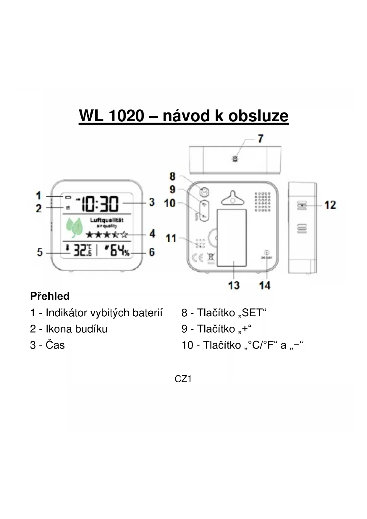 Podsvícení a barevná signalizace: Pokud používáte baterie, je podsvícení vypnuto. Pokud používáte adaptér USB, je podsvícení zapnuto. Pro úpravu jasu podsvícení stiskněte tlačítko „LICHT“: vysoký jas – střední jas – nízký jas – podsvícení vypnuto. Pokud používáte adaptér USB, změní se barva podsvícení na žlutou v případě, že senzor kvality vzduchu zjistí hodnotu 1 401 ppm ek anebo vyšší, a na červenou se změní v případě, že senzor zjistí hodnotu 1 801 ppm ek anebo vyšší.CZ12 Kalibrace senzorů TVOC a CO2: Senzor je automaticky továrně nakalibrován a je tedy možné jej okamžitě použít. Doporučujeme tuto variantu použití. Také je možná manuální kalibrace. Manuální kalibrace: Při použití adaptéru stiskněte a podržte tlačítko „+“ po dobu 3 sekund a poté stiskněte tlačítko „SET“ k potvrzení operace kalibrace (střídavě se zobrazuje hlášení „CAL“ a zobrazení času). Senzor bude nakalibrován po uplynutí 2 hodin. Spusťte prosím kalibraci v neznečištěném a ventilovaném prostředí. (Při kalibraci otevřete okno k zajištění ventilace.) Kalibrace bude ukončena v případě, že při procesu napájení dojde k odpojení napájení stejnosměrným proudem.CZ13 Doporučujeme opakovat manuální kalibraci každé 1–2 týdny. Obnovení parametrů tovární kalibrace: Pokud chcete obnovit parametry tovární kalibrace, stiskněte a podržte tlačítko „−“. Jakmile se na displeji LCD zobrazí hlášení „RES“, stiskněte k potvrzení tlačítko „SET“. Poté dojde k obnovení továrních kalibračních parametrů. Řešení problémů: Nedotýkejte se senzoru ani výrobek neskladujte v balicích materiálech se silným aroma, aby nedošlo k ovlivnění přesnosti senzoru. Budík WL 1020 byste neměli nechat po delší dobu umístěnou ve znečištěném prostředí (např. v uzavřené krabici, kontaminovaném prostředí).CZ14 Před tím, než začnete budík WL 1020 používat, měli byste jej nechat pracovat po dobu delší než 1 hodinu v dobře ventilované místnosti, abyste tím umožnili přesné odečty. Indikátor slabých baterií: Indikátor slabých baterií „ “ se zobrazí ve chvíli, kdy bude mít monitorovací zařízení slabé baterie. Baterie v monitorovacím zařízení by měly být vhodným způsobem vyměněny za nové. Při výměně baterií můžete k napájení monitorovacího zařízení použít adaptér USB, abyste nepřišli o dříve navolená nastavení.CZ15 Prohlášení o shodě My, společnost Technotrade, tímto prohlašujeme, že výrobek WL 1020 splňuje základní požadavky a další příslušná ustanovení směrnice 2014/53/EU a ROHS 2011/65/ES. Originál prohlášení o shodě EU lze nalézt na webu: www.technoline.de/doc/4029665210209 Technické údaje výrobku Rozsah měření vlhkosti: 10–95 % Rozlišení vlhkosti: 1% Rozsah měření teploty: −9,9 až 50 °C, nižší než −9,9 °C zobrazuje LL, vyšší než 50 °C zobrazuje HH. Teplotní rozlišení: 0,1 °C Rozsah detekce TVOC: 0–9,999 mg/m3 CO2 ek rozsah detekce: 400–9 999 ppmCZ16 Bezpečnostní opatření Tento výrobek je určen výhradně k použití ve vnitřních prostorách. Nevystavujte výrobek nadměrné síle nebo otřesům. Nevystavujte výrobek extrémním teplotám, přímému slunečnímu svitu, prachu nebo vlhkosti. Neponořujte do vody. Vyhněte se kontaktu s jakýmkoliv korozivním materiálem. Nelikvidujte výrobek v ohni, protože může explodovat. Neotvírejte vnitřní zadní kryt ani neměňte žádné součásti výrobku. Bezpečnostní opatření u baterií Používejte pouze alkalické baterie, nikdy ne dobíjecí baterie. Vložte baterie se správnou polaritou (+/−).CZ17 Vždy vyměňte kompletní sadu baterií. Nikdy nemíchejte dohromady použité a nové baterie. Slabé baterie okamžitě vyjměte. Jestliže zařízení nepoužíváte, vyjměte z něj baterie. Baterie nenabíjejte a nevhazujte je do ohně – mohou explodovat. Baterie skladujte mimo dosah kovových předmětů, kontakt s nimi může způsobit zkrat. Nevystavujte baterie extrémním teplotám, vlhkosti či přímému slunečnímu svitu. Veškeré baterie skladujte mimo dosah dětí. Hrozí riziko udušení. Výrobek používejte pouze k zamýšlenému účelu!CZ18 Likvidace baterií podle předpisů Staré baterie nepatří do domovního odpadu, protože by mohly ohrožovat zdraví a poškodit životní prostředí. Použité baterie můžete zdarma vrátit prodejci a do sběrných míst. Jako koncoví uživatelé jste vázáni zákonem použité baterie vrátit distributorům a do jiných sběrných míst! Povinnosti dle zákona o elektrických zařízeních Tento symbol znamená, že po ukončení životnosti elektrického zařízení je nutno jej likvidovat odděleně od běžného domovního odpadu. Odvezte výrobek do místního sběrného místa nebo recyklačního centra. To platí pro všechny země Evropské unie a ostatní evropské země se samostatným systémem shromažďování odpadu.PL1 Instrukcja użycia urządzenia WL 1020 Informacje ogólne 1 – wskaźnik niskiego poziomu naładowania baterii 8 – przycisk „SET” 2 – ikona alarmu 9 – przycisk „+” 3 – godzina 10 – przycisk „°C/°F” i „-”PL2 4 – wyświetlacz jakości powietrza (ikony gwiazdek) 11 – czujnik temperatury i wilgotności 5 – temperatura w pomieszczeniu 12 – czujnik TVOC 6 – wilgotność w pomieszczeniu 13 – pokrywa komory baterii 7 – przycisk „LICHT” 14 – złącze zasilania