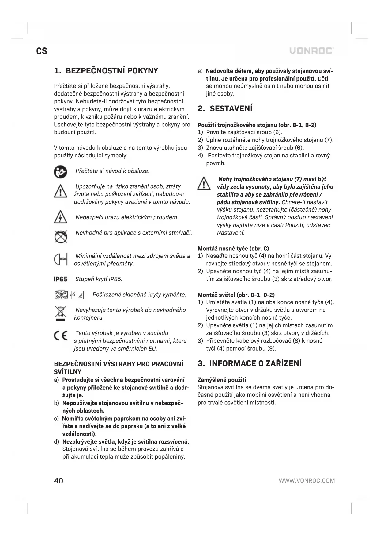 SVÍTILNY a) Prostudujte si všechna bezpečnostní varování a pokyny přiložené ke stojanové svítilně a dodr- žujte je. b) Nepoužívejte stojanovou svítilnu v nebezpeč- ných oblastech. c) Nemiřte světelným paprskem na osoby ani zví- řata a nedívejte se do paprsku (a to ani z velké vzdálenosti). d) Nezakrývejte světla, když je svítilna rozsvícená. Stojanová svítilna se během provozu zahřívá a při akumulaci tepla může způsobit popáleniny. e) Nedovolte dětem, aby používaly stojanovou sví- tilnu. Je určena pro profesionální použití. Děti se mohou neúmyslně oslnit nebo mohou oslnit jiné osoby.