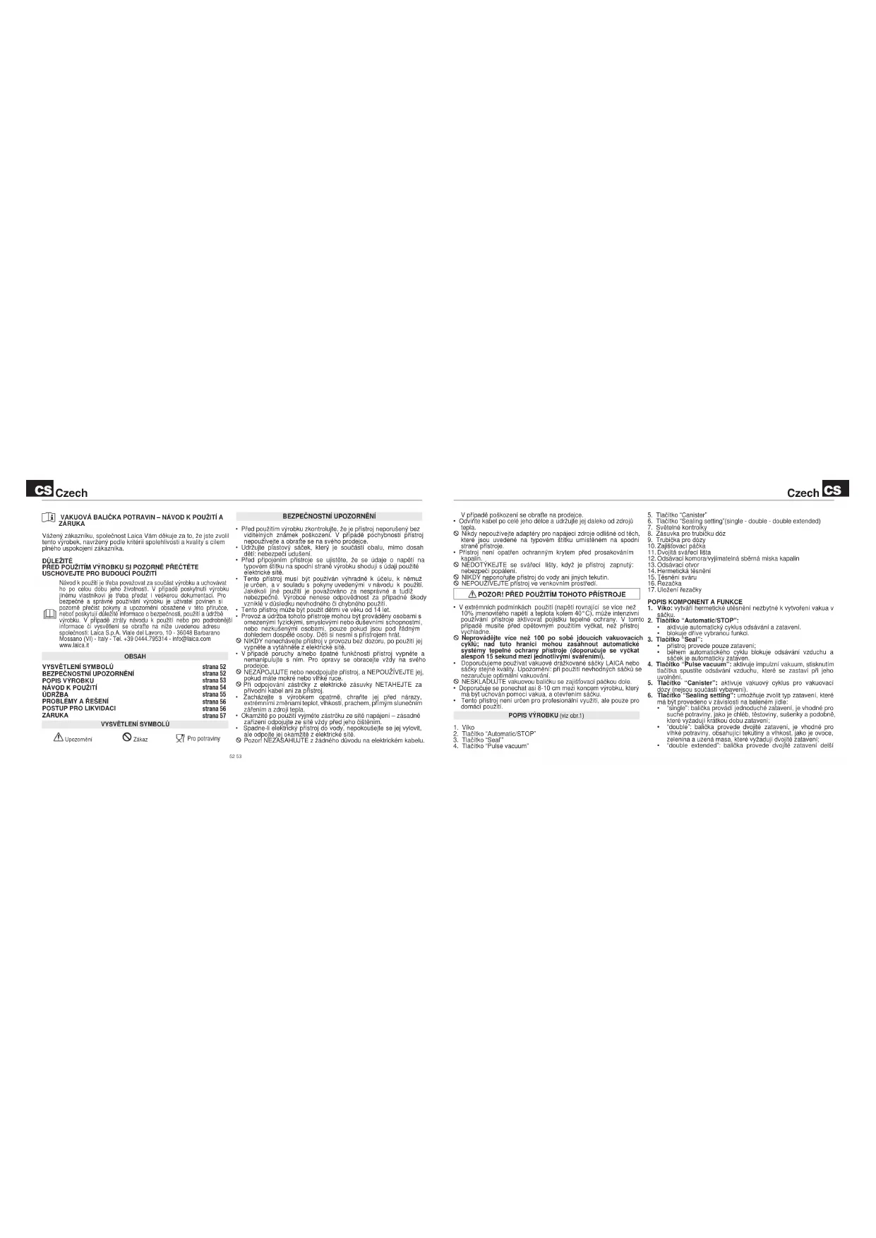 Română52 53 VAKUOVÁ BALIČKA POTRAVIN – NÁVOD K POUŽITÍ A ZÁRUKA Vážený zákazníku, společnost Laica Vám děkuje za to, že jste zvolil tento výrobek, navržený podle kritérií spolehlivosti a kvality s cílem plného uspokojení zákazníka.