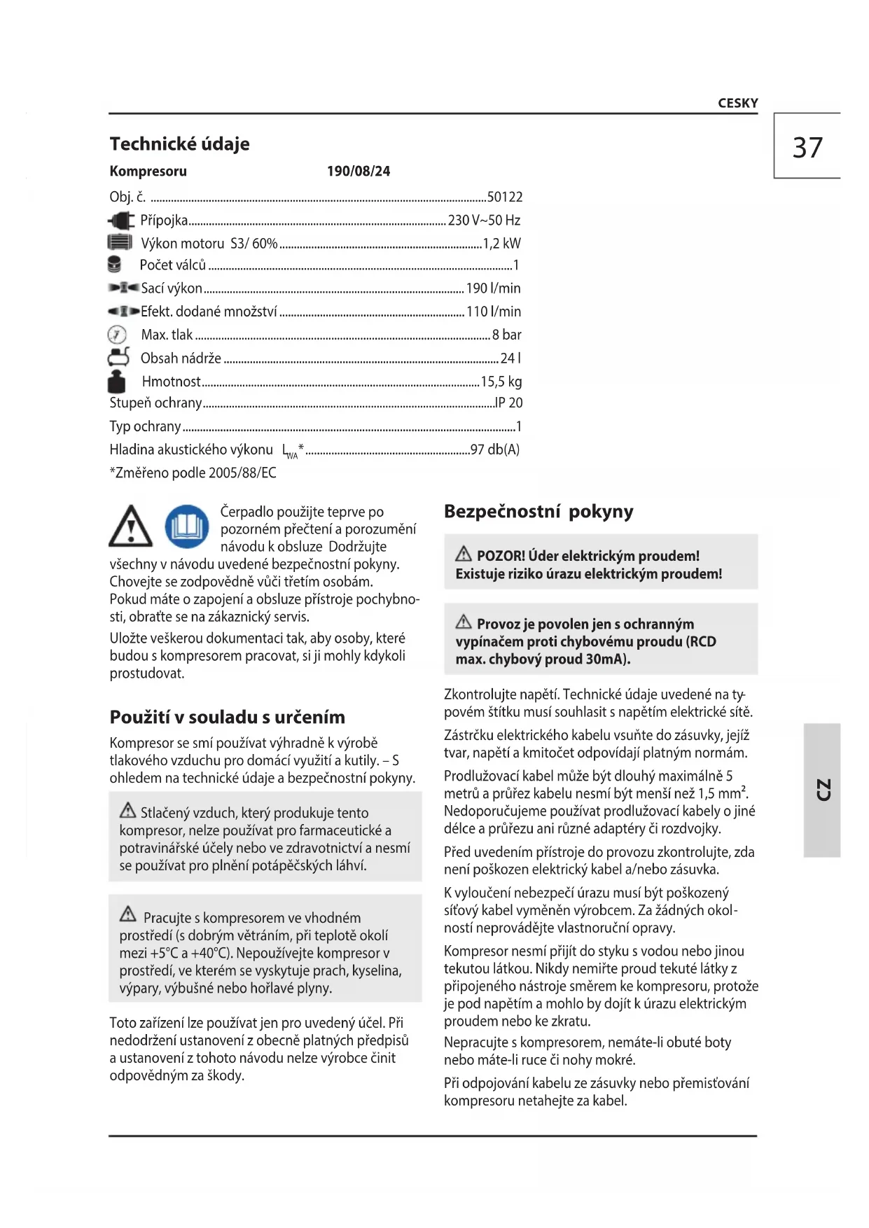ností neprovádějte vlastnoruční opravy. Kompresor nesmí přijít do styku s vodou nebo jinou tekutou látkou. Nikdy nemiřte proud tekuté látky z připojeného nástroje směrem ke kompresoru, protože je pod napětím a mohlo by dojít k úrazu elektrickým proudem nebo ke zkratu. Nepracujte s kompresorem, nemáte-li obuté boty nebo máte-li ruce či nohy mokré. Při odpojování kabelu ze zásuvky nebo přemisťování kompresoru netahejte za kabel. Technické údaje Kompresoru 190/08/2438 teploty, tato ochrana by automaticky přerušila přívod elektrického proudu. Po návratu na normální teplotu se motor spustí automaticky. Pozor! Kompresor nikdy nezapínejte resp. nevypínejte pomocí zástrčky. Vždy stiskněte tlakový spínač. Kompresor nenechávejte zapnutý přes noc, mohl by se stát zdrojem nebezpečí. Na konci pracovního dne vypněte vždy na zapínači/ vypínači, vypusťte vzdušník a kompresor odpojte ze sítě. Pozor: nevypuštěná kondenzovaná voda může být příčinou koroze uvnitř nádrže a omezit tak její výkonnost a ohrozit bezpečnost. Nenechávejte kompresor vystavený atmosférickým vlivům (déšť, slunce, mlha, sníh). Pokud budete kompresor používat venku, nezapomeňte je po použití vždy uložit na kryté nebo uzavřené místo. Kompresor nikdy nepoužívejte venku v dešti nebo za jiných nepříznivých meteorologických podmínek. Do blízkosti kompresoru nebo na kompresor nepo