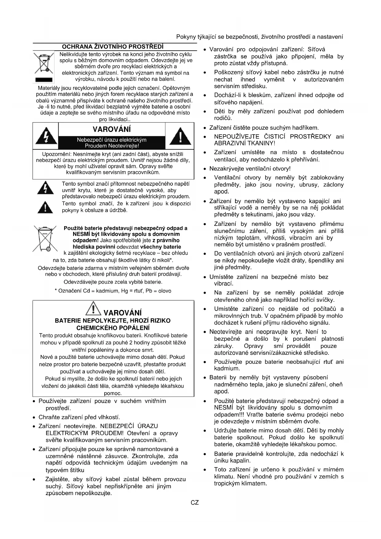 - Používejte pouze baterie neobsahující rtuť ani kadmium.