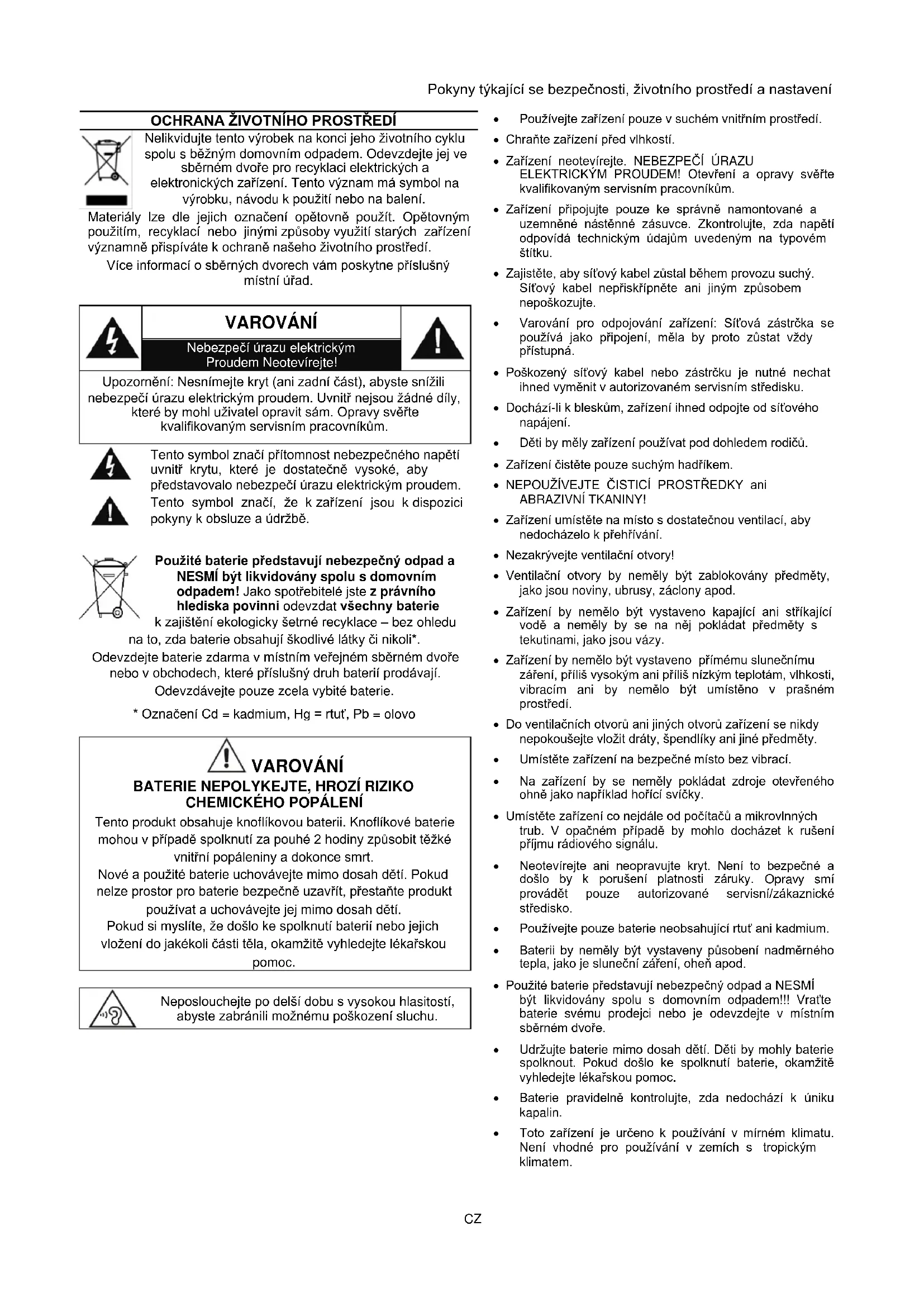 Používejte zařízení pouze v suchém vnitřním prostředí. Chraňte zařízení před vlhkostí. Zařízení neotevírejte. NEBEZPEČÍ ÚRAZU ELEKTRICKÝM PROUDEM! Otevření a opravy svěřte kvalifikovaným servisním pracovníkům. Zařízení připojujte pouze ke správně namontované a uzemněné nástěnné zásuvce. Zkontrolujte, zda napětí odpovídá technickým údajům uvedeným na typovém štítku. Zajistěte, aby síťový kabel zůstal během provozu suchý. Síťový kabel nepřiskřípněte ani jiným způsobem nepoškozujte. Varování pro odpojování zařízení: Síťová zástrčka se používá jako připojení, měla by proto zůstat vždy přístupná. Poškozený síťový kabel nebo zástrčku je nutné nechat ihned vyměnit v autorizovaném servisním středisku. Dochází-li k bleskům, zařízení ihned odpojte od síťového napájení. Děti by měly zařízení používat pod dohledem rodičů. Zařízení čistěte pouze suchým hadříkem. NEPOUŽÍVEJTE ČISTICÍ PROSTŘEDKY ani ABRAZIVNÍ TKANINY! Zařízení umístěte na místo s dostatečnou ventilací, aby nedocházelo k přehřívání. Nezakrývejte ventilační otvory! Ventilační otvory by neměly být zablokovány předměty, jako jsou noviny, ubrusy, záclony apod. Zařízení by nemělo být vystaveno kapající ani stříkající vodě a neměly by se na něj pokládat předměty s tekutinami, jako jsou vázy. Zařízení by nemělo být vystaveno přímému slunečnímu záření, příliš vysokým ani příliš nízkým teplotám, vlhkosti, vibracím ani by nemělo být umístěno v prašném prostředí. Do ventilačních otvorů ani jiných otvorů zařízení se nikdy nepokoušejte vložit dráty, špendlíky ani jiné předměty. Umístěte zařízení na bezpečné místo bez vibrací. Na zařízení by se neměly pokládat zdroje otevřeného ohně jako například hořící svíčky. Umístěte zařízení co nejdále od počítačů a mikrovlnných trub. V opačném případě by mohlo docházet k rušení příjmu rádiového signálu. Neotevírejte ani neopravujte kryt. Není to bezpečné a došlo by k porušení platnosti záruky. Opravy smí provádět pouze autorizované servisní/zákaznické středisko. Používejte pouze baterie neobsahující rtuť ani kadmium. Baterii by neměly být vystaveny působení nadměrného tepla, jako je sluneční záření, oheň apod. Použité baterie představují nebezpečný odpad a NESMÍ být likvidovány spolu s domovním odpadem!!! Vraťte baterie svému prodejci nebo je odevzdejte v místním sběrném dvoře. Udržujte baterie mimo dosah dětí. Děti by mohly baterie spolknout. Pokud došlo ke spolknutí baterie, okamžitě vyhledejte lékařskou pomoc. Baterie pravidelně kontrolujte, zda nedochází k úniku kapalin. Toto zařízení je určeno k používání v mírném klimatu. Není vhodné pro používání v zemích s tropickým klimatem.DAB165 / Český návod k použití