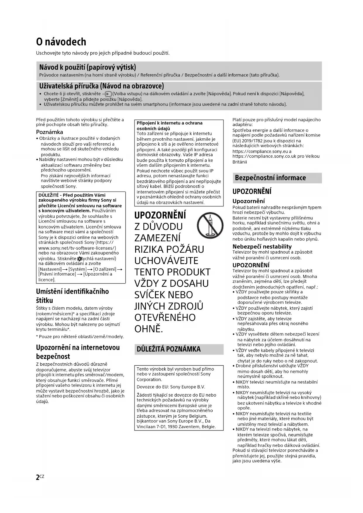OHNĚ. Platí pouze pro příslušný model napájecího adaptéru:Spotřeba energie a další informace o napájení podle požadavků nařízení komise (EU) 2019/1782 jsou k dispozici na následujících webových stránkách: https://compliance.sony.eu a https://compliance.sony.co.uk pro Velkou Británii UPOZORNĚNÍ Upozornění Pokud baterii nahradíte nesprávným typem hrozí nebezpečí výbuchu.Baterie nesmí být vystaveny přílišnému horku, například slunečnímu světlu, ohni a podobně, ani extrémně nízkému tlaku vzduchu, protože by mohlo dojít k výbuchu nebo úniku hořlavých kapalin nebo plynů. Nebezpečí nestability Televizor by mohl spadnout a způsobit vážné poranění či usmrcení osob. UPOZORNĚNÍ Televizor by mohl spadnout a způsobit vážné poranění či usmrcení osob. Mnoha zraněním, zejména dětí, lze předejít dodržením jednoduchých opatření, např.:• VŽDY používejte pouze skříňky a podstavce nebo postupy montáže doporučené výrobcem televize.• VŽDY používejte nábytek, který zajistí bezpečnou oporu televize.• VŽDY zajistěte, aby televize nepřesahovala přes okraj nosného nábytku.• VŽDY vysvětlete dětem nebezpečí lezení na nábytek za účelem dosáhnutí na televizi nebo jejího ovládání.• VŽDY veďte kabely připojené k televizi tak, aby nebylo možné za ně tahat, chytat je do ruky nebo o ně zakopnout.• Drobné příslušenství udržujte VŽDY mimo dosah dětí, aby ho nemohly neúmyslně spolknout.• NIKDY televizi neumísťujte na nestabilní místo.• NIKDY neumísťujte televizi na vysoký nábytek (například skříně nebo knihovny) bez ukotvení nábytku a televize k vhodné opoře.• NIKDY neumísťujte televizi na textilie nebo jiné materiály, které mohou být umístěny mezi televizí a nábytkem.• NIKDY na televizi nebo nábytek, na kterém televize spočívá, neumísťujte předměty, které mohou lákat děti, například hračky nebo dálková ovládání.Pokud si stávající televizor ponecháváte a přemísťujete jej, použijte stejná pravidla, jako jsou uvedena výše. O návodech Uschovejte tyto návody pro jejich případné budoucí použití. Návod k použití (papírový výtisk) Průvodce nastavením (na horní straně výrobku) / Referenční příručka / Bezpečnostní a další informace (tato příručka). Uživatelská příručka (Návod na obrazovce)