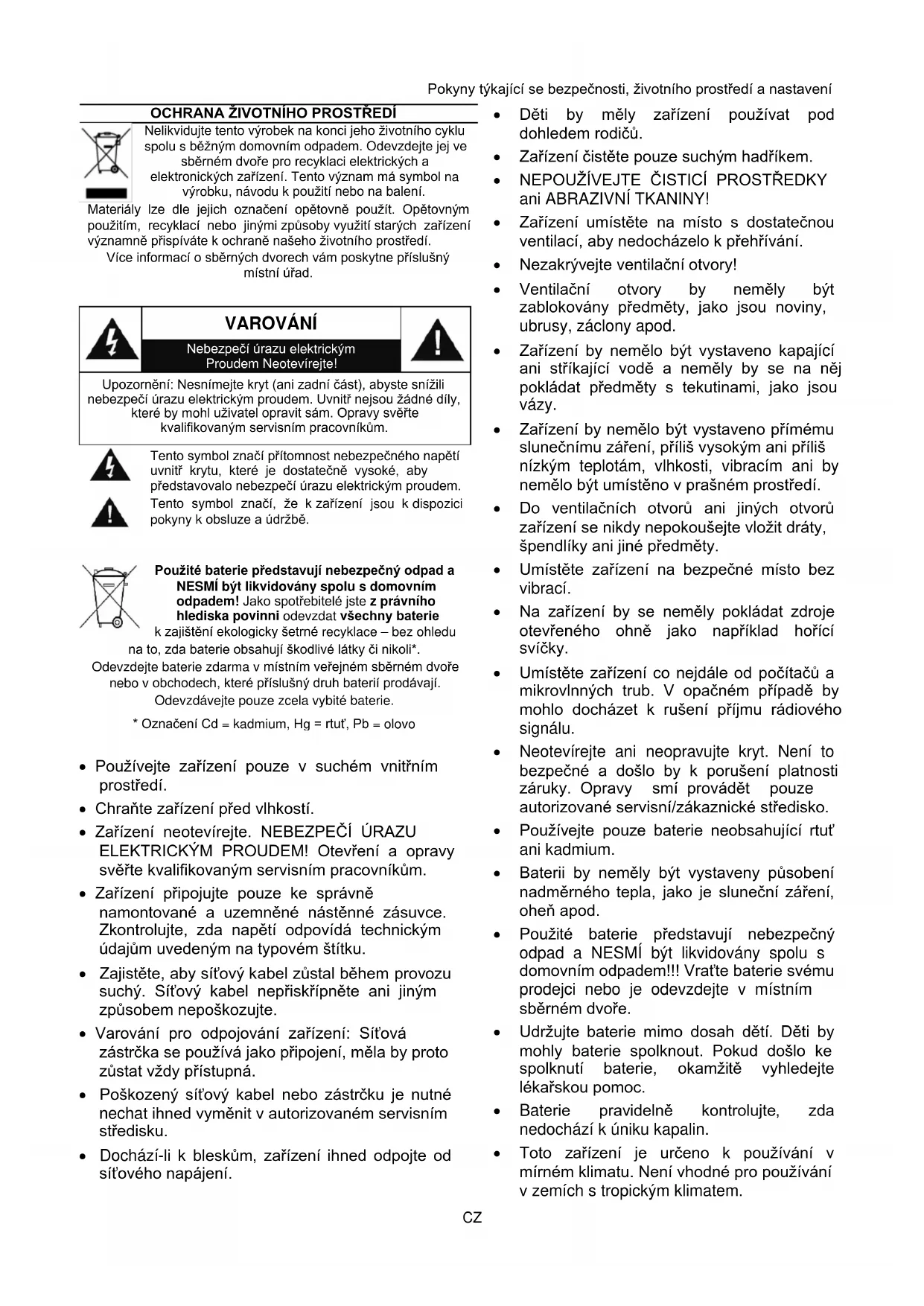 Používejte zařízení pouze v suchém vnitřním prostředí. Chraňte zařízení před vlhkostí. Zařízení neotevírejte. NEBEZPEČÍ ÚRAZU ELEKTRICKÝM PROUDEM! Otevření a opravy svěřte kvalifikovaným servisním pracovníkům. Zařízení připojujte pouze ke správně namontované a uzemněné nástěnné zásuvce. Zkontrolujte, zda napětí odpovídá technickým údajům uvedeným na typovém štítku. Zajistěte, aby síťový kabel zůstal během provozu suchý. Síťový kabel nepřiskřípněte ani jiným způsobem nepoškozujte. Varování pro odpojování zařízení: Síťová zástrčka se používá jako připojení, měla by proto zůstat vždy přístupná. Poškozený síťový kabel nebo zástrčku je nutné nechat ihned vyměnit v autorizovaném servisním středisku. Dochází-li k bleskům, zařízení ihned odpojte od síťového napájení. Děti by měly zařízení používat pod dohledem rodičů. Zařízení čistěte pouze suchým hadříkem.